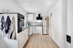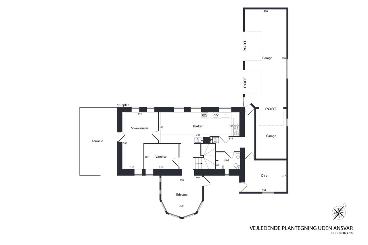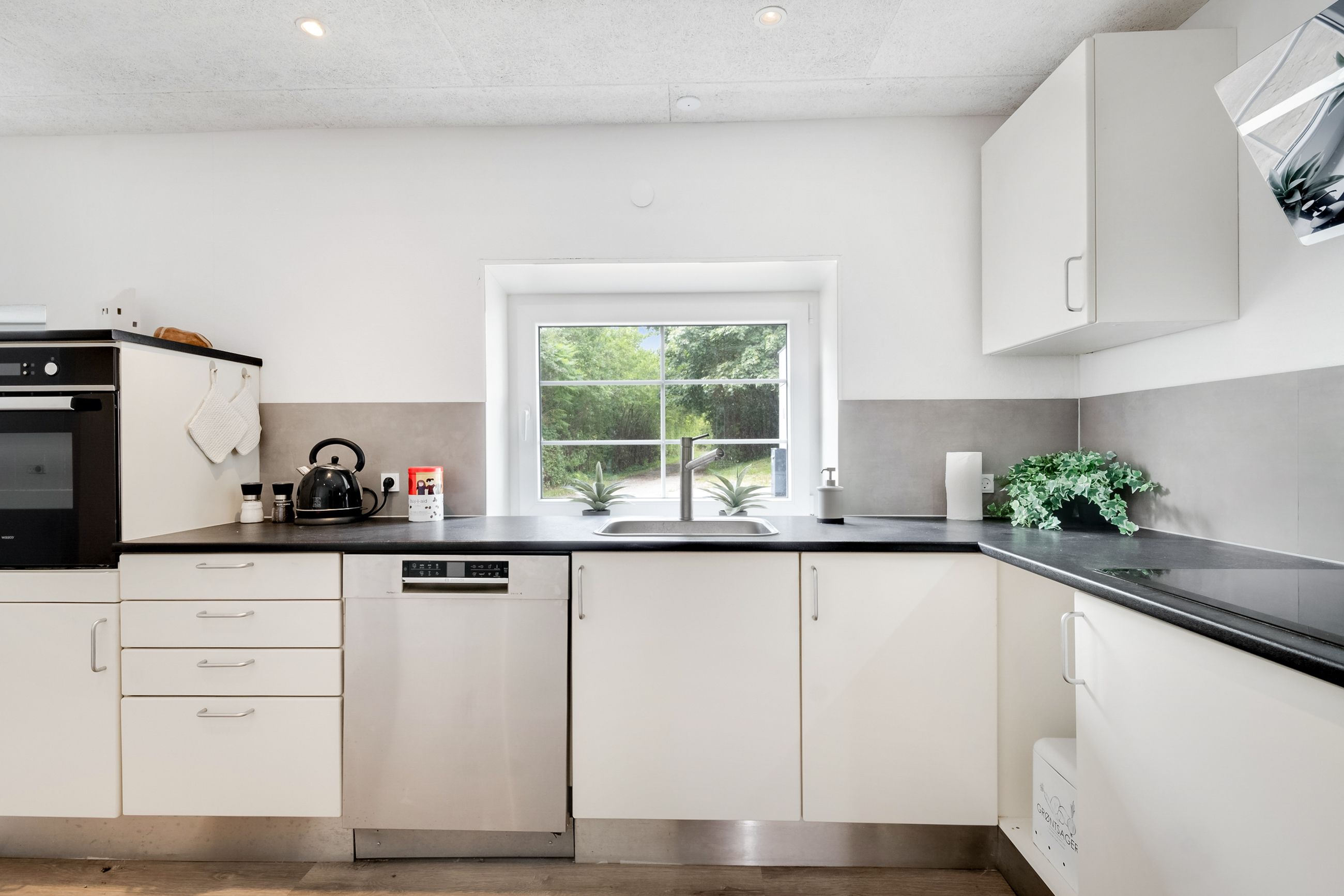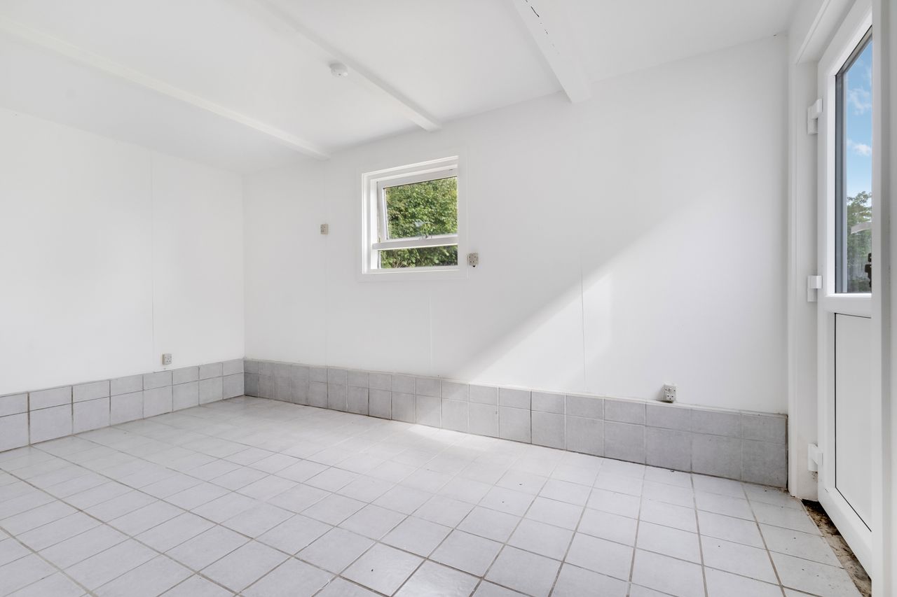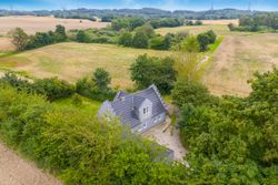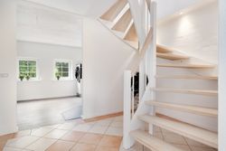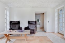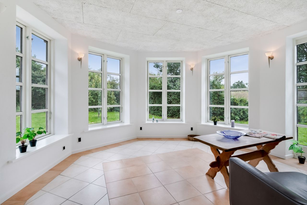 Køkkenalrummet ligger til højre, med hvide fronter, flotte nyere gulve med gulvvarme, lofter med spots og en ovn i god arbejdshøjde. Her er god plads til spiseafdeling, og en brændeovn sikrer hygge og varme på køligere dage. Fra køkkenet er der udgang til en skøn, buet udestue med store vinduer, klinkegulv og gulvarme. Udestuen kan bruges året rundt og har direkte adgang til haven.