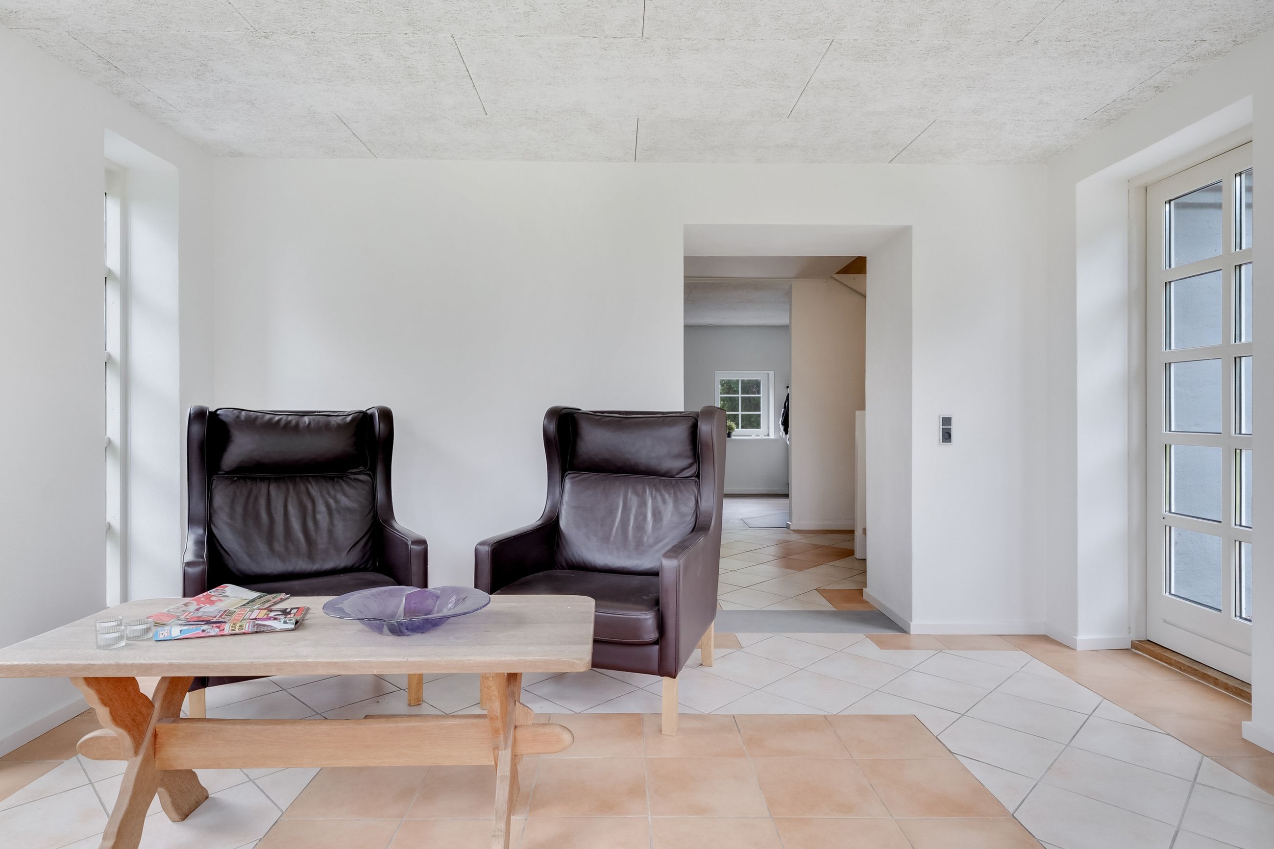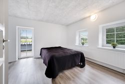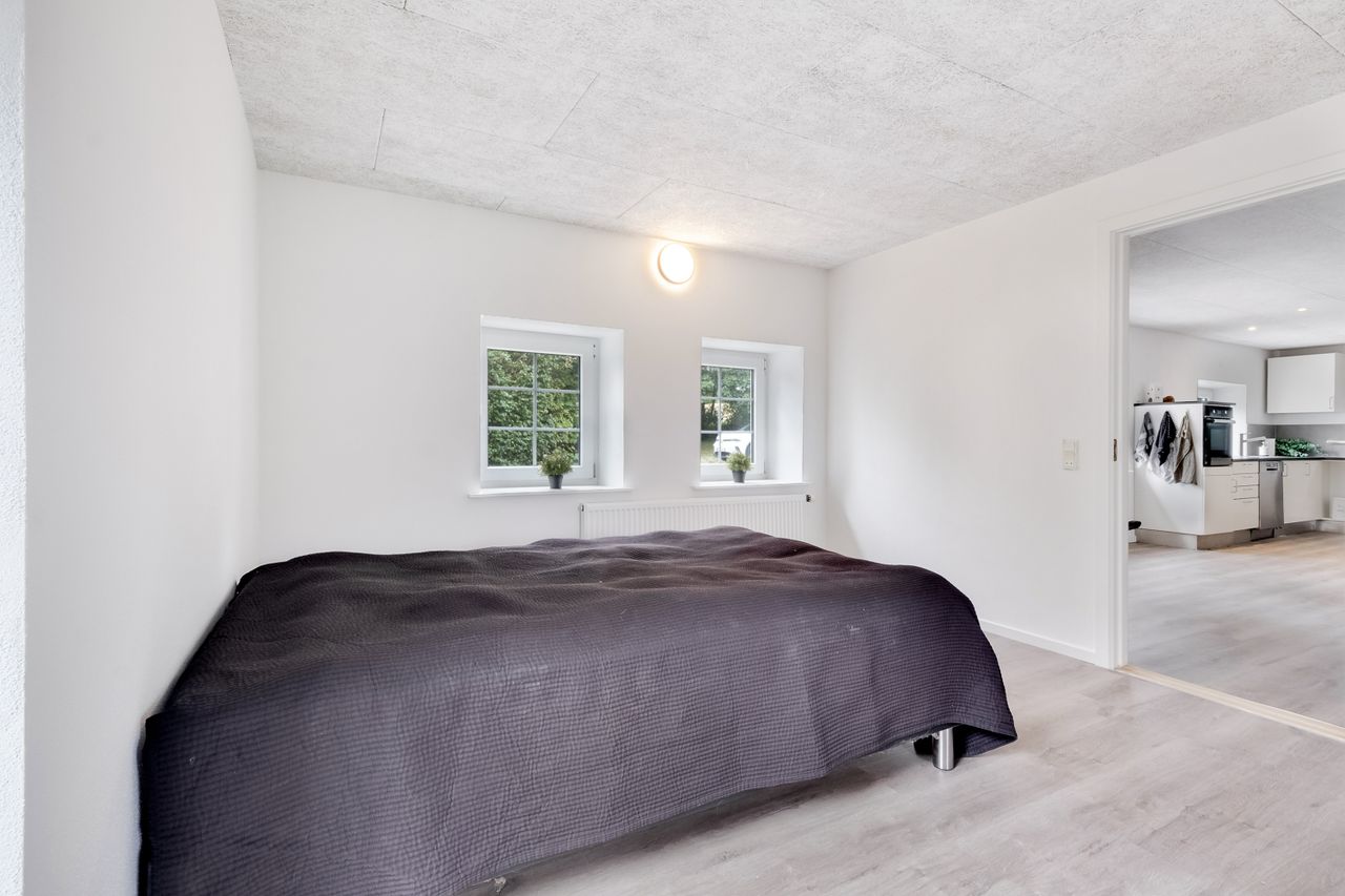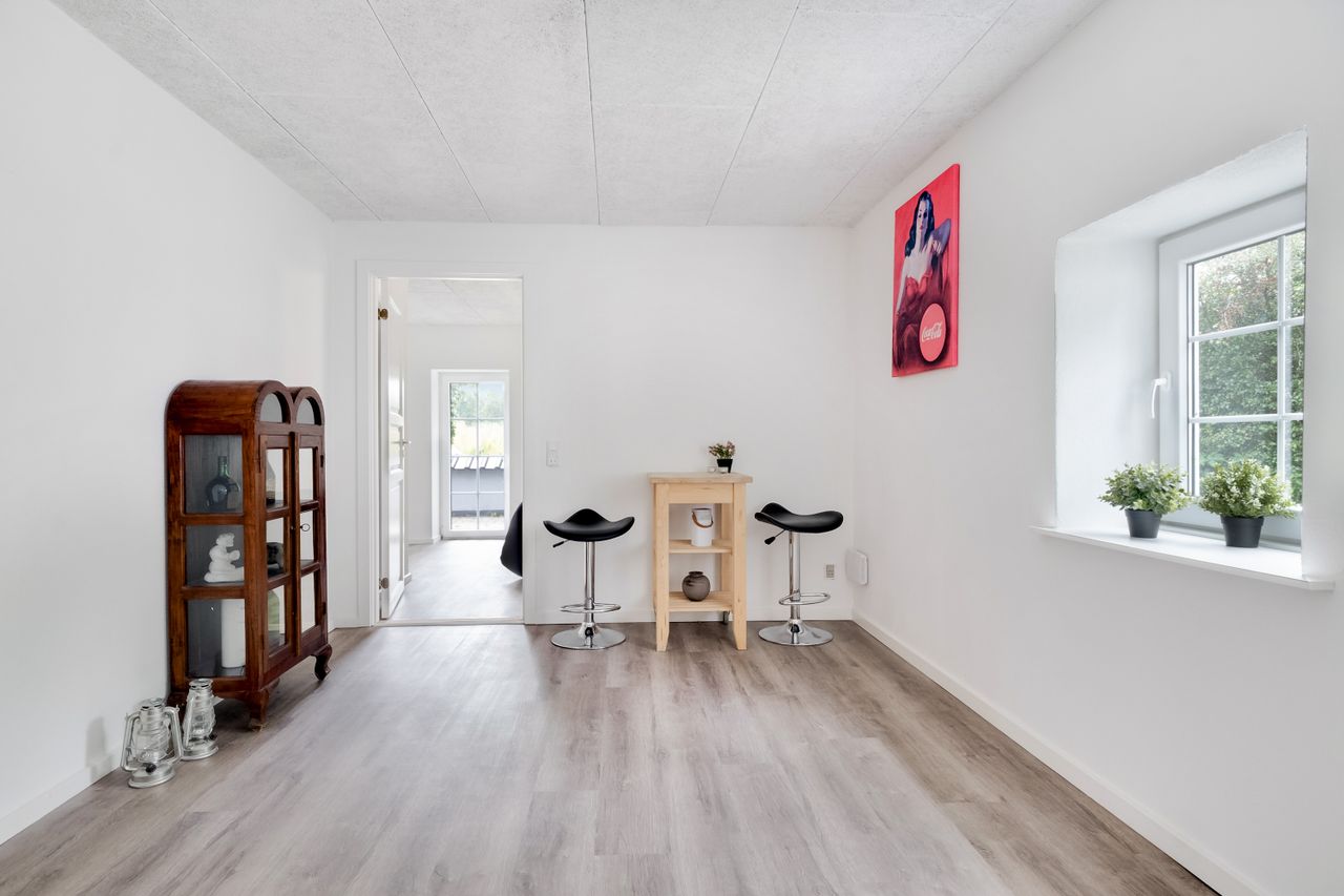 I stueplan finder du også to værelser med samme smukke gulve som i alrummet – det ene af dem har udgang til en skøn terrasse omkranset af en halvmur.