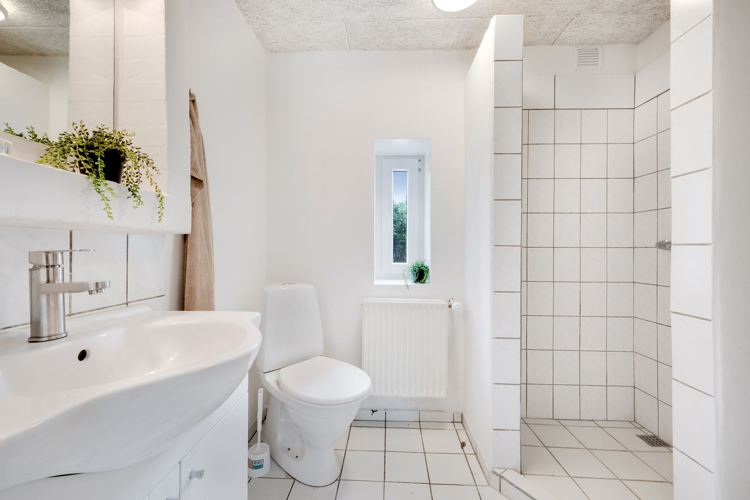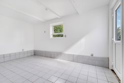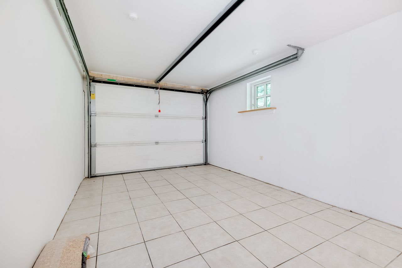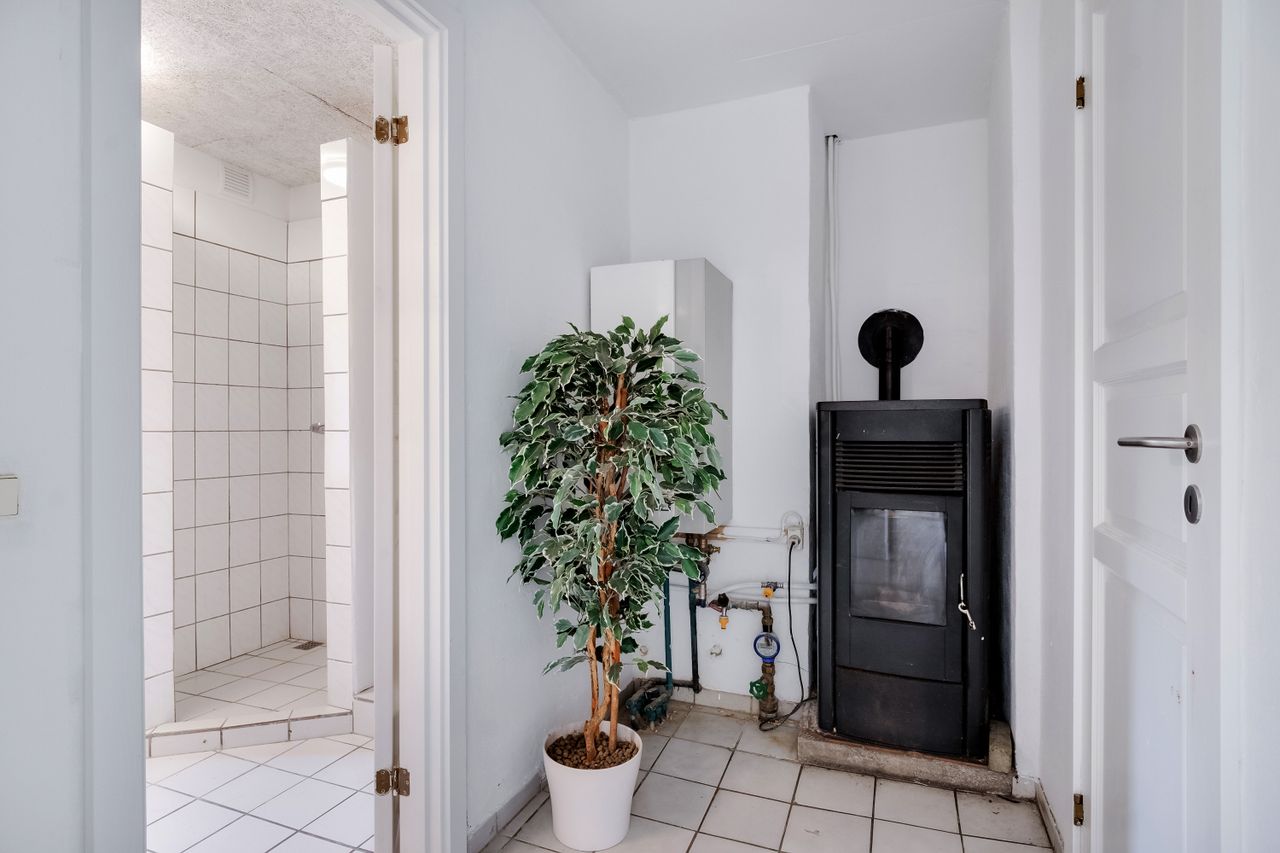 Du kan parkere i den dobbelte garage, hvorfra der er adgang til et disponibelt rum – oplagt som bryggers eller hobbyrum – og herfra kan du tørskoet fortsætte videre ind i entréen. Her er praktiske klinker, gulvarme og en træpilleovn, der opvarmer centralvarmen og kan holde energiforbruget nede. Til venstre ligger et lyst badeværelse med hvide klinker og indbygget bruseniche.