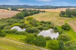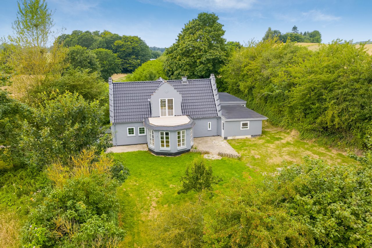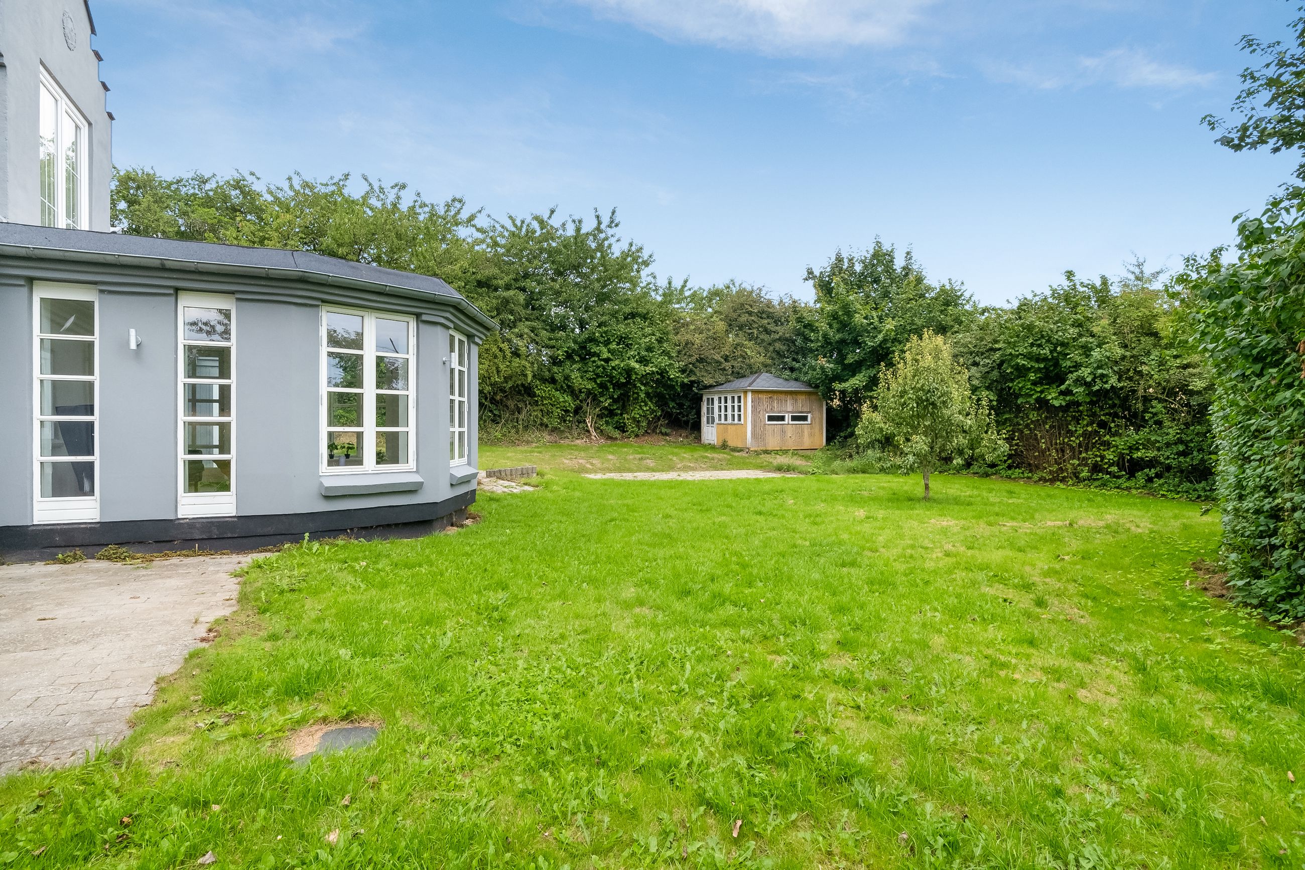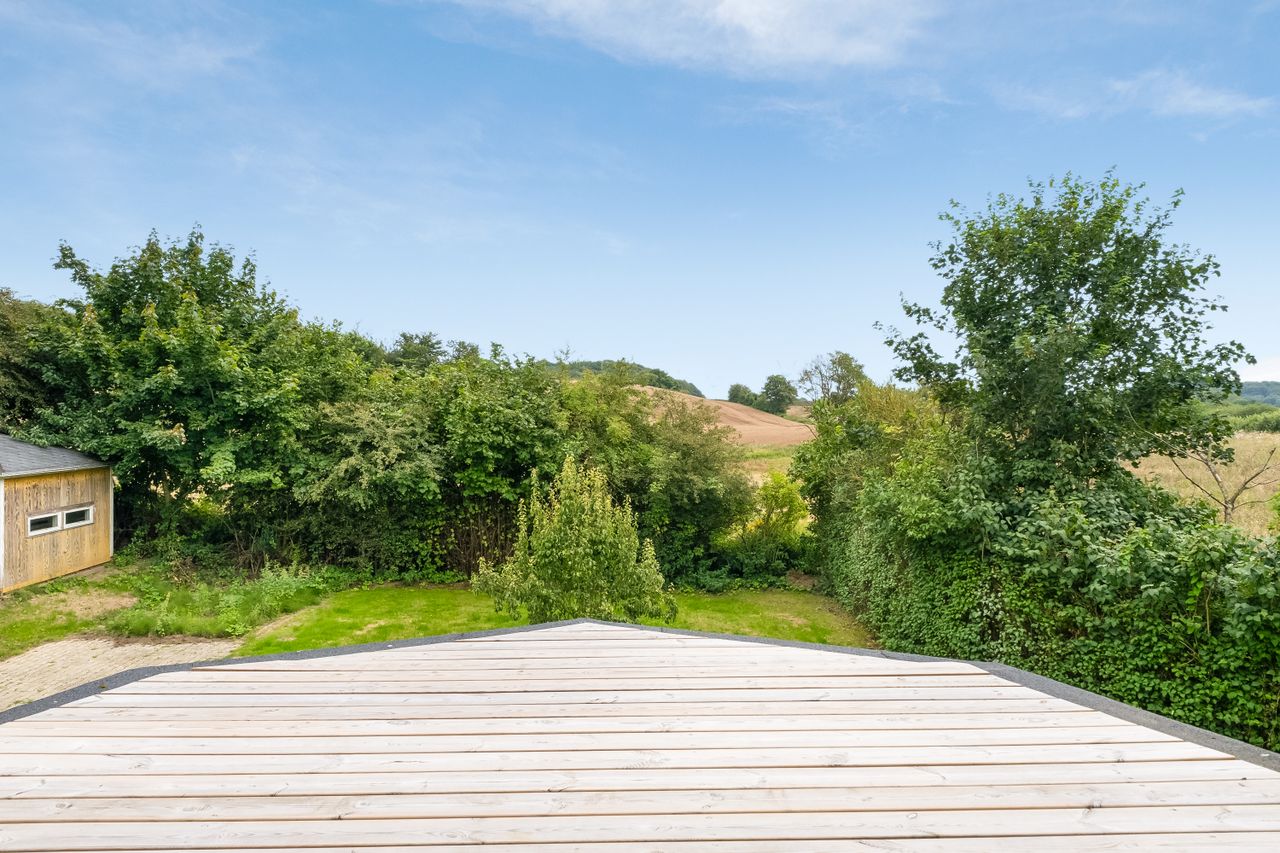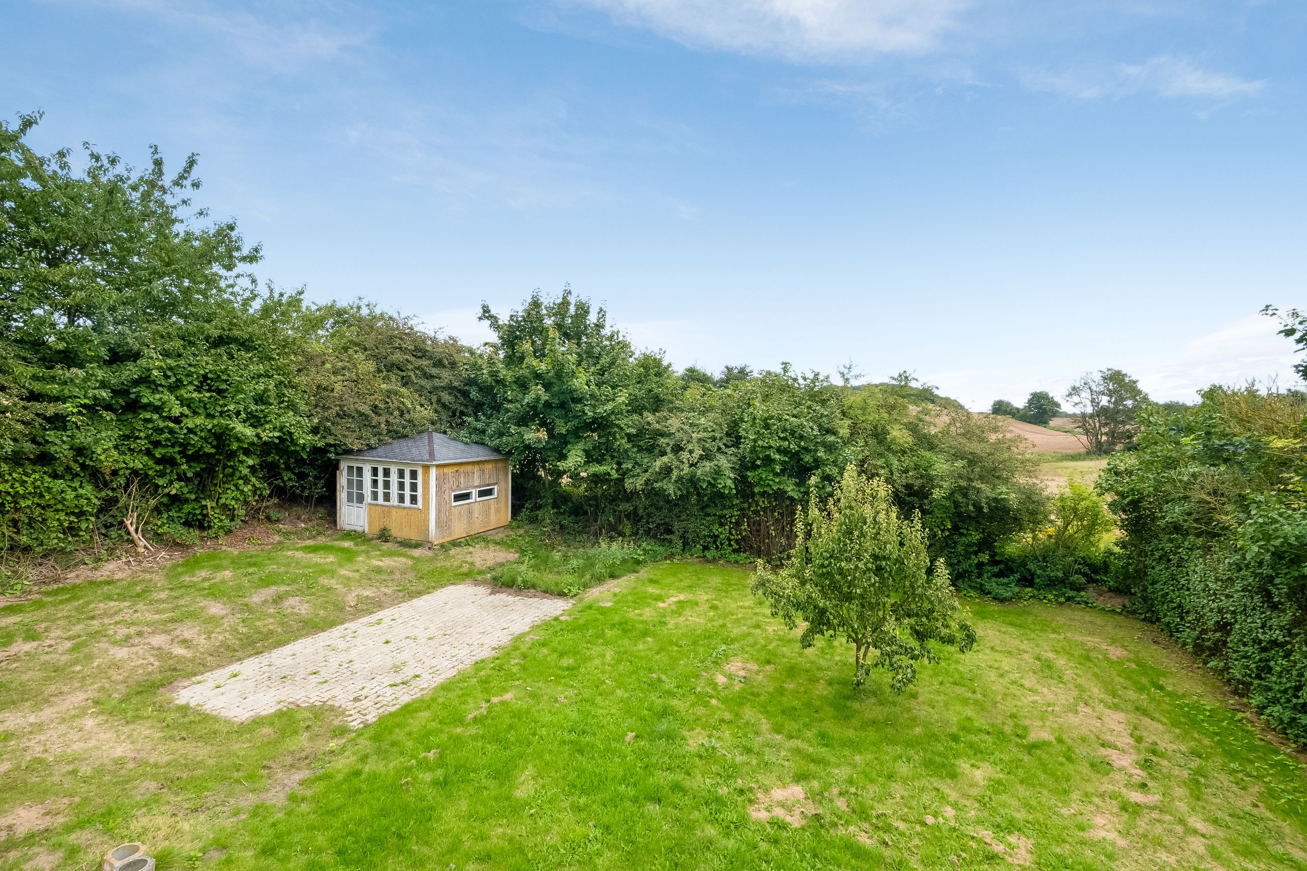 Haven er grøn og frodig, smukt afskærmet af buske og træer, men stadig med åbne kig til de naturskønne omgivelser, der omgiver ejendommen. Her er masser af plads, så du kan forme haven præcis, som du ønsker. Måske vil du skabe en stor køkkenhave, måske forvandle den til en blomstrende oase, eller måske bevare den, som den er nu – nem at passe og overskuelig. I haven finder du også et udhus.
