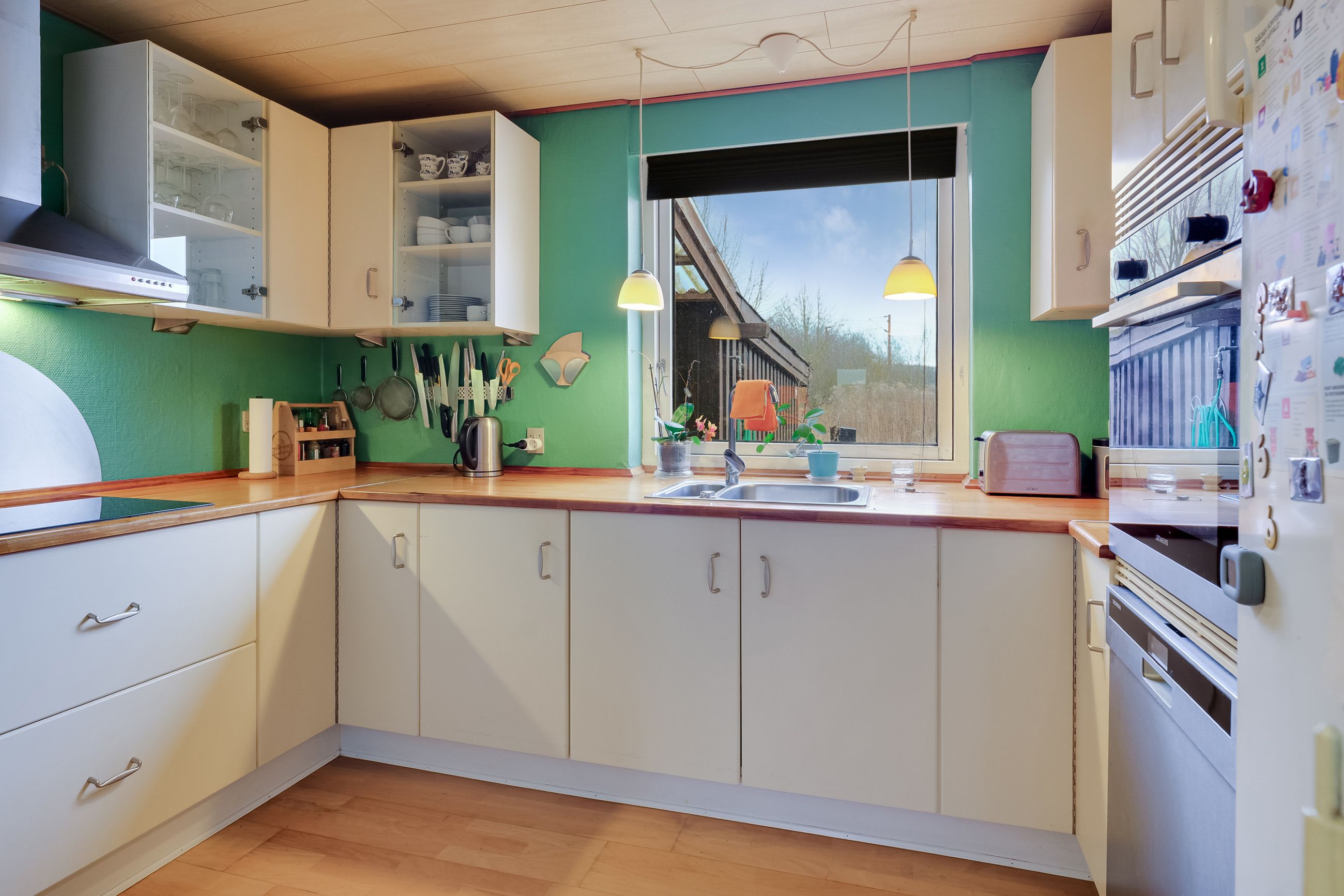 Køkkenet har hvide fronter, ovn i god arbejdshøjde og en skøn udsigt fra vinduet ved håndvasken. Her kan I stå og skrælle kartofler, mens I nyder udsigten over de åbne marker. Stuen ligger i forlængelse af køkkenet og har trægulv samt plads til både spisebord og sofahjørne. Herfra er der udgang til terrassen, så hygge og måltider nemt kan rykkes ud under åben himmel.