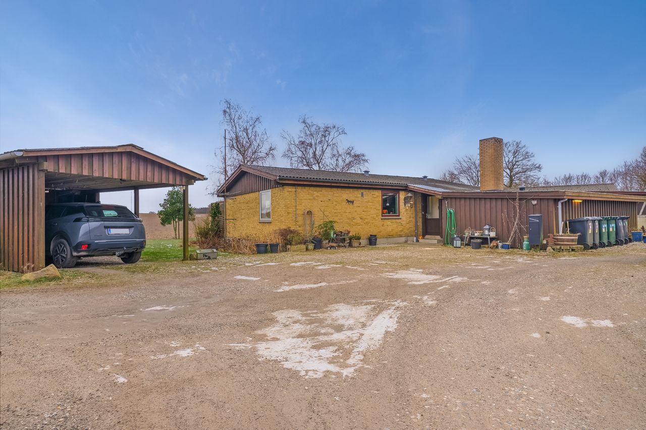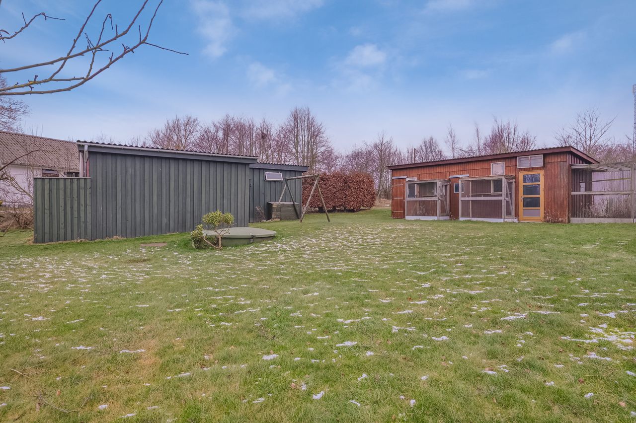 Udendørs findes yderligere tre bygninger: en carport, et skur som har fungeret som både hestestald, brændeskur og nu som trailergarage og opbevaring. Afslutningsvis er der et ældre dueslag, som kan anvendes som voliere. Der har tidligere været heste i denne bygning, så måske kan det også blive en mulighed igen.