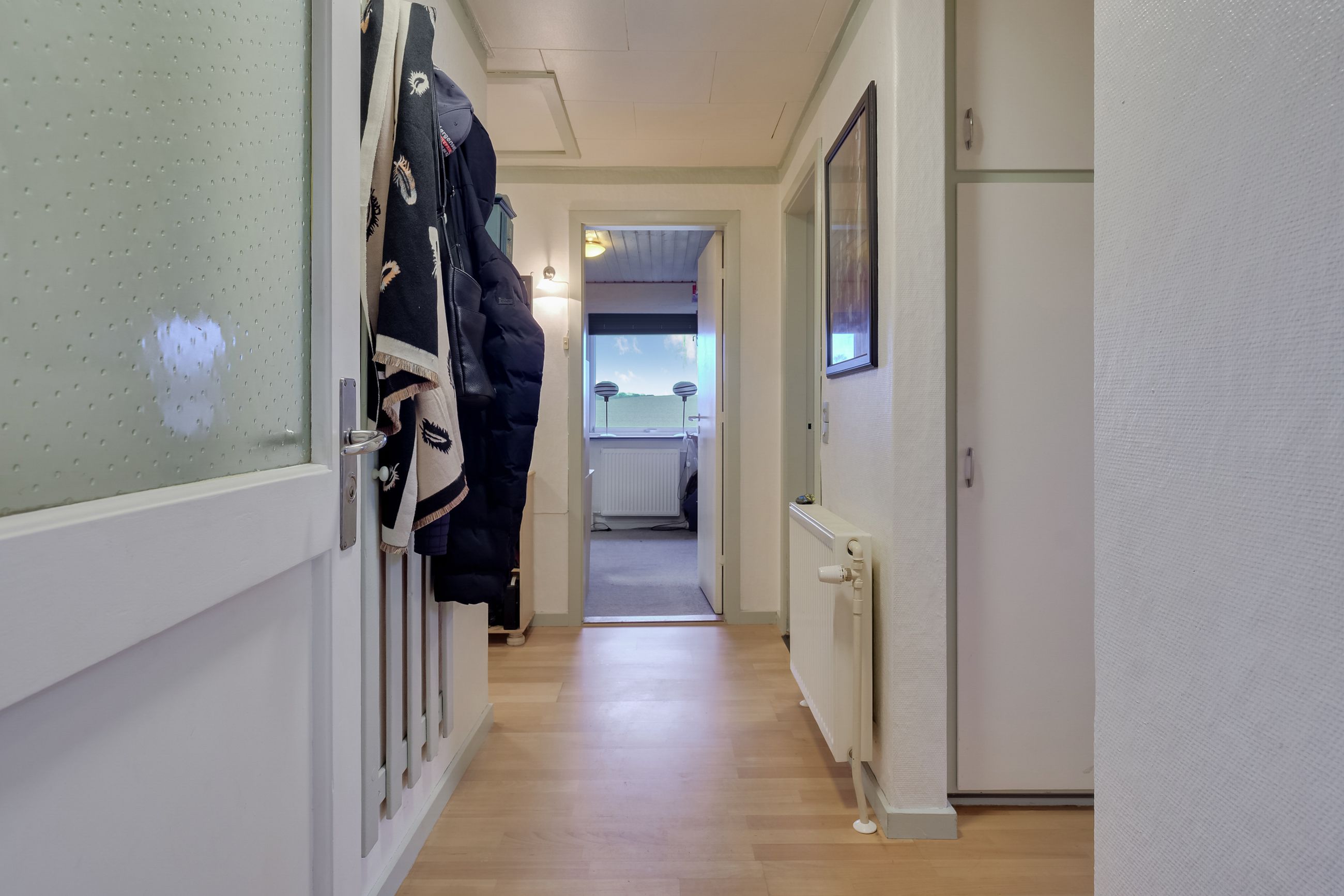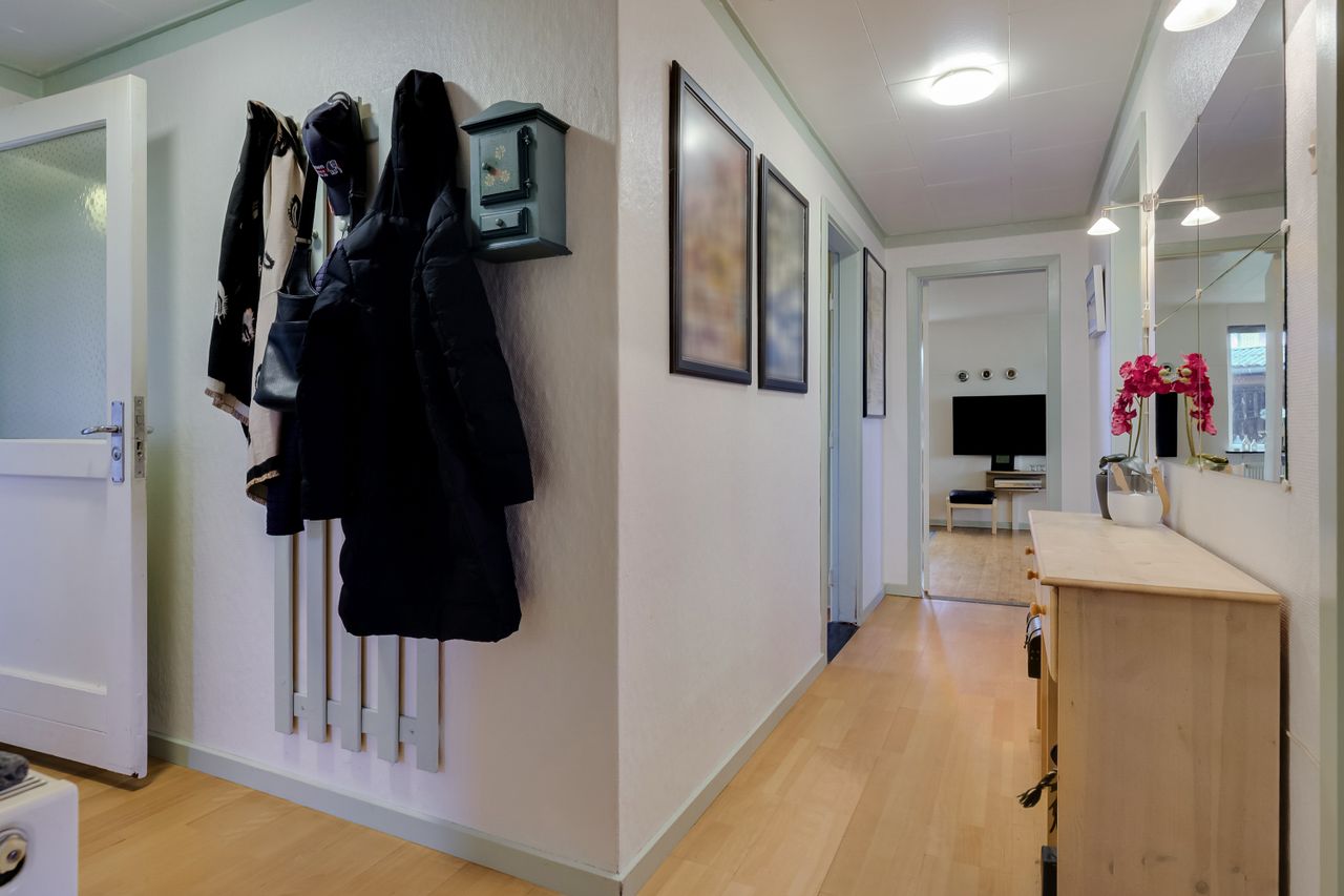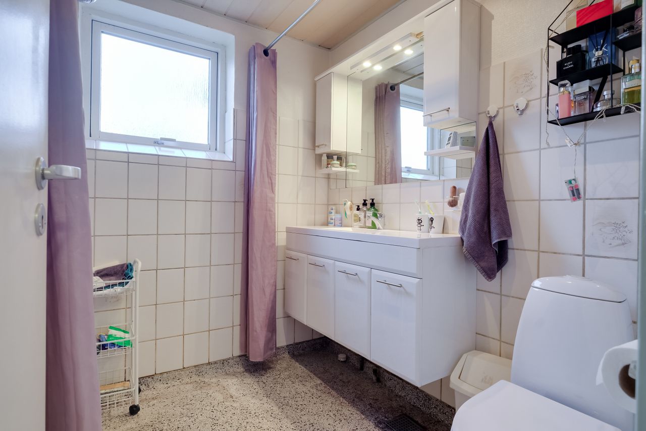 Når I træder ind i den kombinerede entré og fordelingsgang, fornemmer I straks, at her er et godt og gedigent hus. Ned ad gangen finder I hele tre gode værelser - alle lyse og med god plads, og to af dem har trægulve. Husets badeværelse er ligeledes lyst og rummeligt.