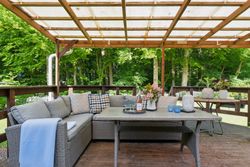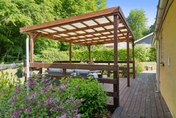 Husets gode planløsning udmærker sig endvidere ved at skabe en god forbindelse til den frodige have. På hele den ene side af villaen er der anlagt fliseterrasser, og stedvist er også overdækkede arealer. Grunden er stor, men ikke desto mindre ganske overkommelig at passe, ligesom man ved indkørslen råder over en carport.