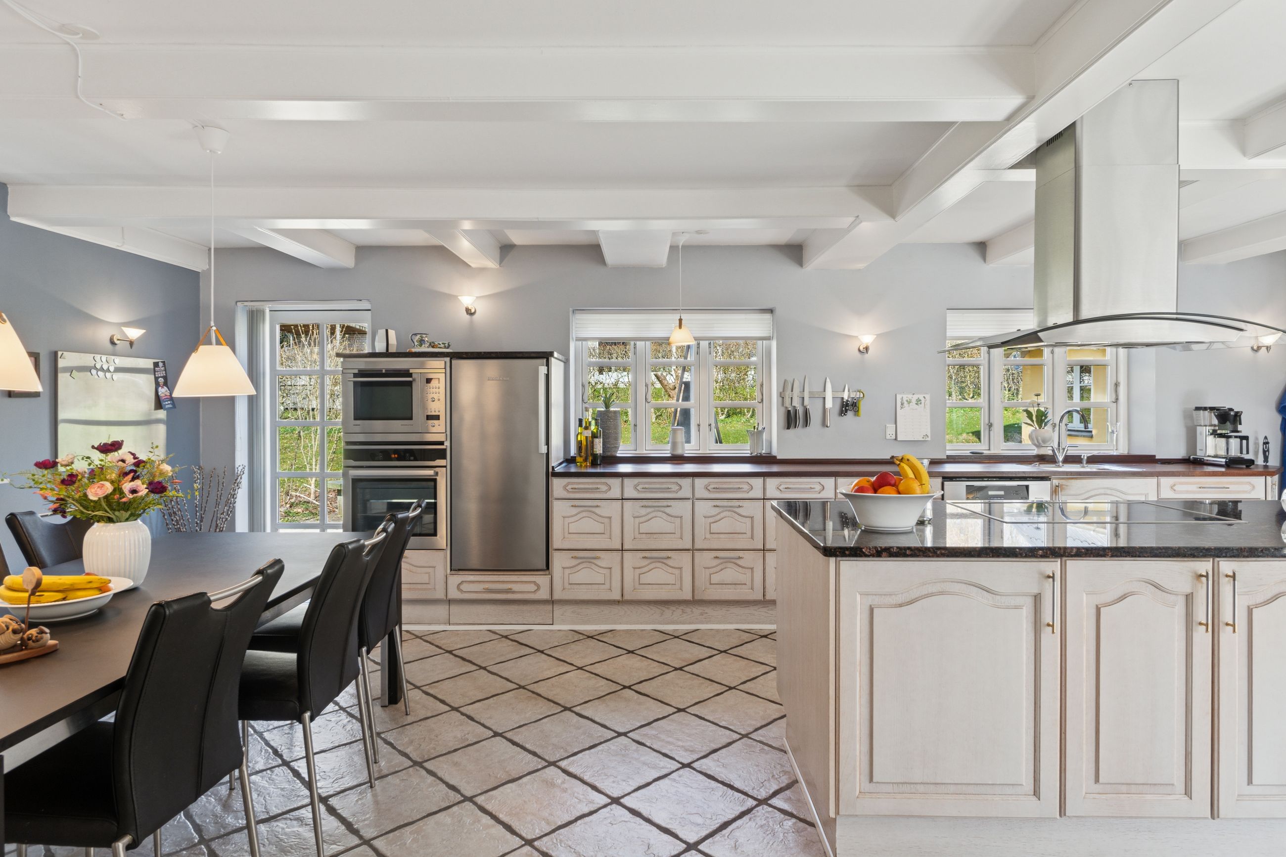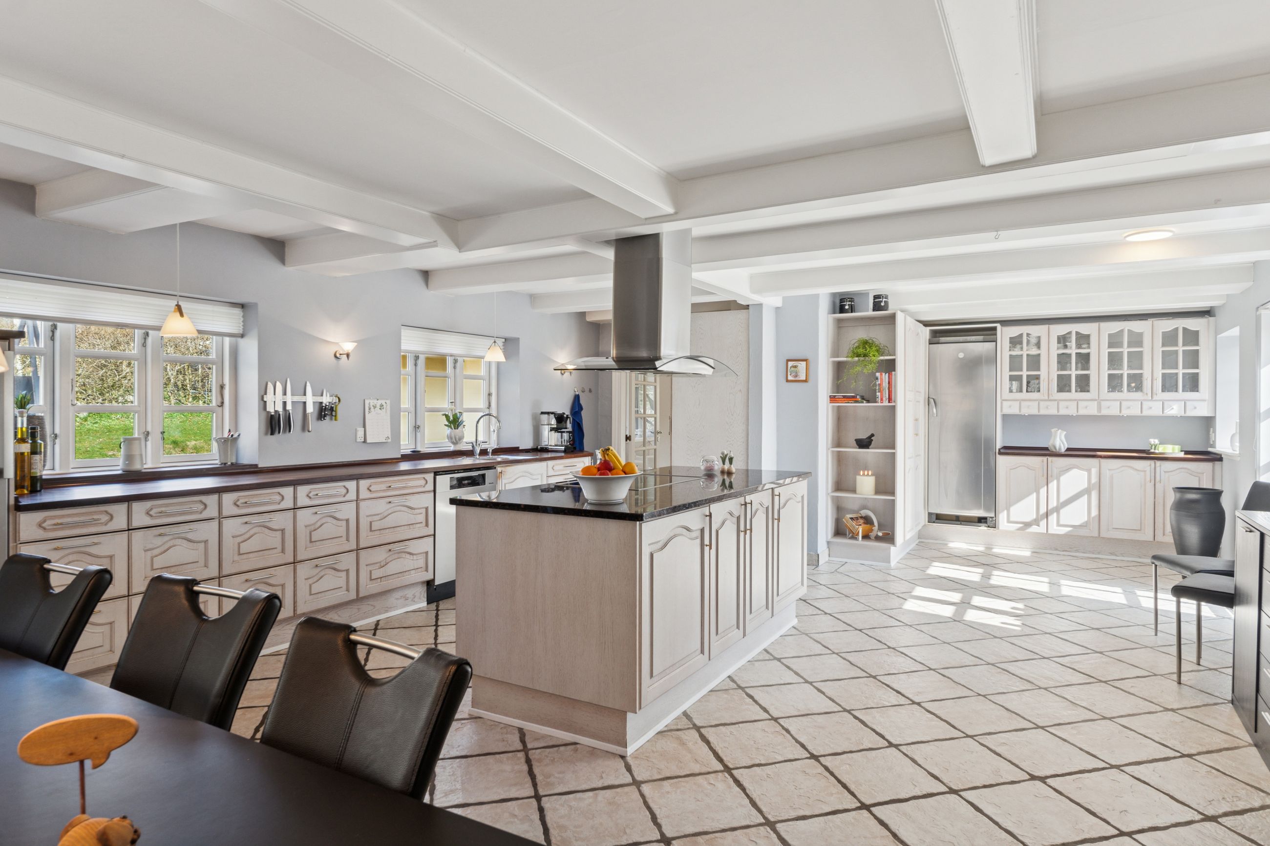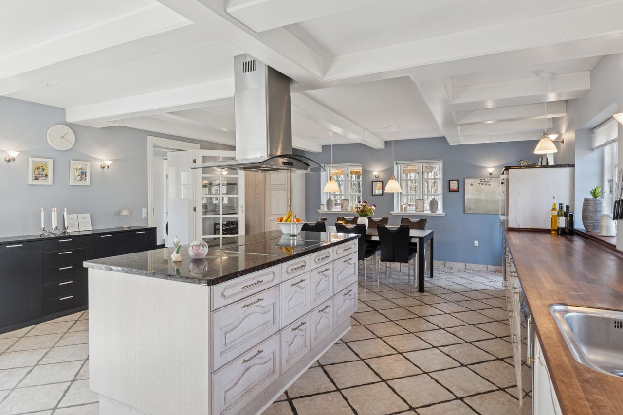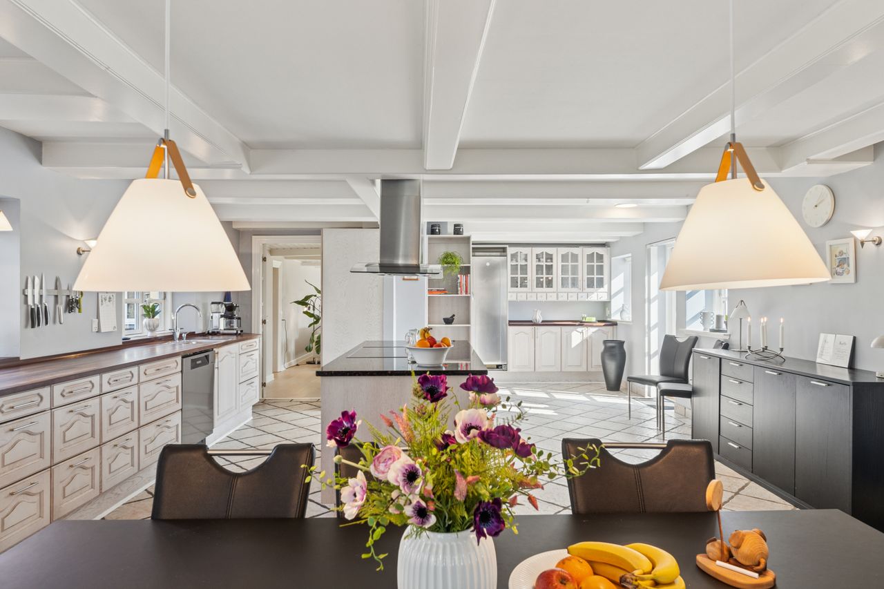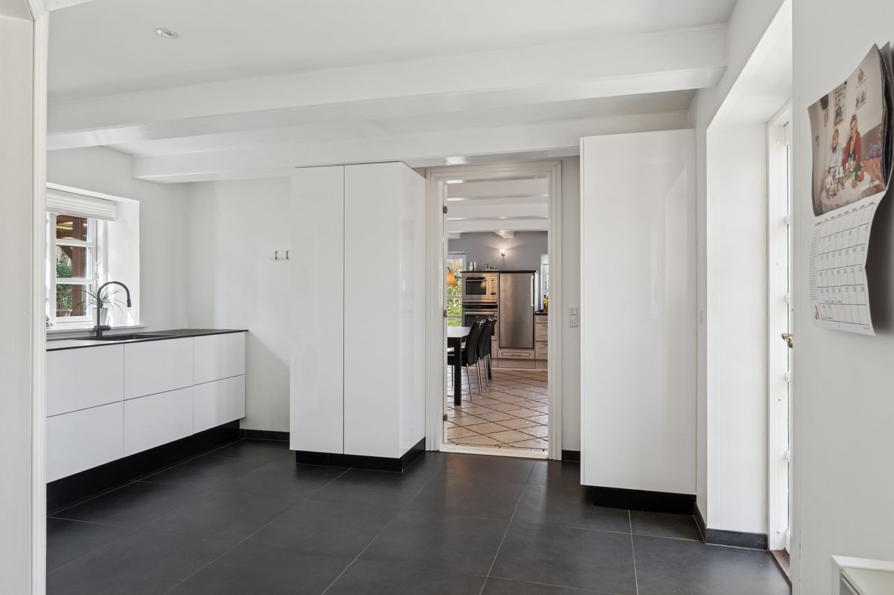 Det er faktisk muligt endnu i dag at se præcis, hvor skellet mellem stalden og boligen gik ved at følge de synlige loftsbjælker i køkkenet. I dag er det imidlertid ikke kvæg og heste, der er står under tagkonstruktionen, i dag er det et nydeligt og funktionelt køkken med bordplader af træ og granit foruden en rummelig spiseafdeling, som ledsages af et fremragende lysindfald, man finder.