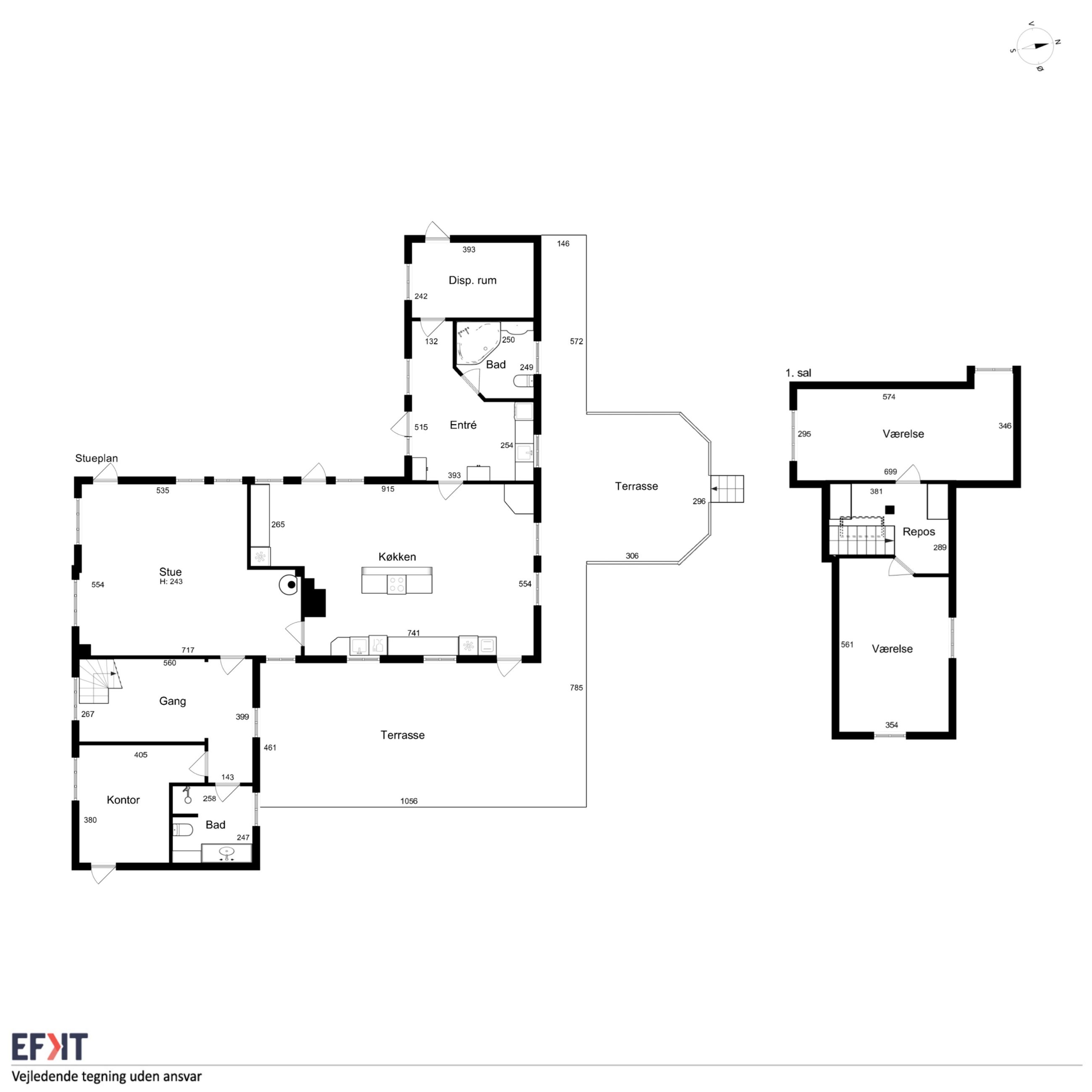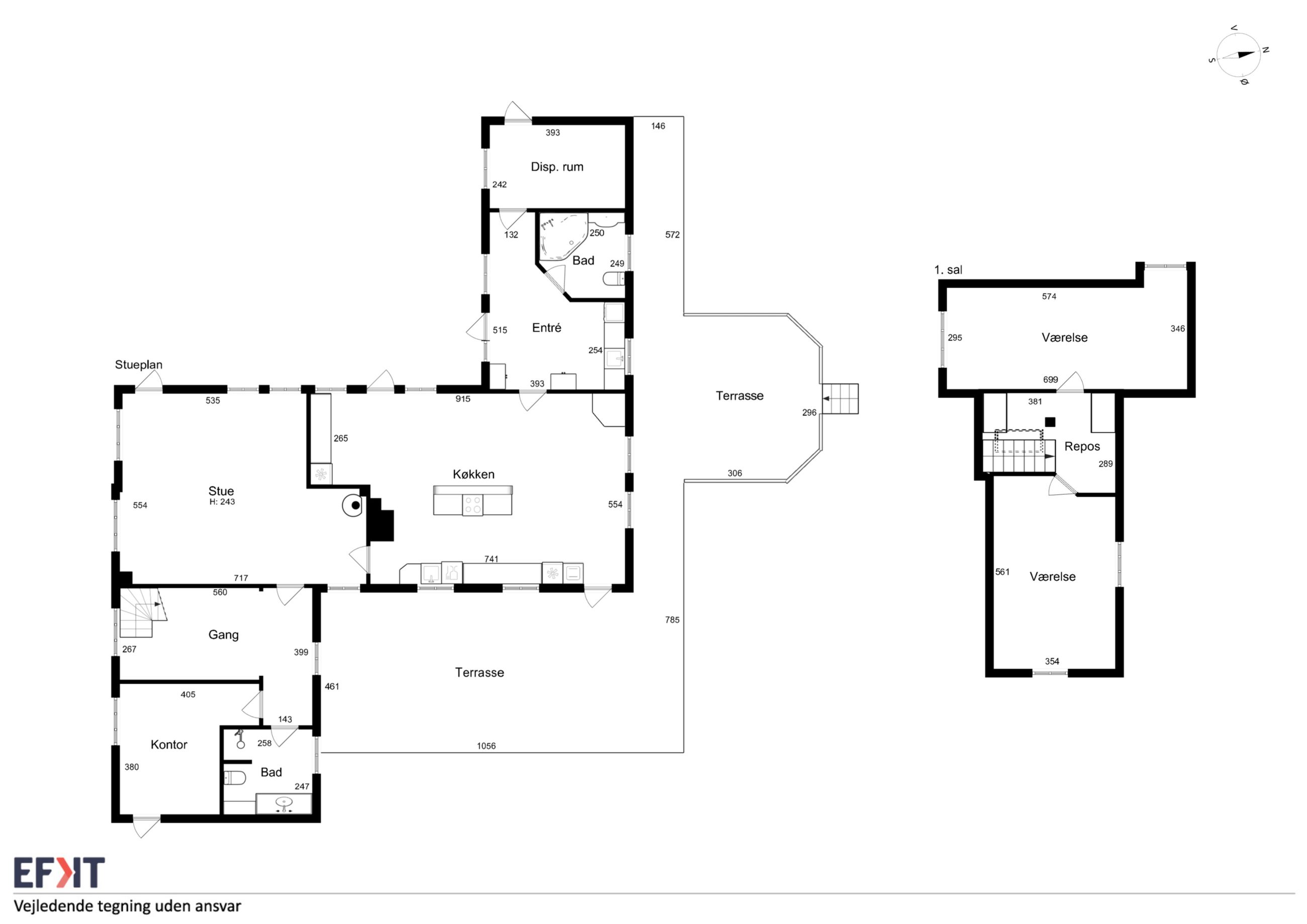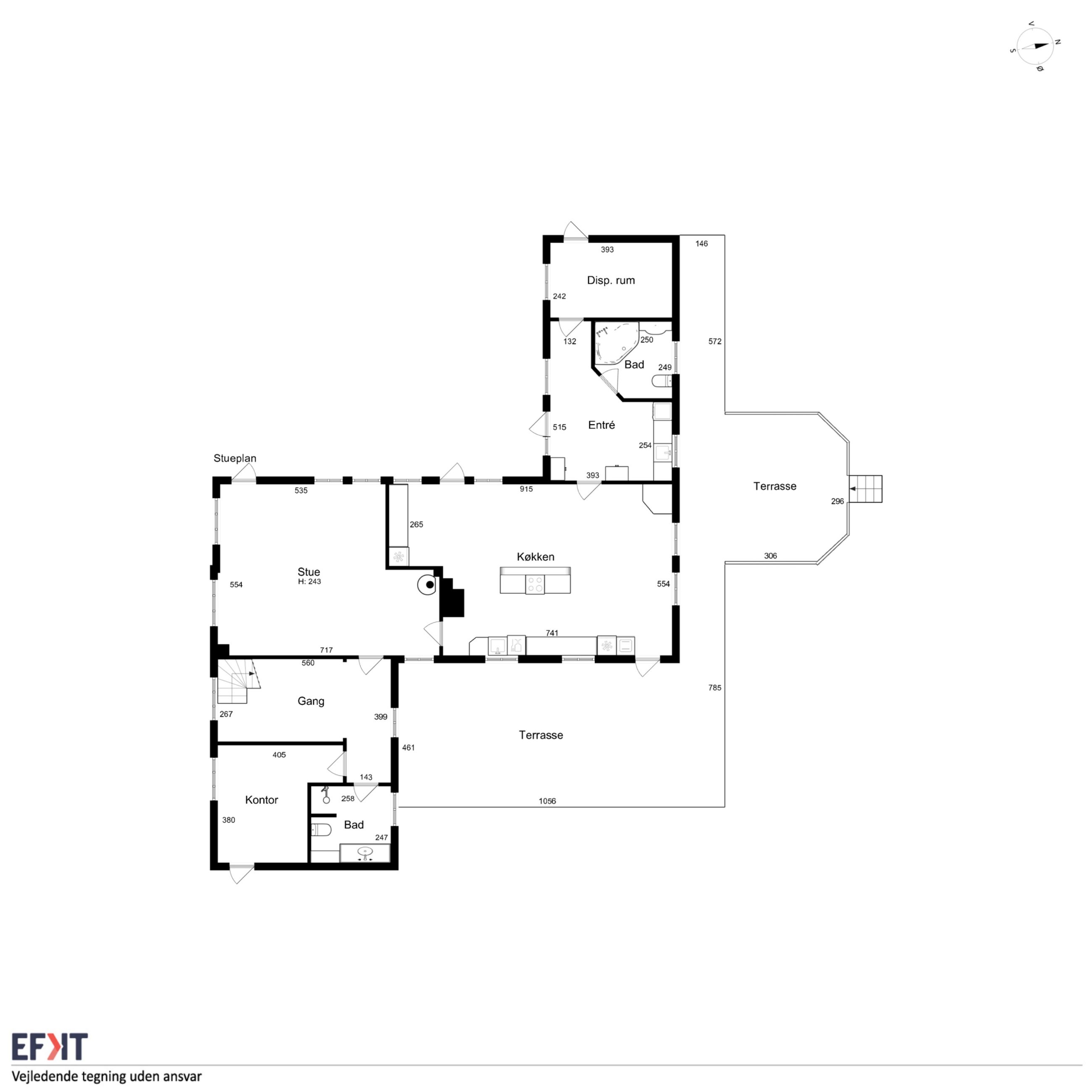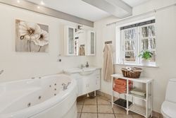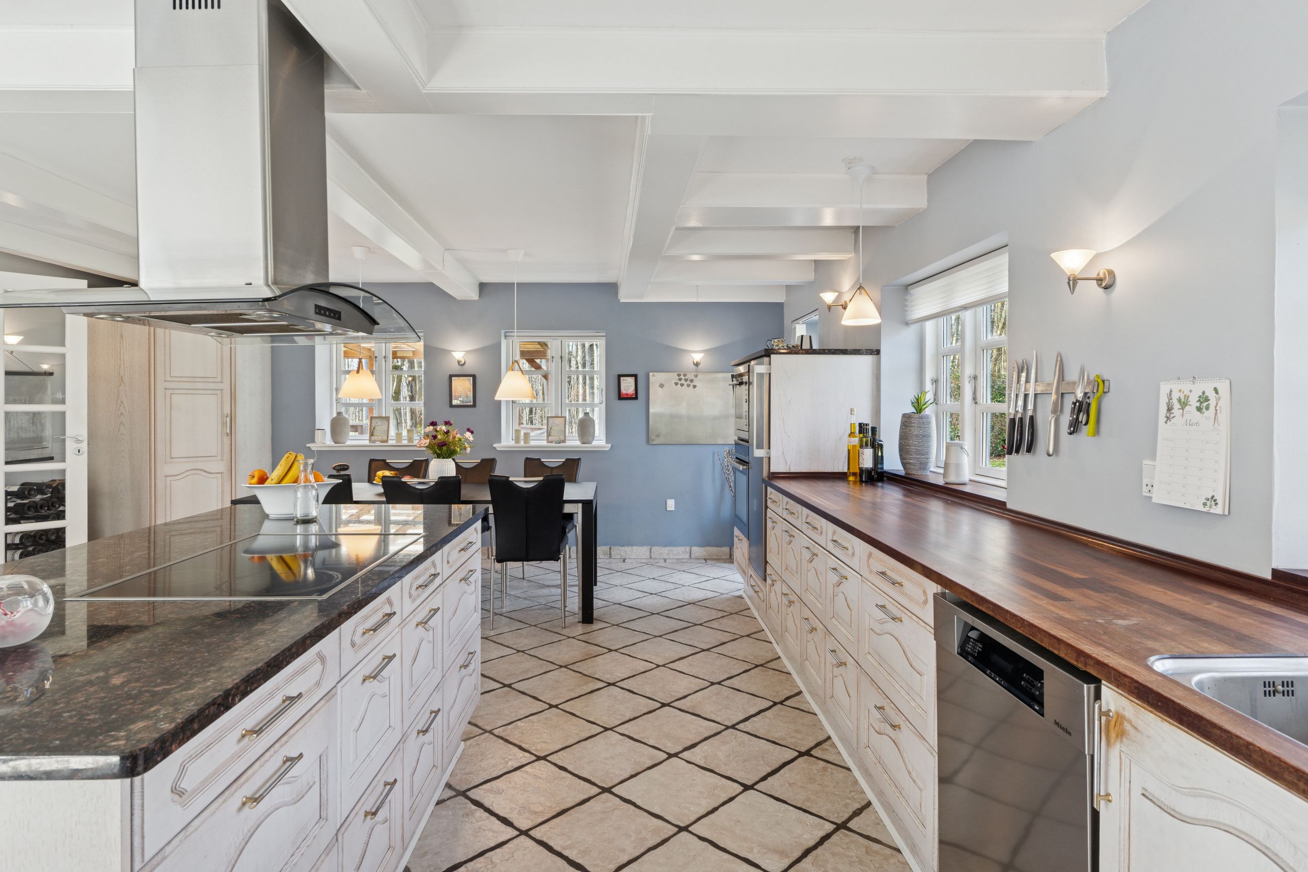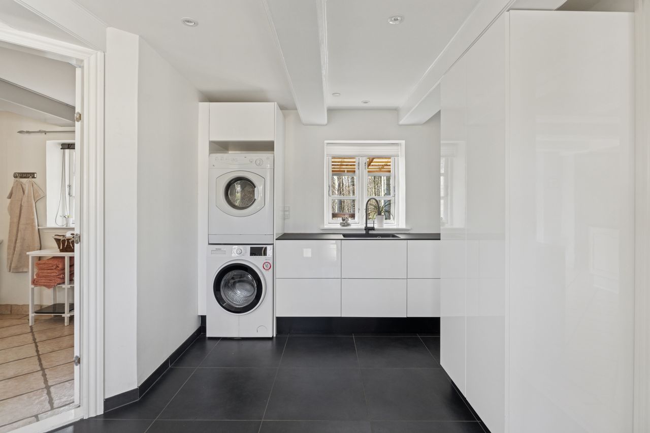 Det er faktisk muligt endnu i dag at se præcis, hvor skellet mellem stalden og boligen gik ved at følge de synlige loftsbjælker i køkkenet. I dag er det imidlertid ikke kvæg og heste, der er står under tagkonstruktionen, i dag er det et nydeligt og funktionelt køkken med bordplader af træ og granit foruden en rummelig spiseafdeling, som ledsages af et fremragende lysindfald, man finder.