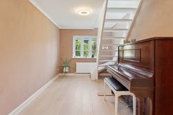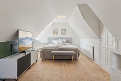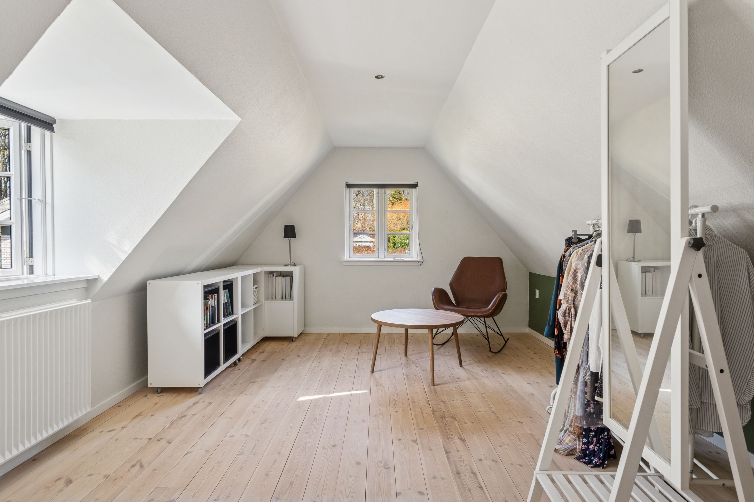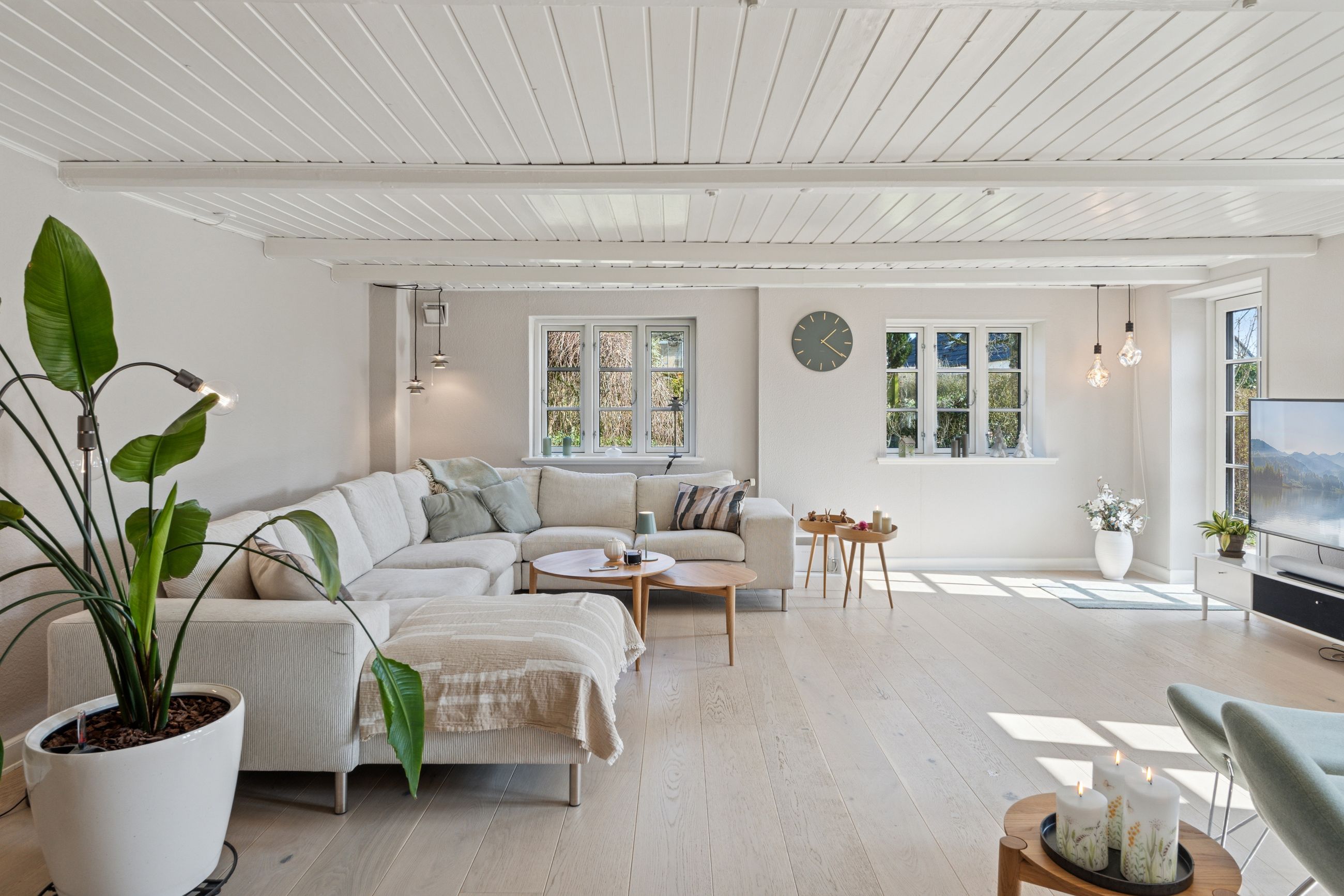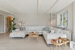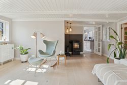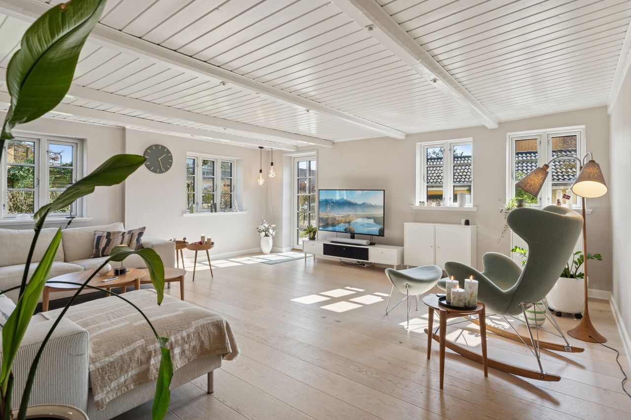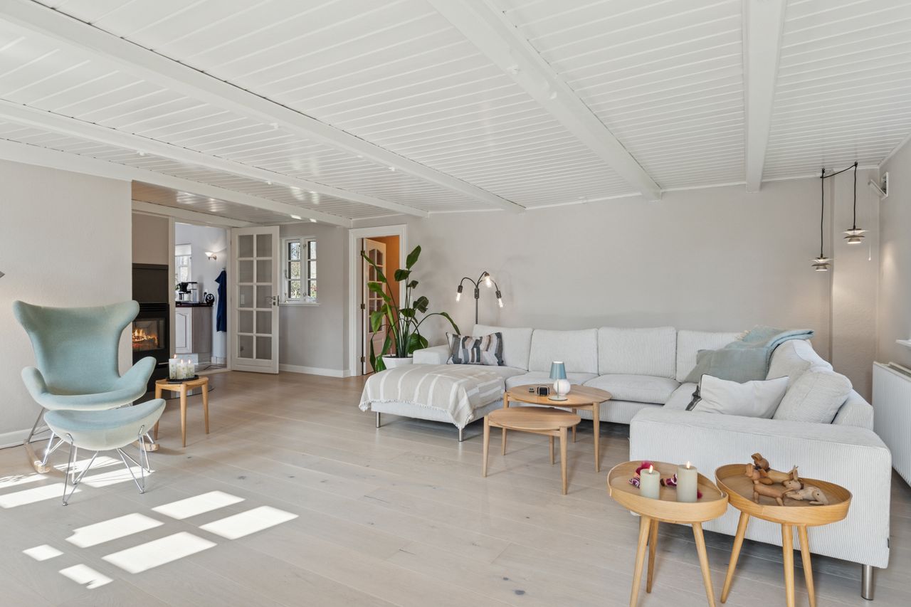 Boligens velkomponerede planløsning består også af en stor stue. Her er en brændeovn med til at fremhæve den hyggelige stemning, og ligesom i alrummet er der et behageligt lysindfald, der kommer ind ad de sprossede ruder.
