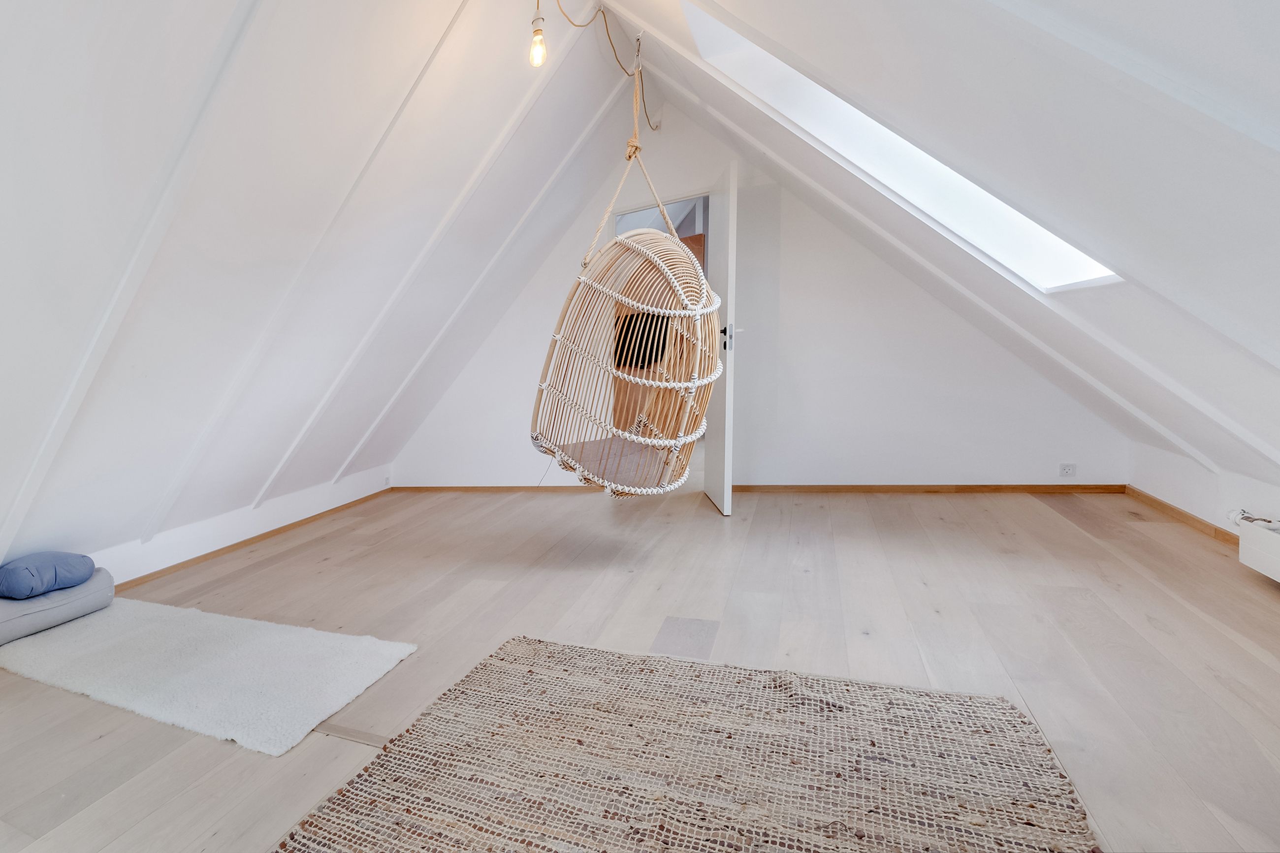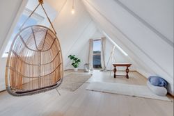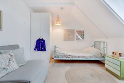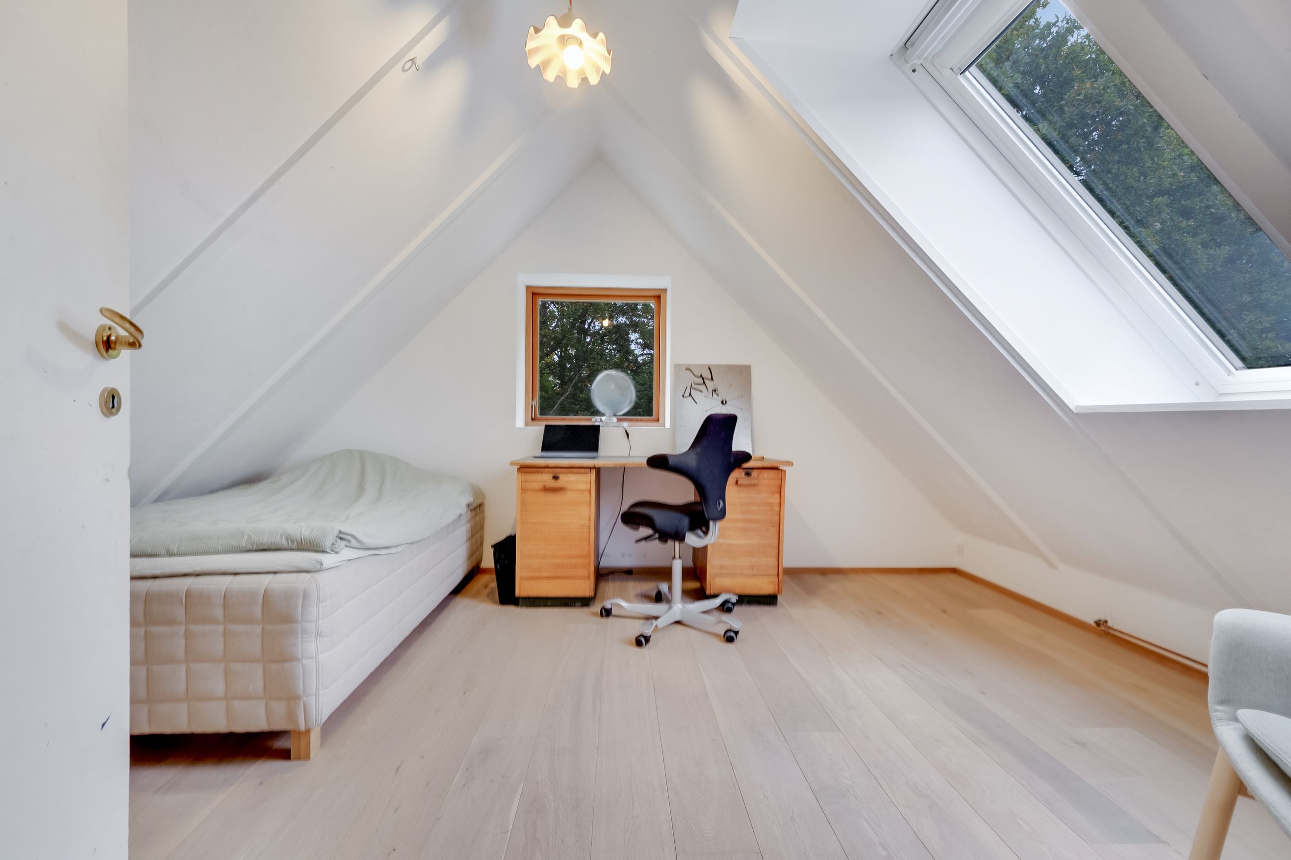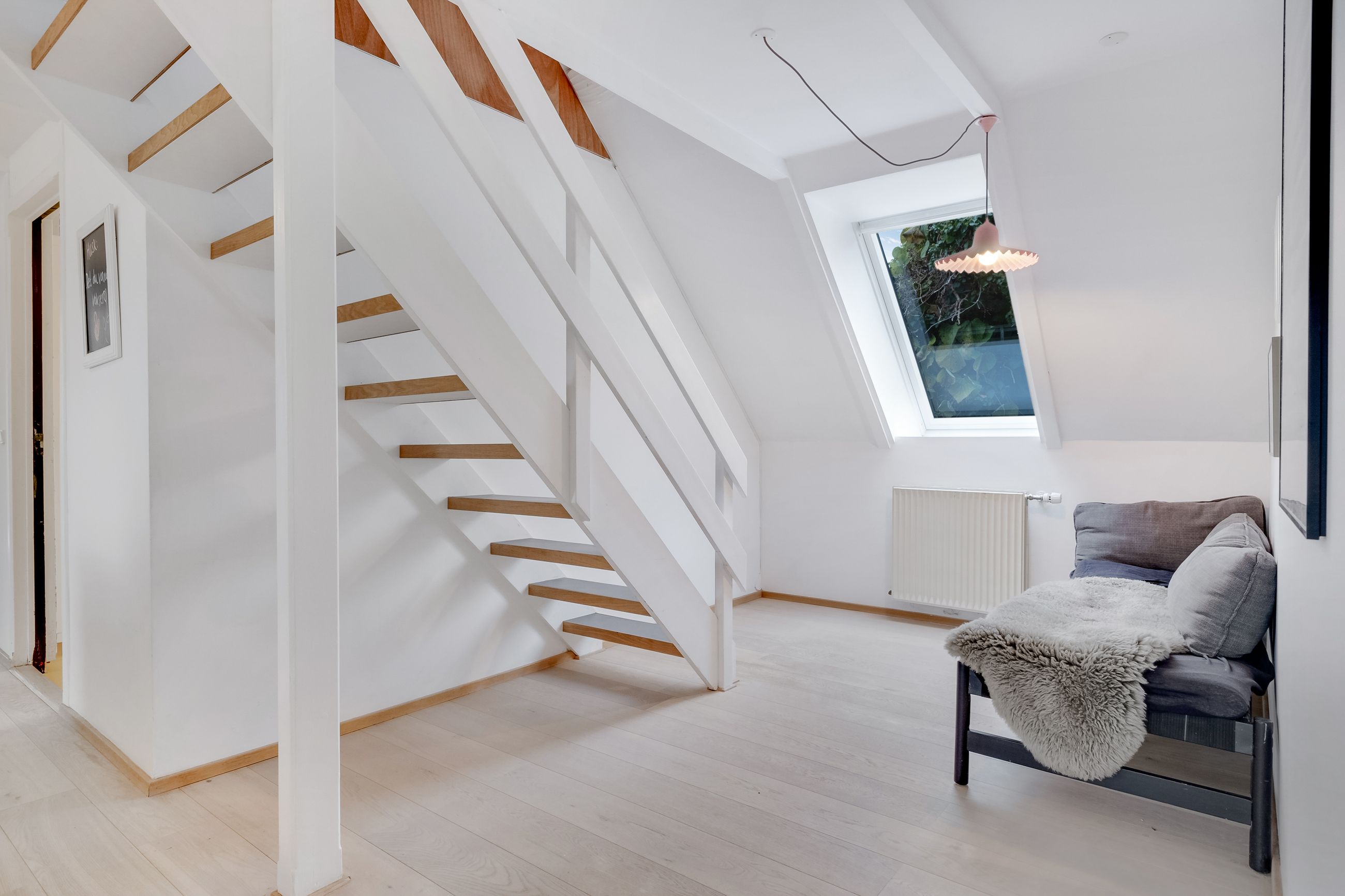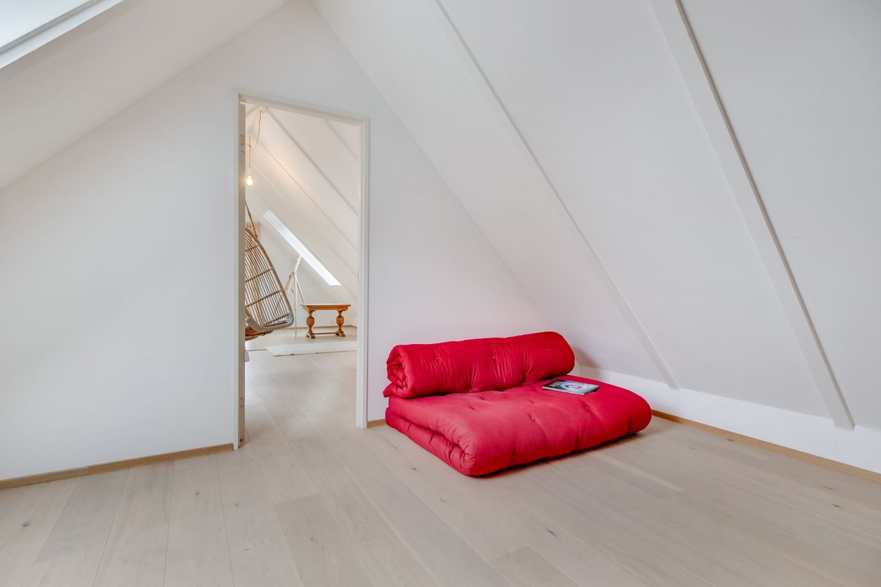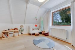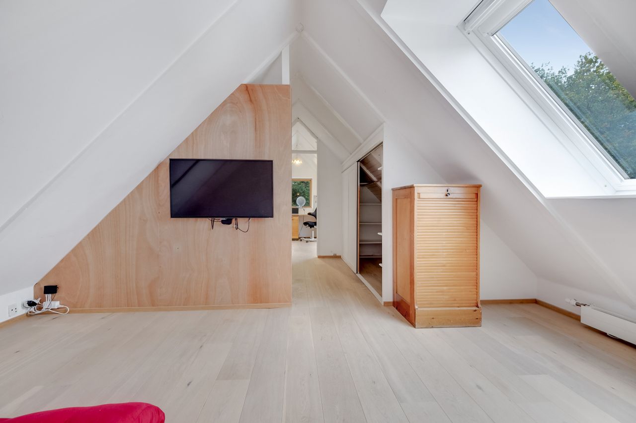 Følger du den smukke trappe kommer du op på 1. sal, der består af en repos, endnu et værelse og husets anden stue. Her er generelt lyst, og de skrå vægge skaber en charmerende og varm atmosfære. Her kan du indrette alt fra kontor til atelier eller teenageafdeling.
