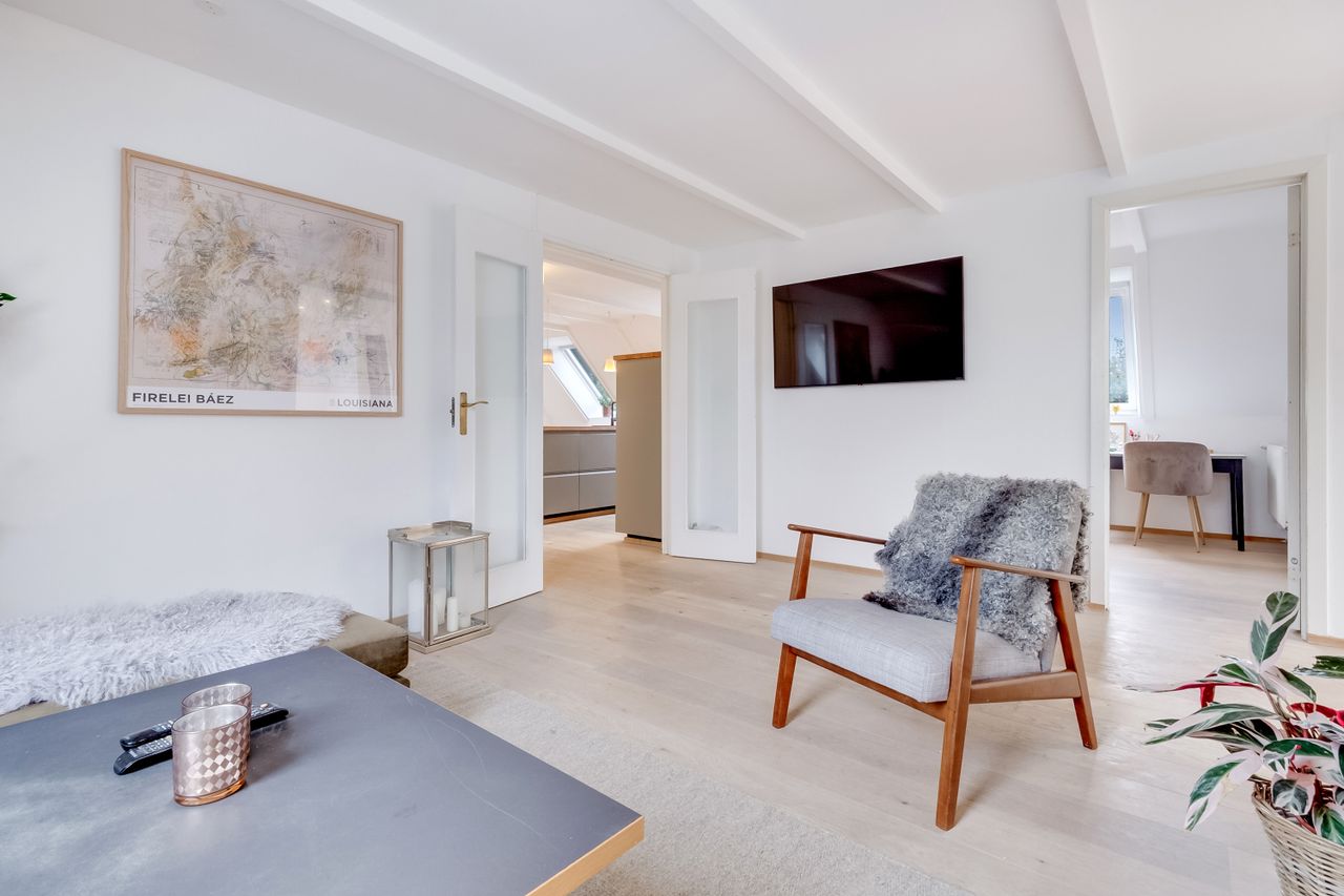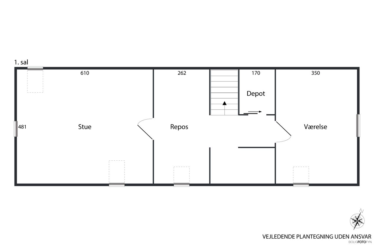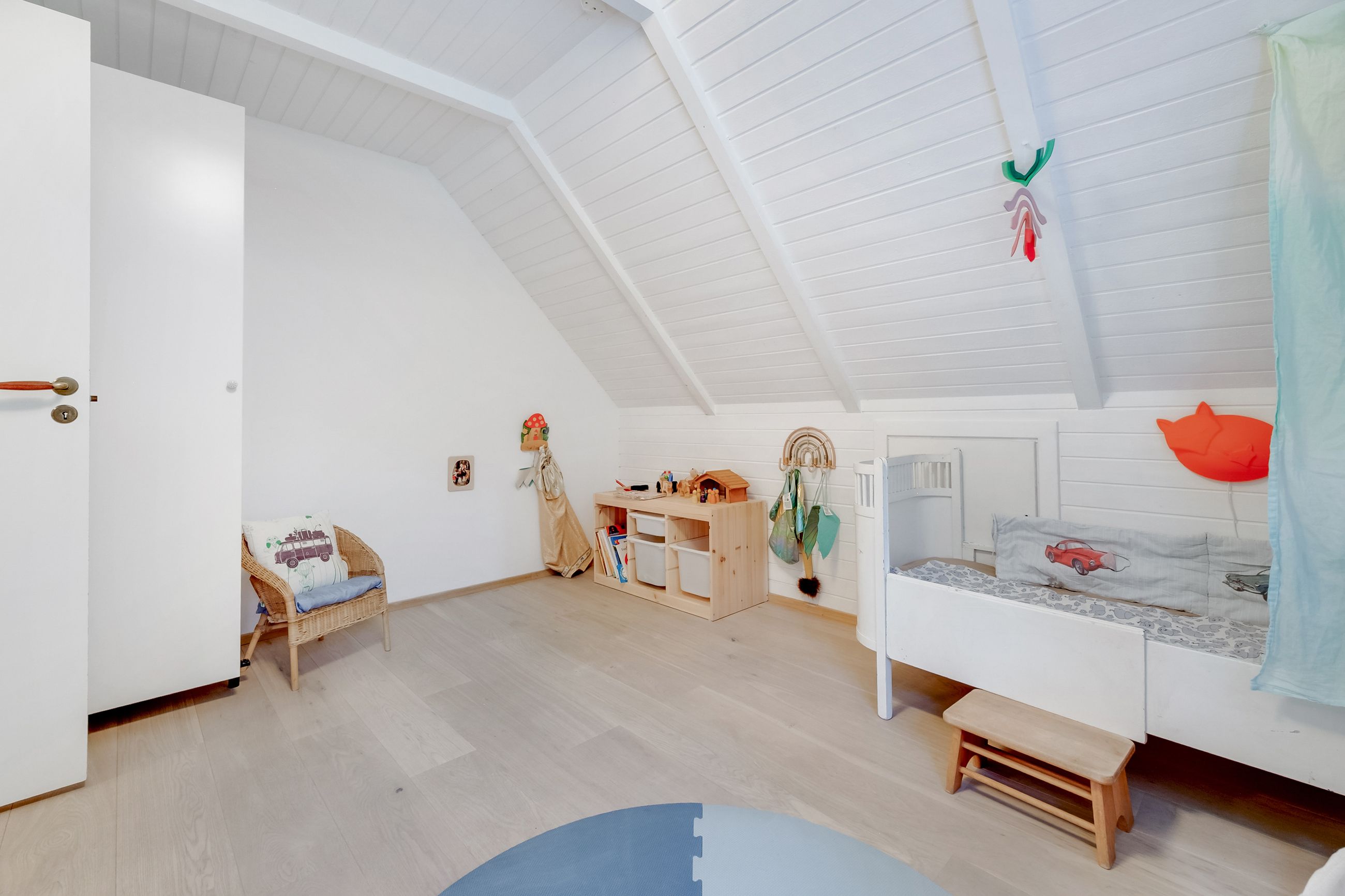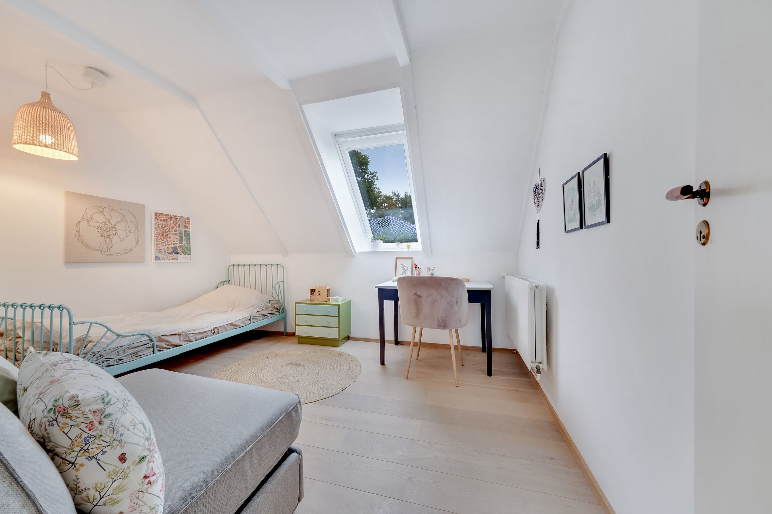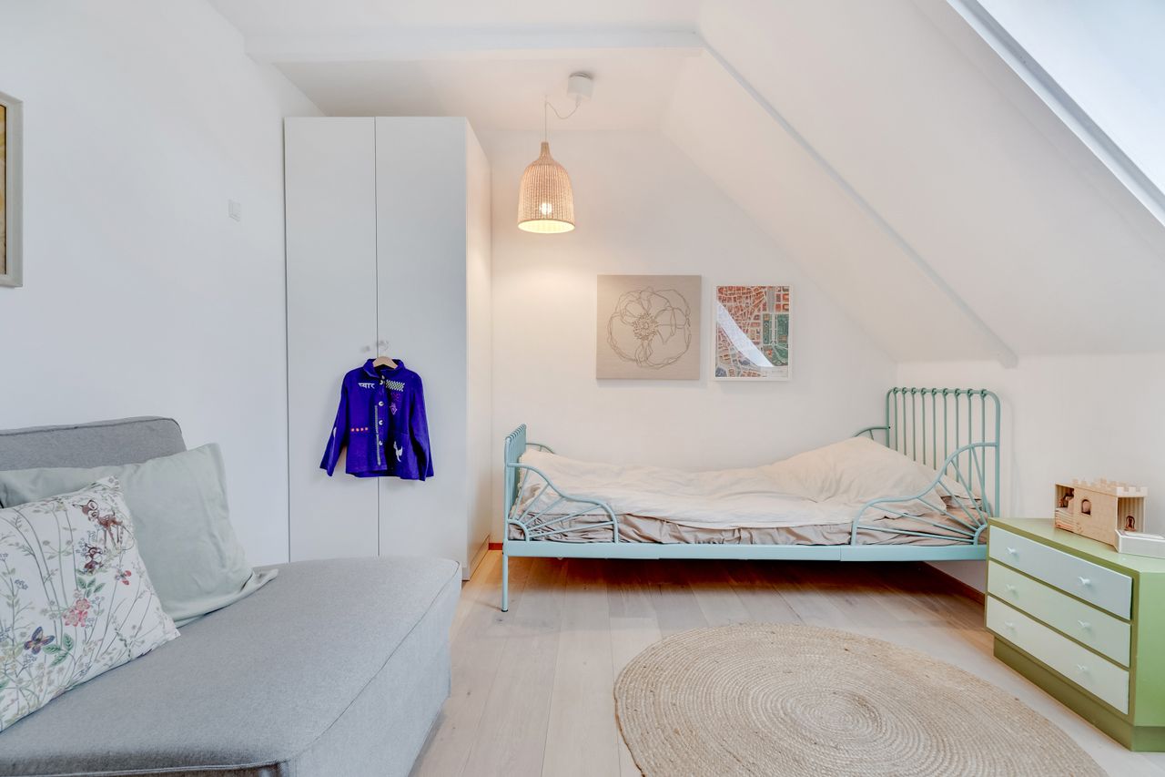 Følger du den smukke trappe kommer du op på 1. sal, der består af en repos, endnu et værelse og husets anden stue. Her er generelt lyst, og de skrå vægge skaber en charmerende og varm atmosfære. Her kan du indrette alt fra kontor til atelier eller teenageafdeling.