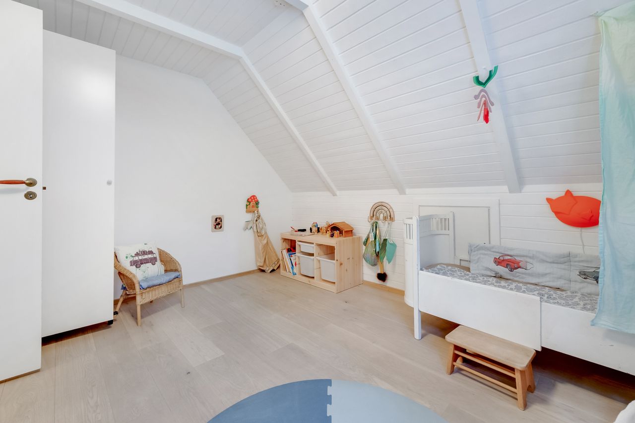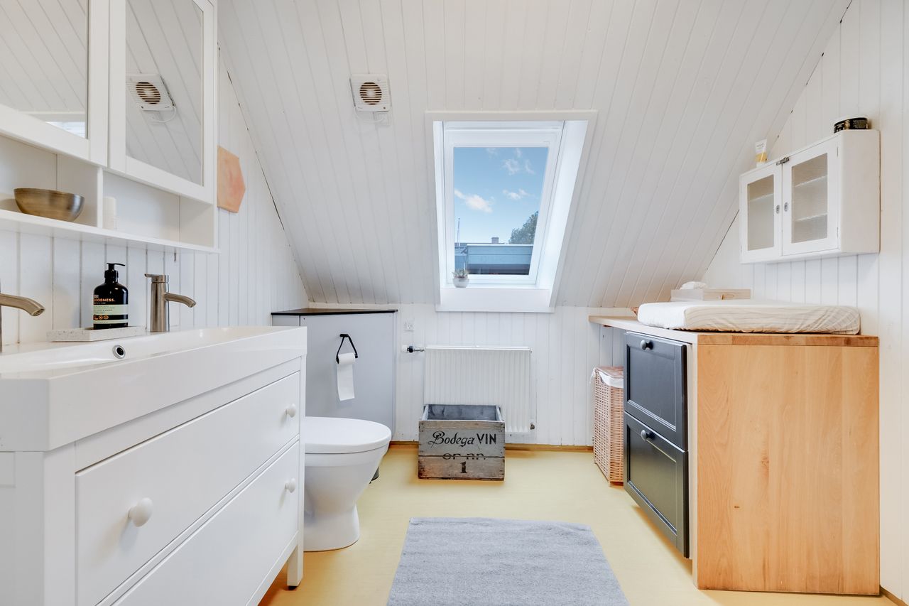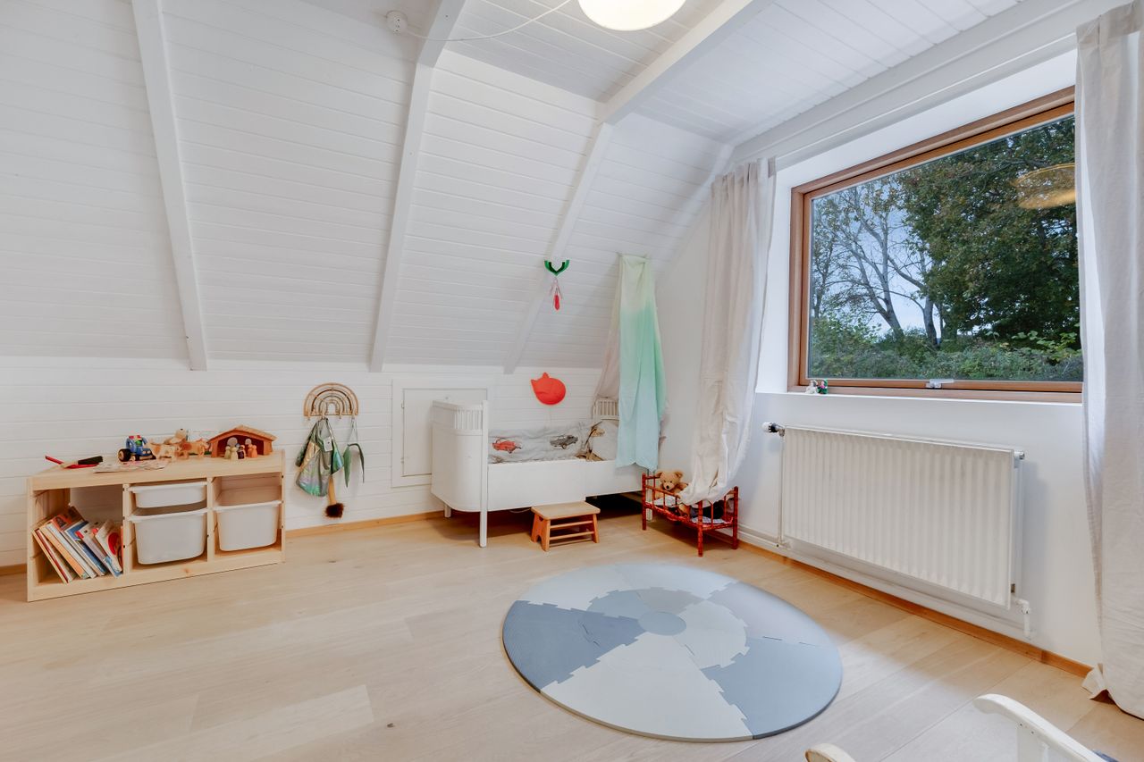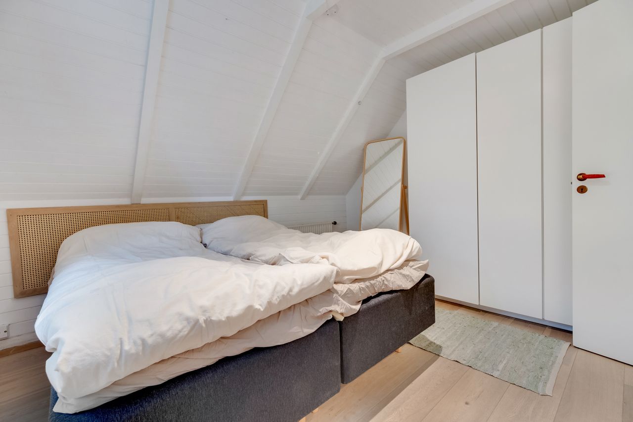 Køkken-alrummet har en åben indretning og har et dejligt lysindfald fra skråvinduerne. Køkkenet er opført med minimalistiske grå fronter, der skaber et moderne og stilfuldt udtryk. Træbordpladerne skaber en skøn kontrast af varme og sjæl. Her er der desuden god bordplads og alt, hvad du skal bruge af hårde hvidevarer. På den anden side af køkkenøen er der plads til at etablere en spiseafdeling, hvilket skaber et godt fundament for nærvær, når forældre laver mad, og børn laver lektier. Bagerst i rummet ligger et værelse og et soveværelse, der begge har god skabsplads og fremstår lyse.