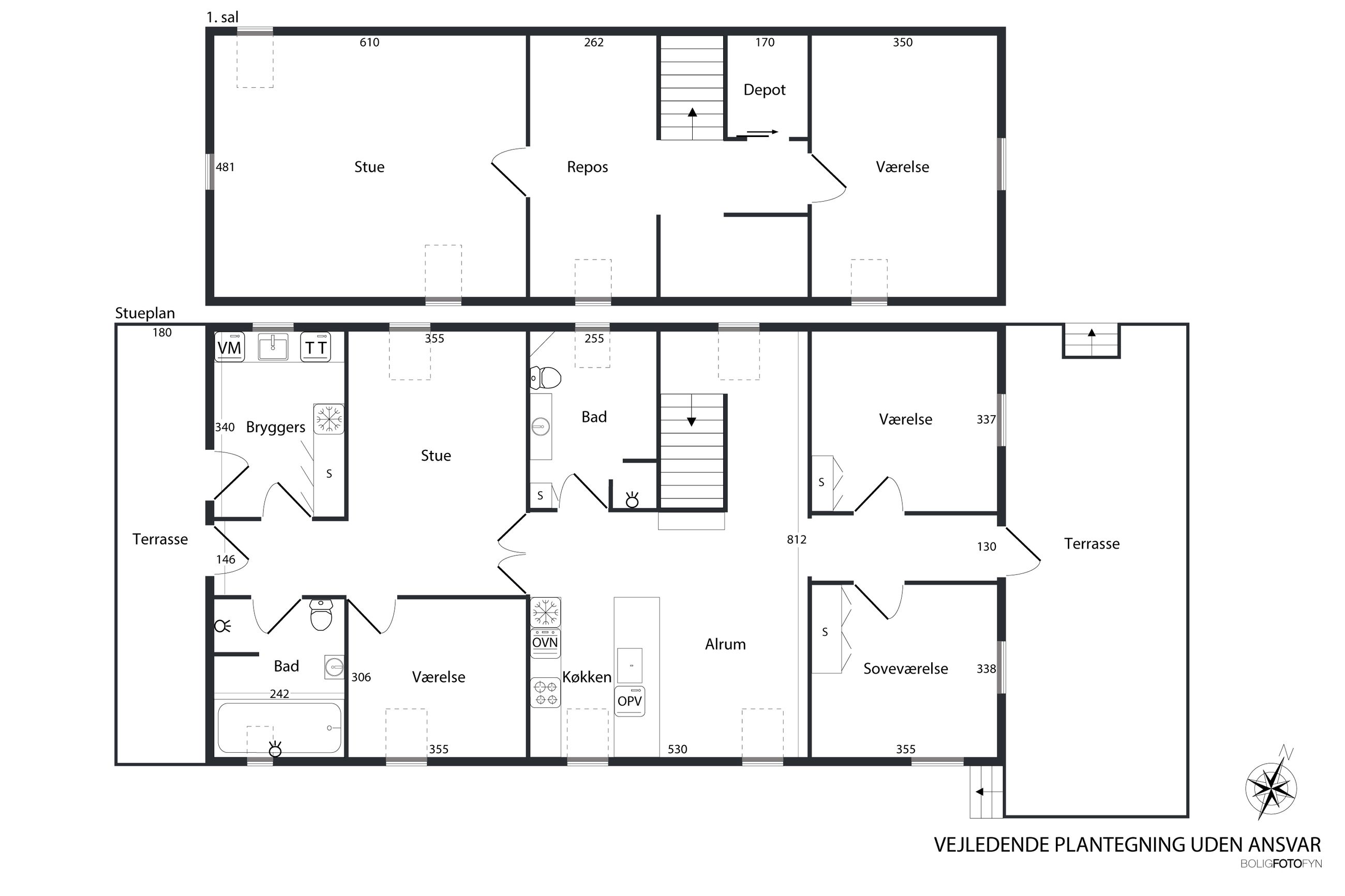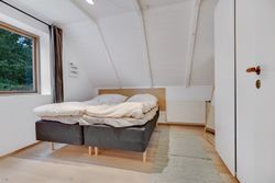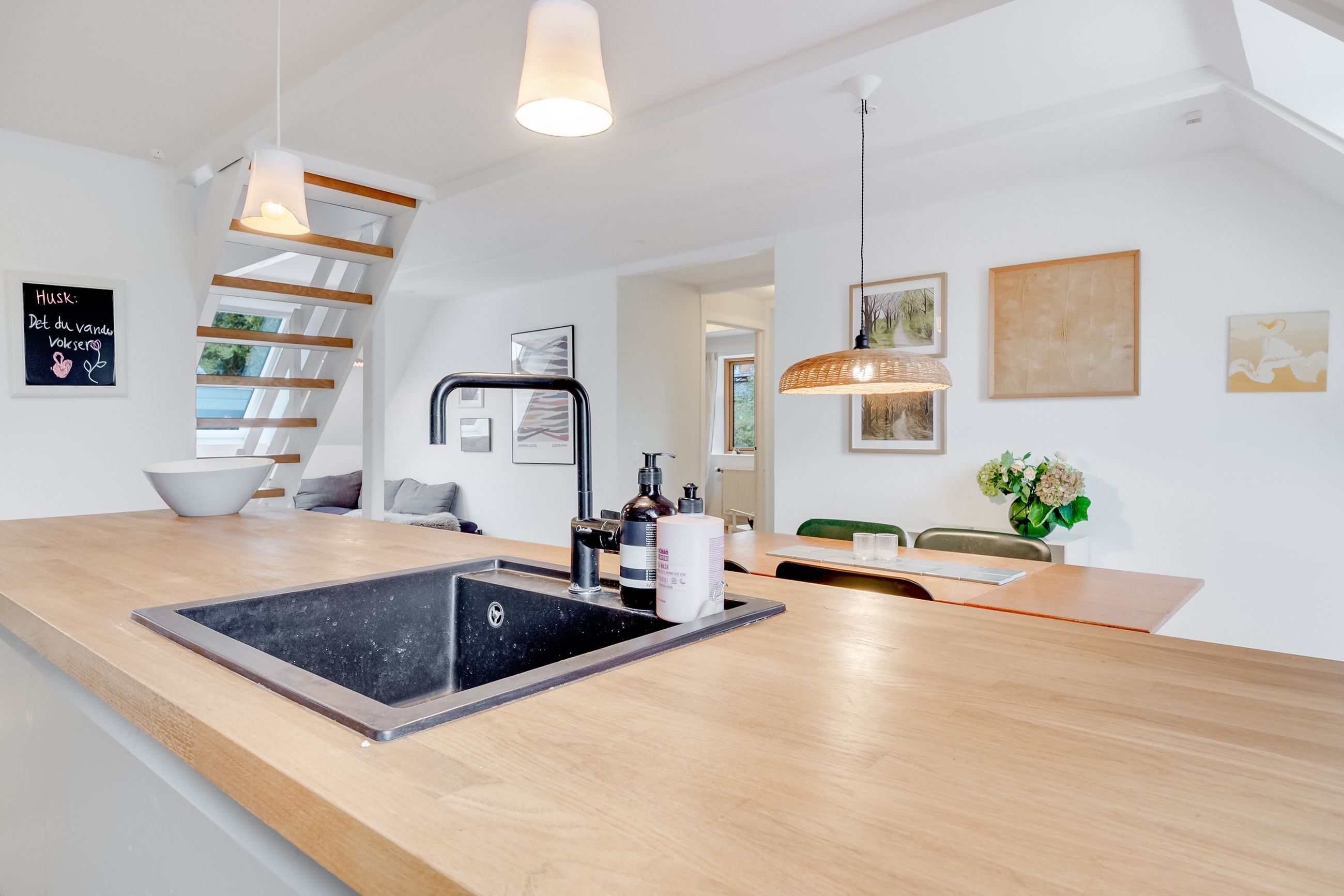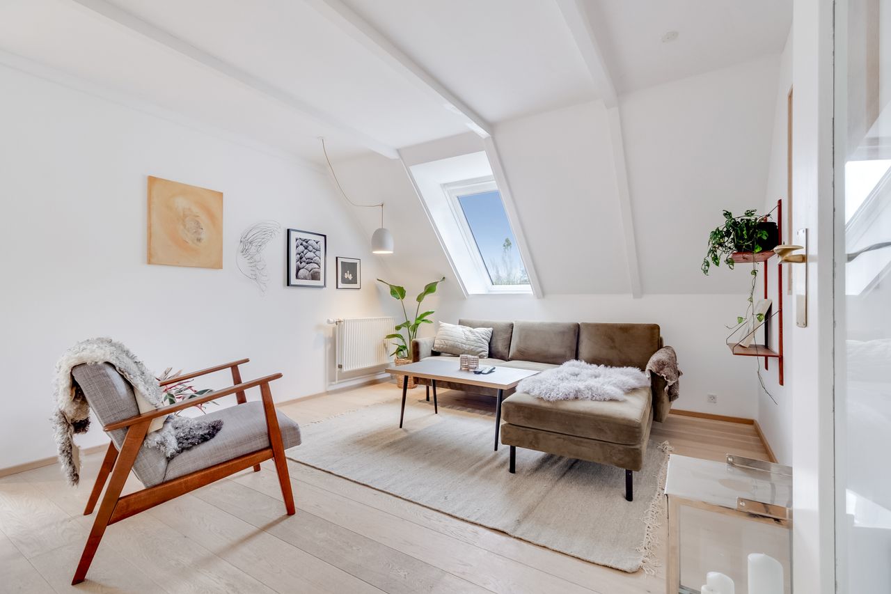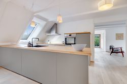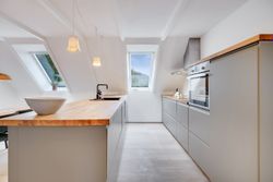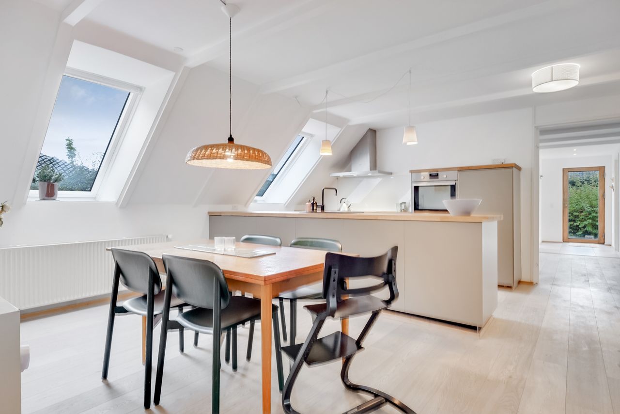 Køkken-alrummet har en åben indretning og har et dejligt lysindfald fra skråvinduerne. Køkkenet er opført med minimalistiske grå fronter, der skaber et moderne og stilfuldt udtryk. Træbordpladerne skaber en skøn kontrast af varme og sjæl. Her er der desuden god bordplads og alt, hvad du skal bruge af hårde hvidevarer. På den anden side af køkkenøen er der plads til at etablere en spiseafdeling, hvilket skaber et godt fundament for nærvær, når forældre laver mad, og børn laver lektier. Bagerst i rummet ligger et værelse og et soveværelse, der begge har god skabsplads og fremstår lyse.