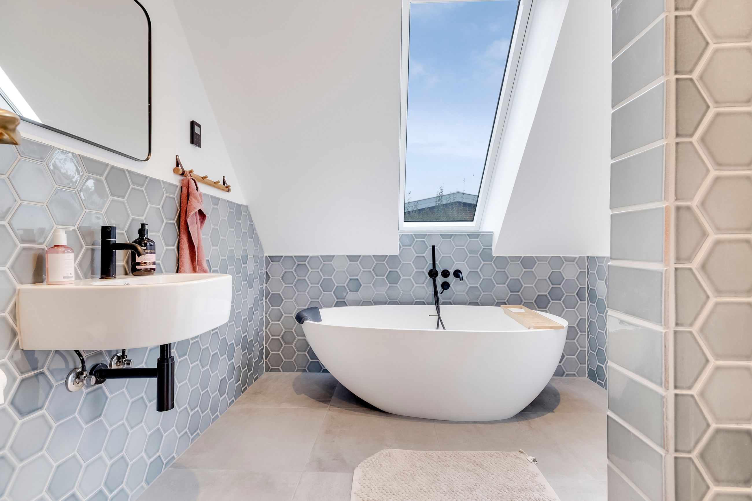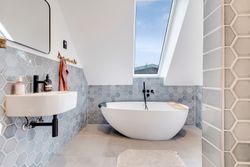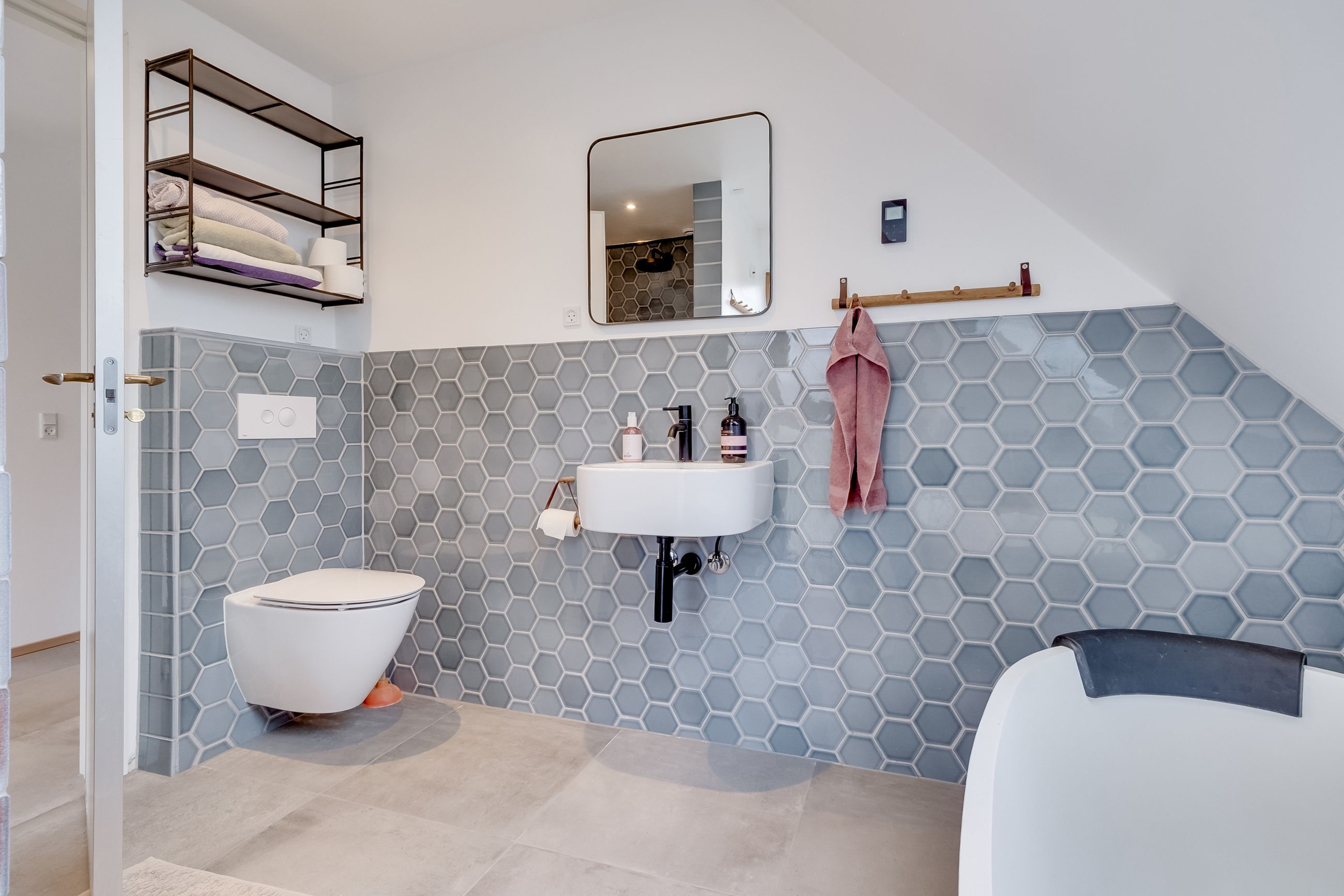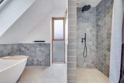 Modsat bryggerset er et badeværelse, der er indrettet med smukke grålige hexagon-mosaik, toilet, brus og et smukt fritstående badekar.