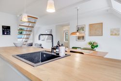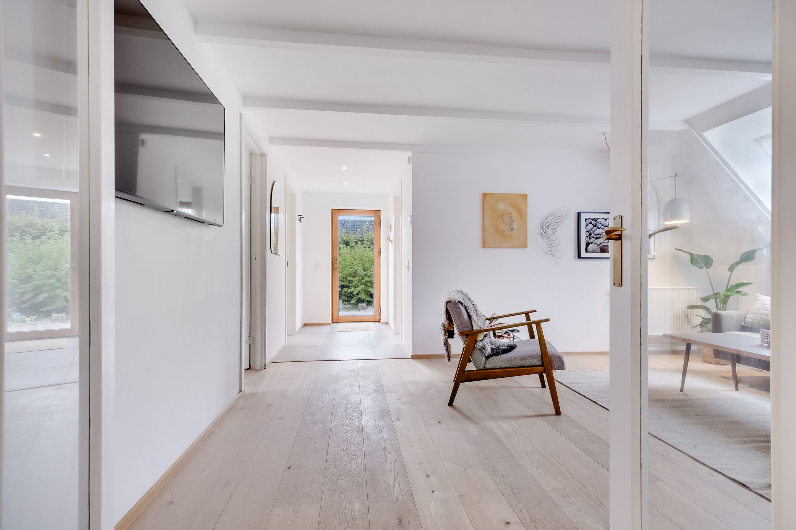 Når du træder ind i gangen, har du udsigt hele vejen ned gennem huset, hvilket skaber en følelse af luft og åbenhed. Huset er nymoderniseret, og generelt fremstår det meget lyst og stilrent med hvide flader, synlige spær og et smukt trægulv, der går igen på tværs af rum. Huset består af et køkken-alrum, to stuer, to badeværelser, et bryggers, et soveværelse og tre værelser.