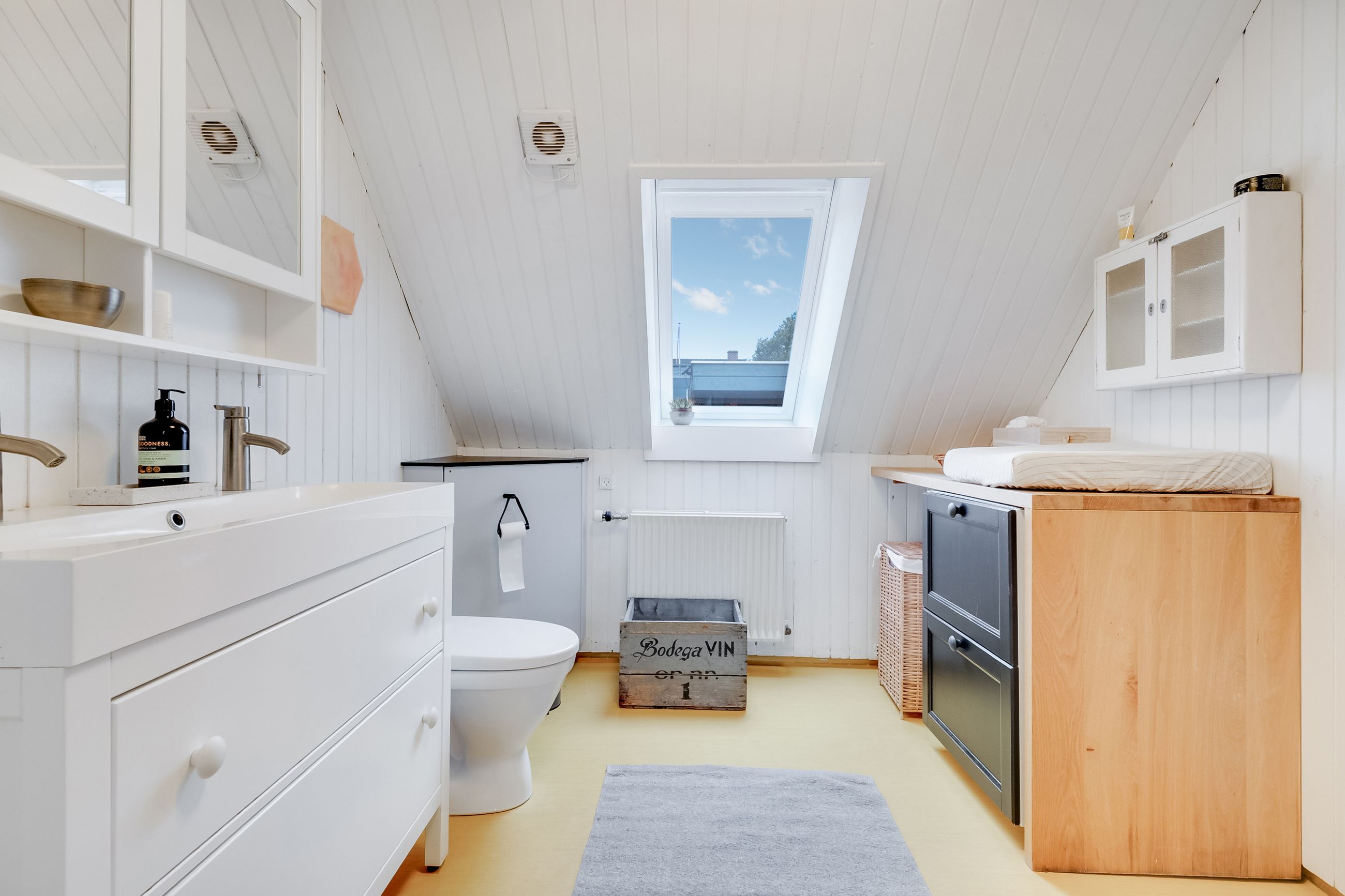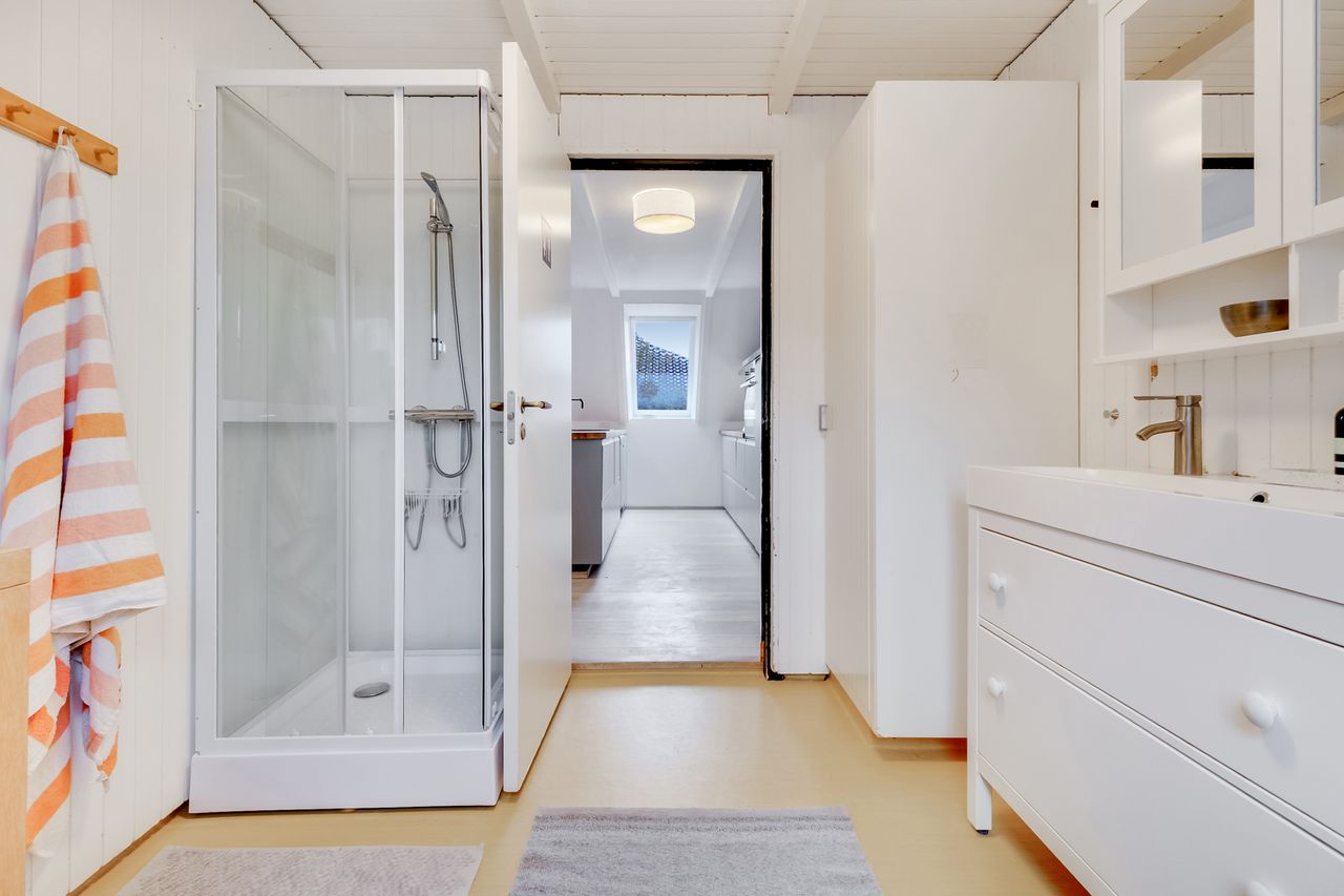 Overfor køkkenet ligger husets andet badeværelse - et hyggeligt rum med en varm farve på gulvet, bruseniche, samt god skabsplads.