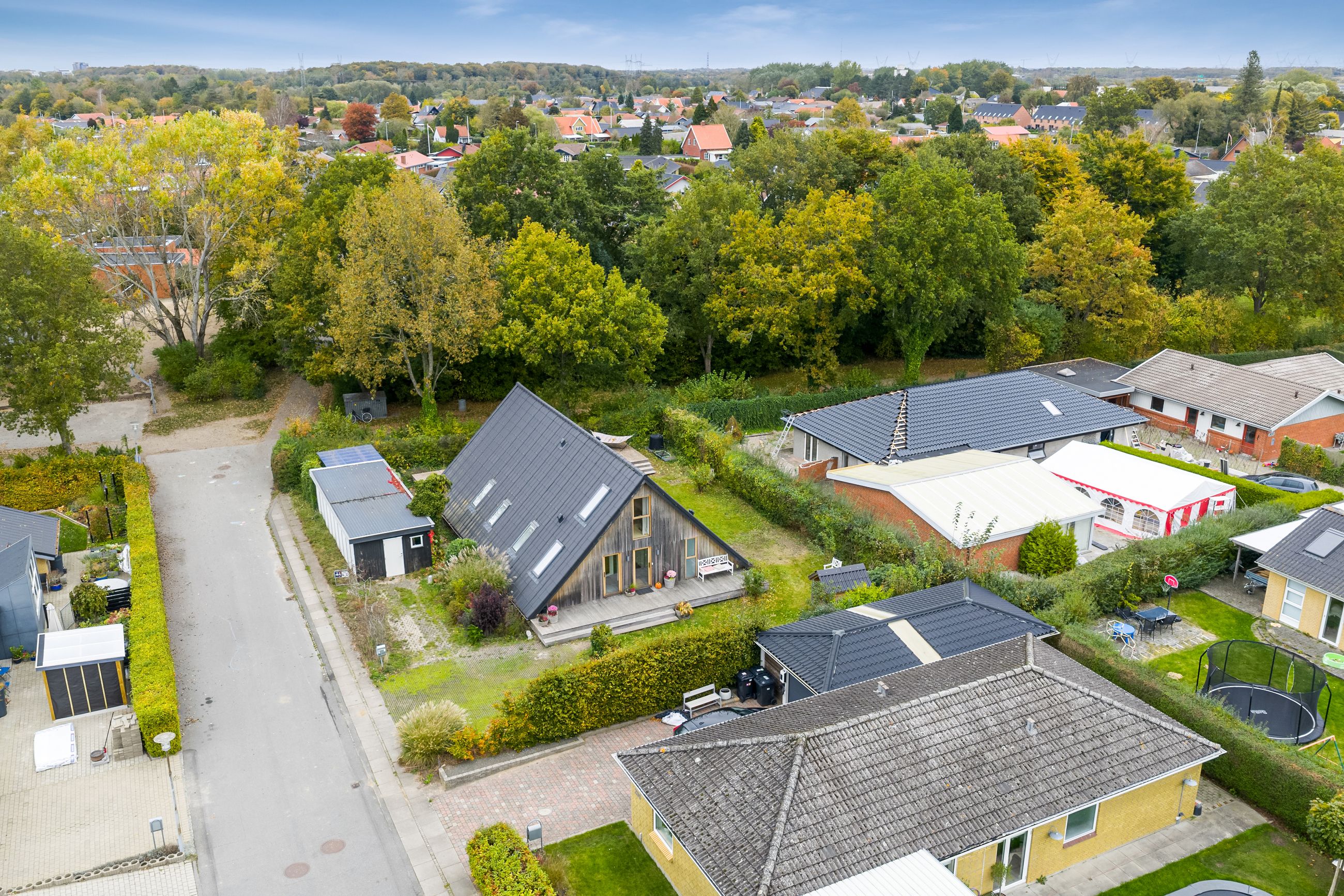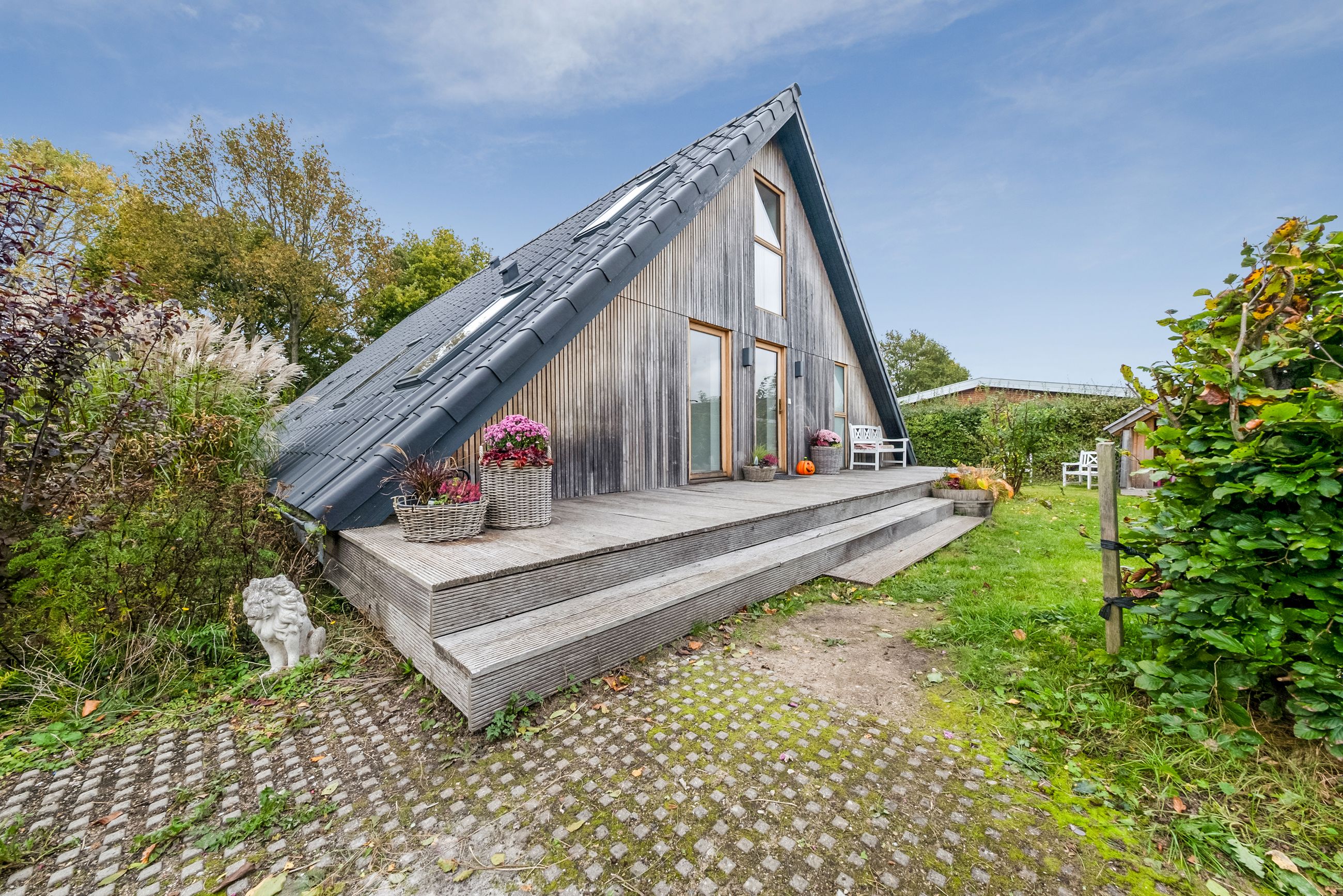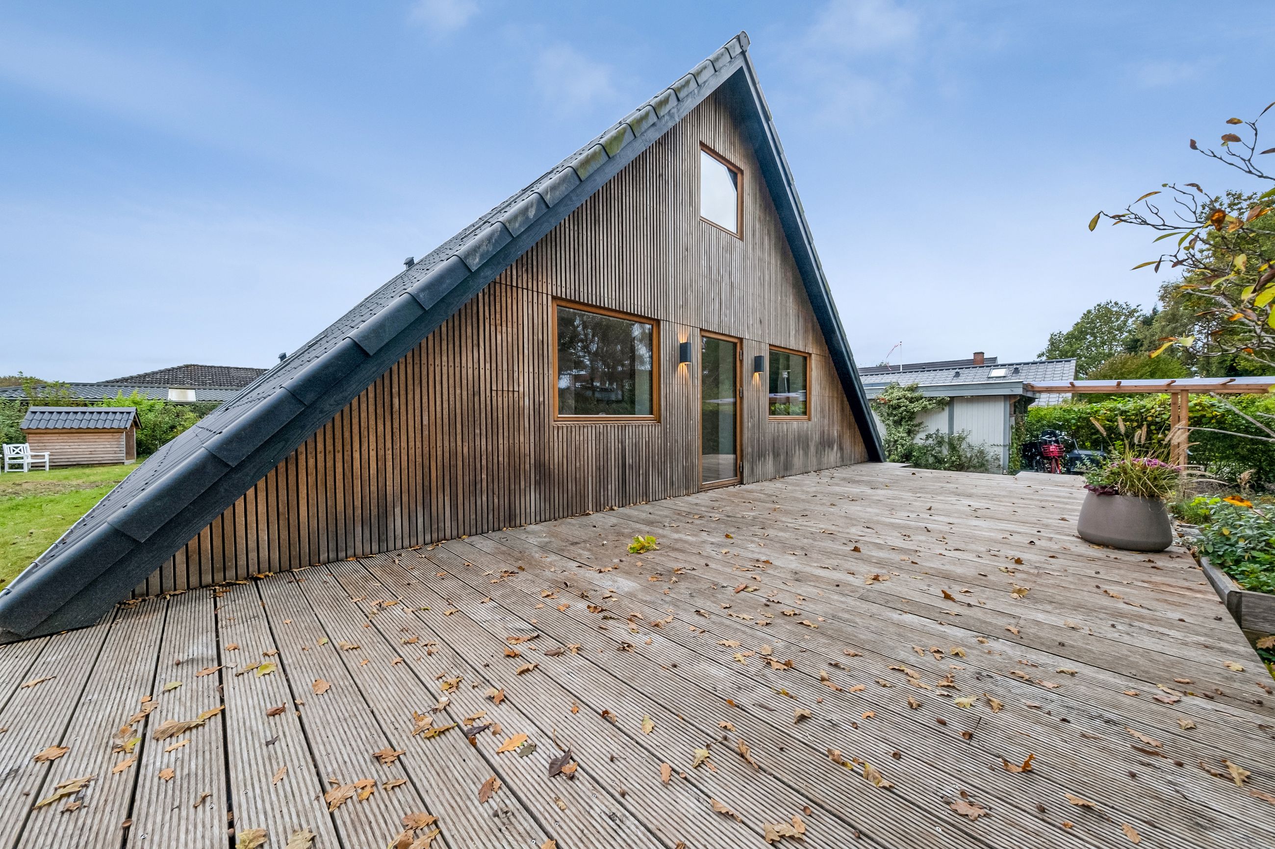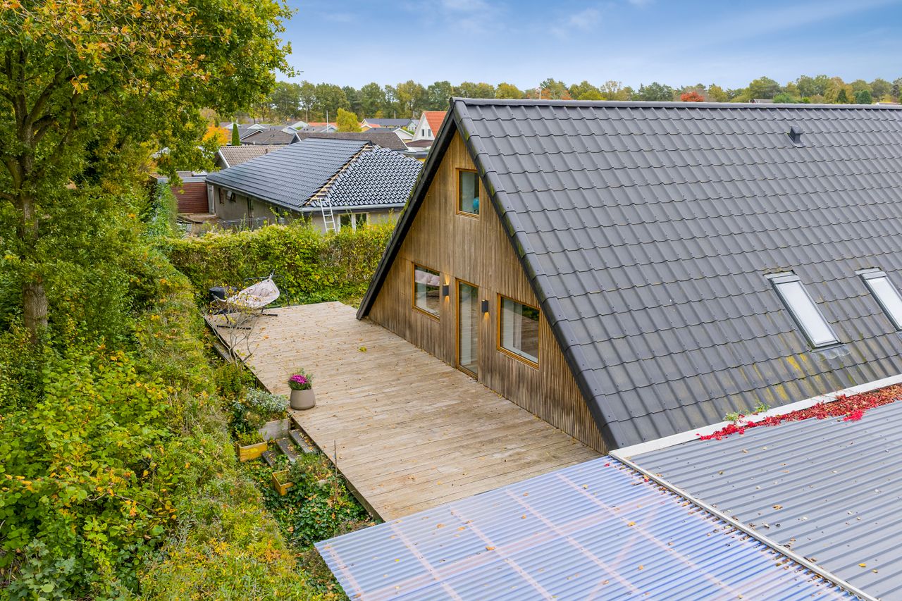 Tilbage køkkenet kan du nu træde ud på træterrassen, der ligesom facaden er opført i eg. Her kan du nyde den dejlige aftensol, der skaber en varm, gylden ramme om familiens aftensmåltid og hygge i sommerens sidste varme timer. Terrassen er en dejligt lukket oase, hvor du er skærmet af og kan nyde dit eget frirum. Haven er overskuelig med plæne, buske og blomster, samt sandkasse og legehus til de mindste i familien.