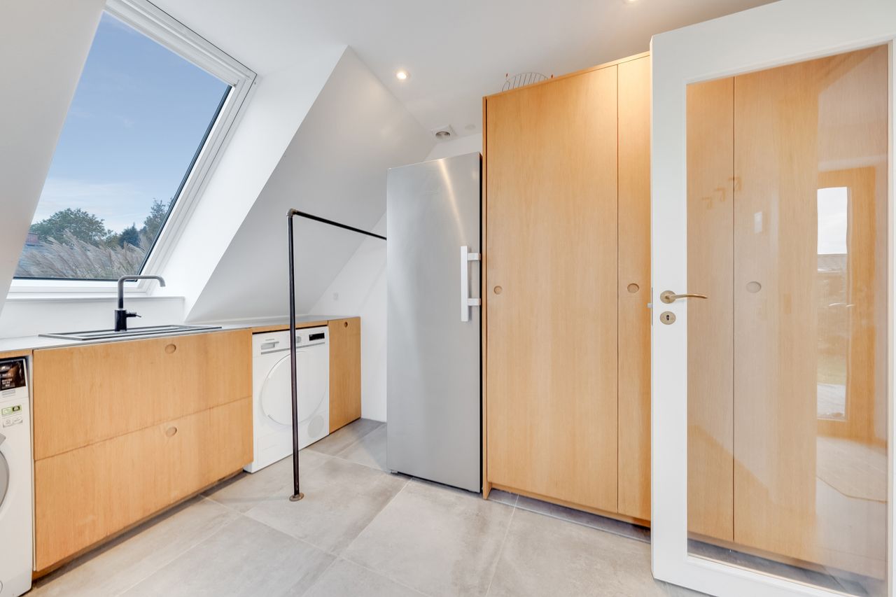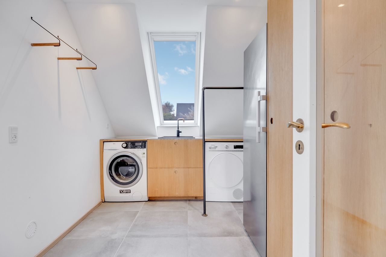 Til venstre i gangen ligger det smukke bryggers, der har både god skabsplads, samt plads til vaskemaskine og tørretumbler. Bryggerset formår at udnytte pladsen, og de smukke, egetræsfronter skaber en smuk kontrast til de grå fliser på gulvet.