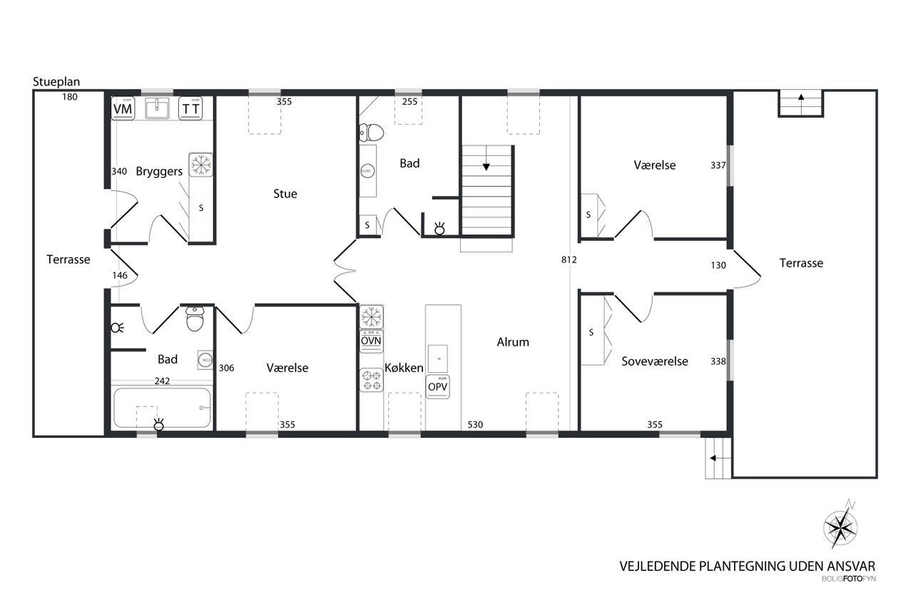 Gennem dobbeltdørene kommer du ind i leveafdelingen, der består af køkken-alrum, husets andet badeværelse, to værelser, samt trappe op til 1. sal.
