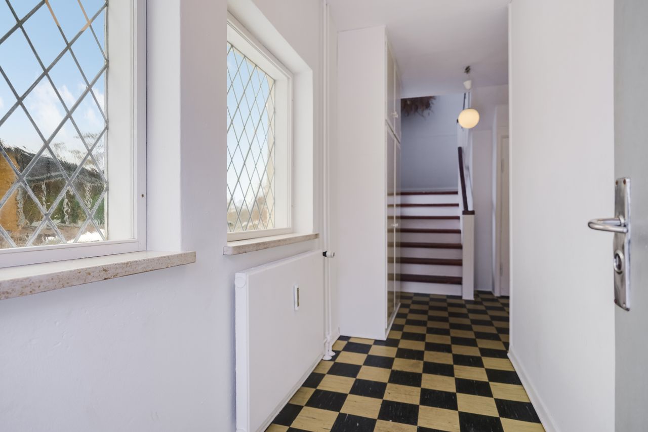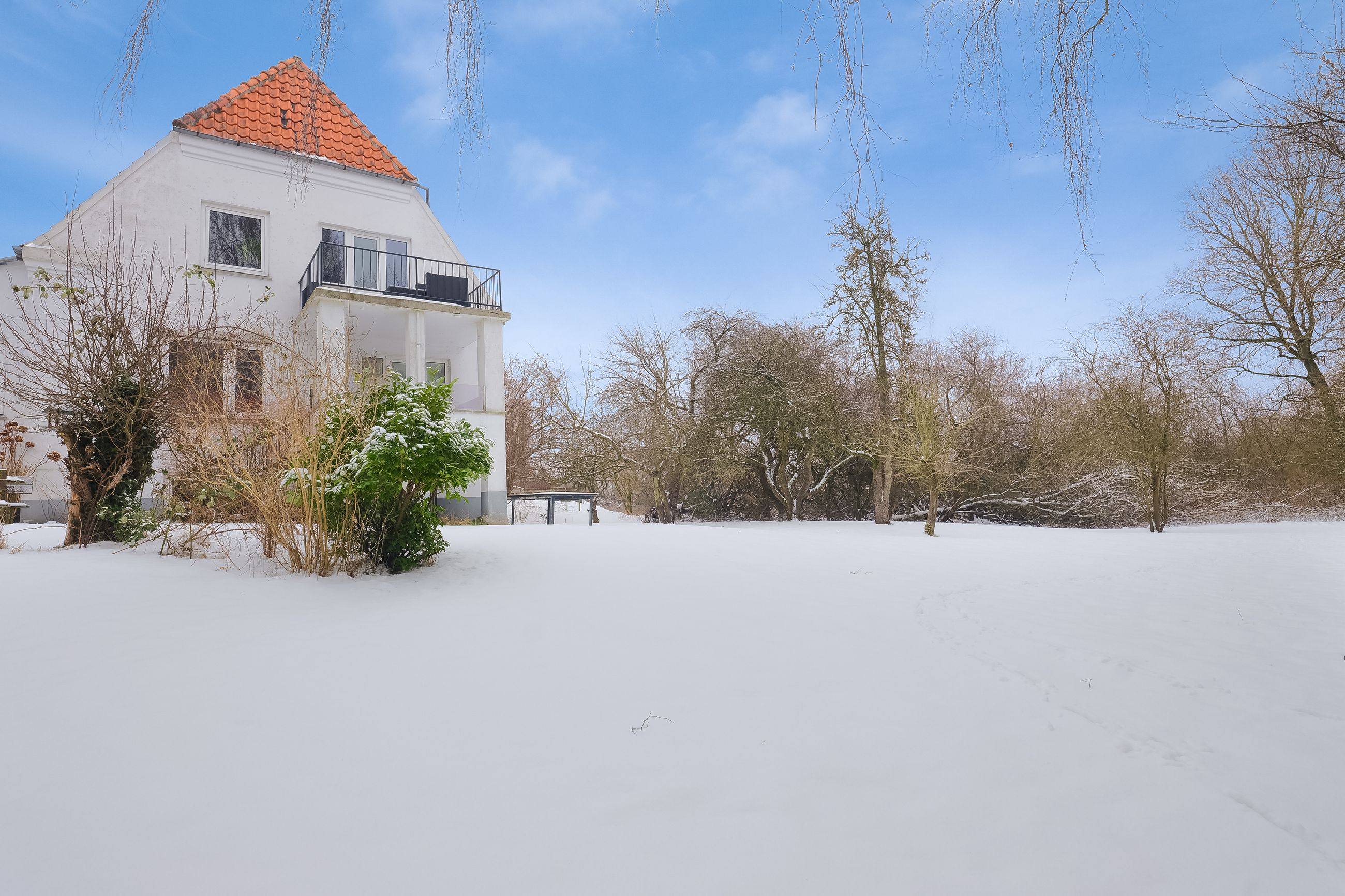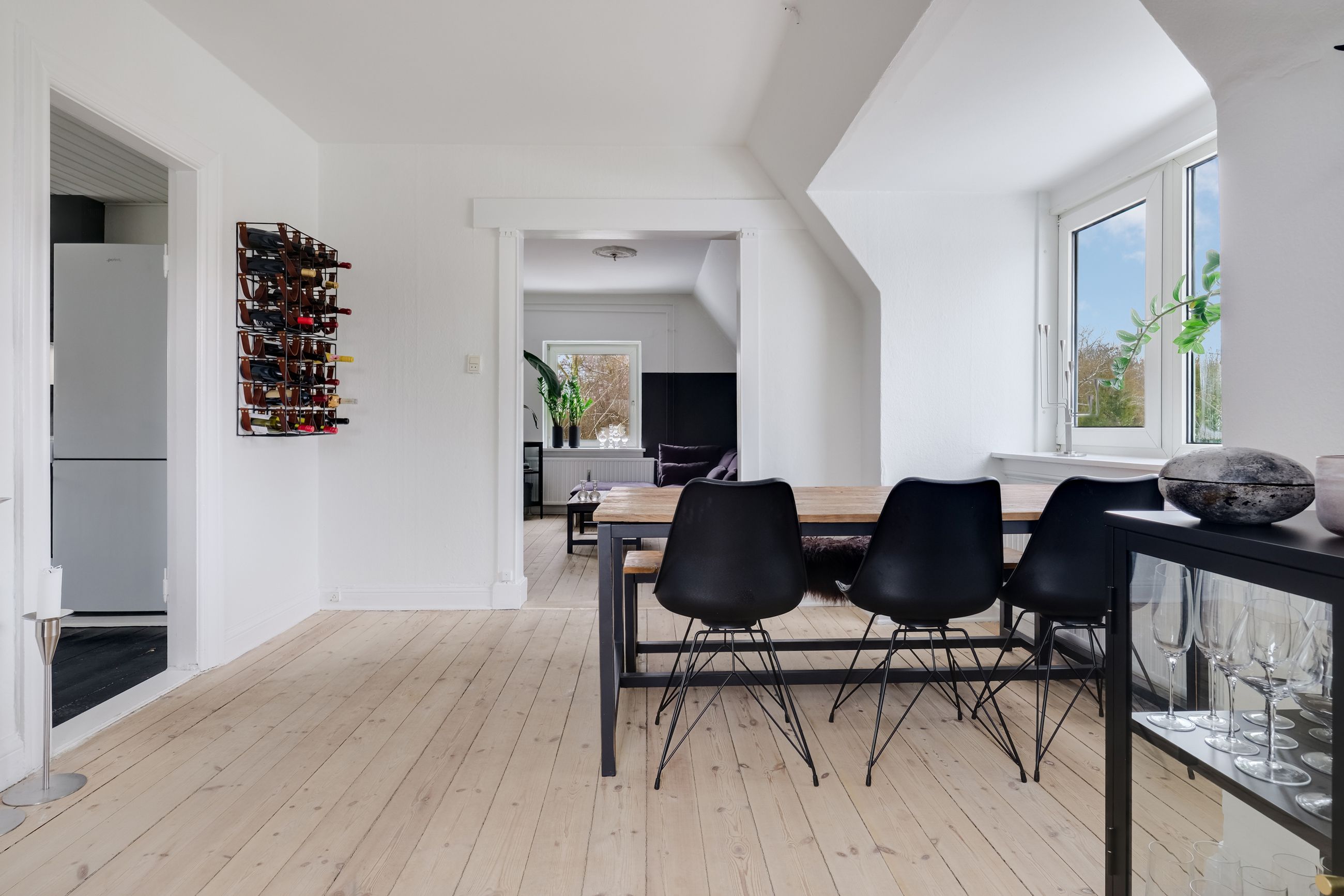 Indenfor bydes du velkommen i en entré med skakternet gulv og blyindfattede klare ruder, der skaber et elegant og klassisk indtryk. I stueplan finder du den ene lejlighed med stue og spisestue en suite samt køkken i forlængelse af spisestuen. Smukke plankegulve giver varme og karakter til rummene. Fra stuen er der adgang til en udestue, der fungerer som et ekstra opholdsrum, samt til soveværelset med udgang til veranda og et badeværelse holdt i hvidt.