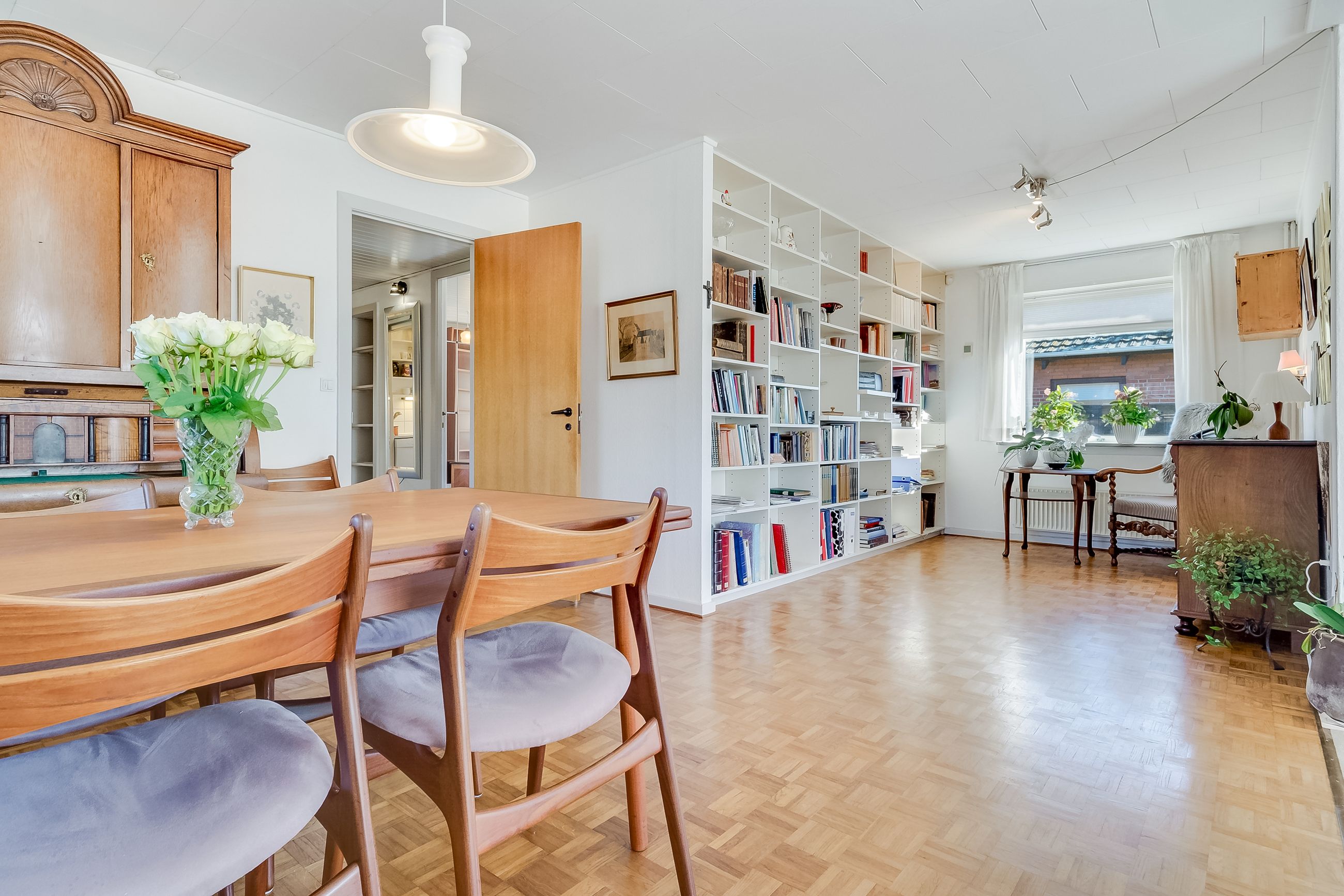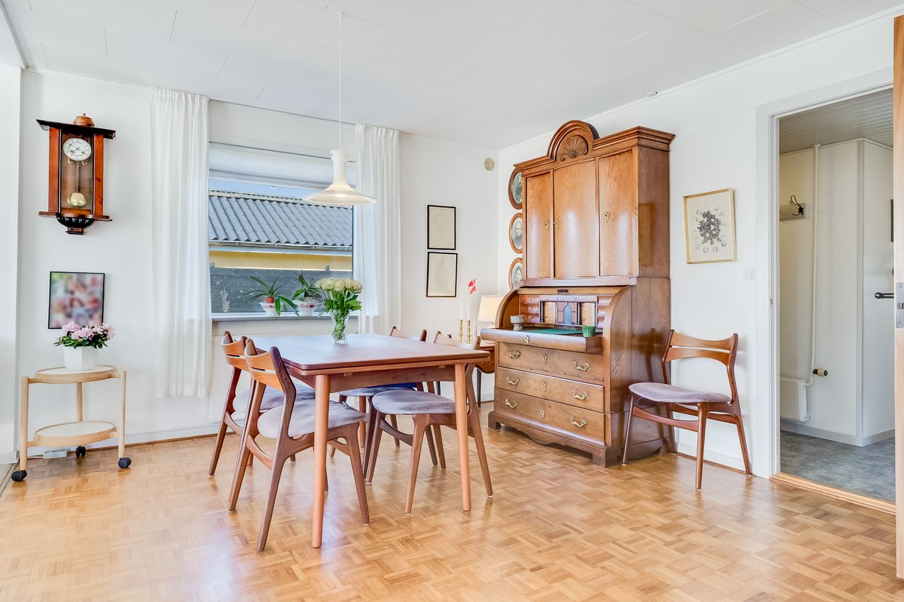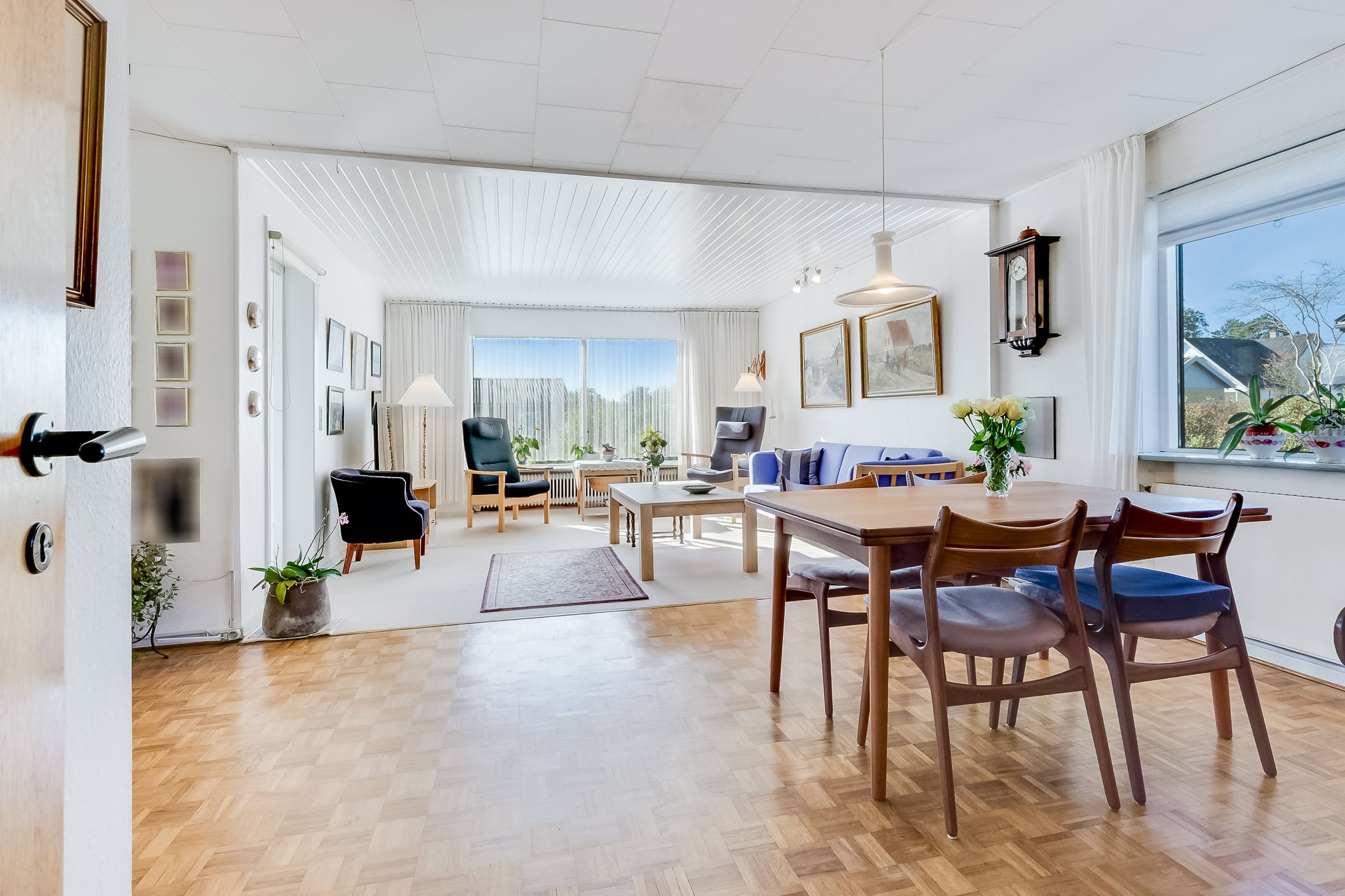 Stuen er husets hjerte. Her strømmer lyset ind gennem det sydvendte glasparti, der får det smukke franske fletparketgulv til at træde i karakter. Planløsningen giver plads til både spisestue, tv-arrangement og bogreoler - perfekt til samvær og nærvær i familien på tværs af behov og aktiviteter.