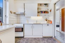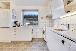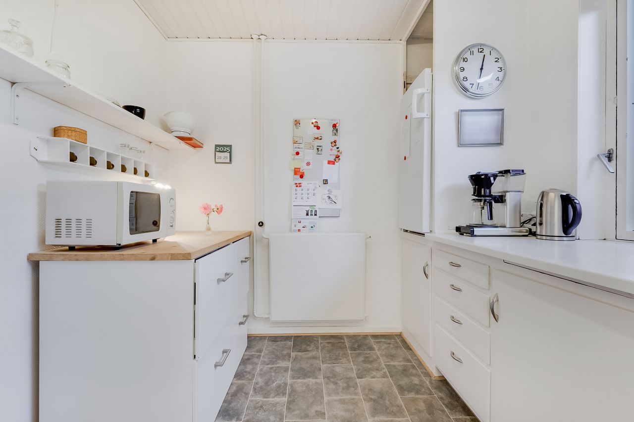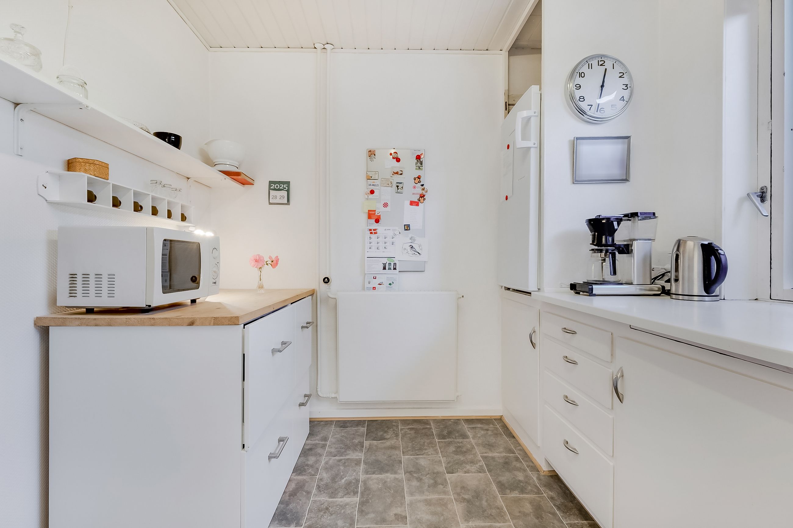Køkkenet er lyst og venligt med små referencer til 1960'erne. Indretningen er enkel, funktionel og tilbyder et sted, hvor hverdagen føles rolig og overskuelig.
