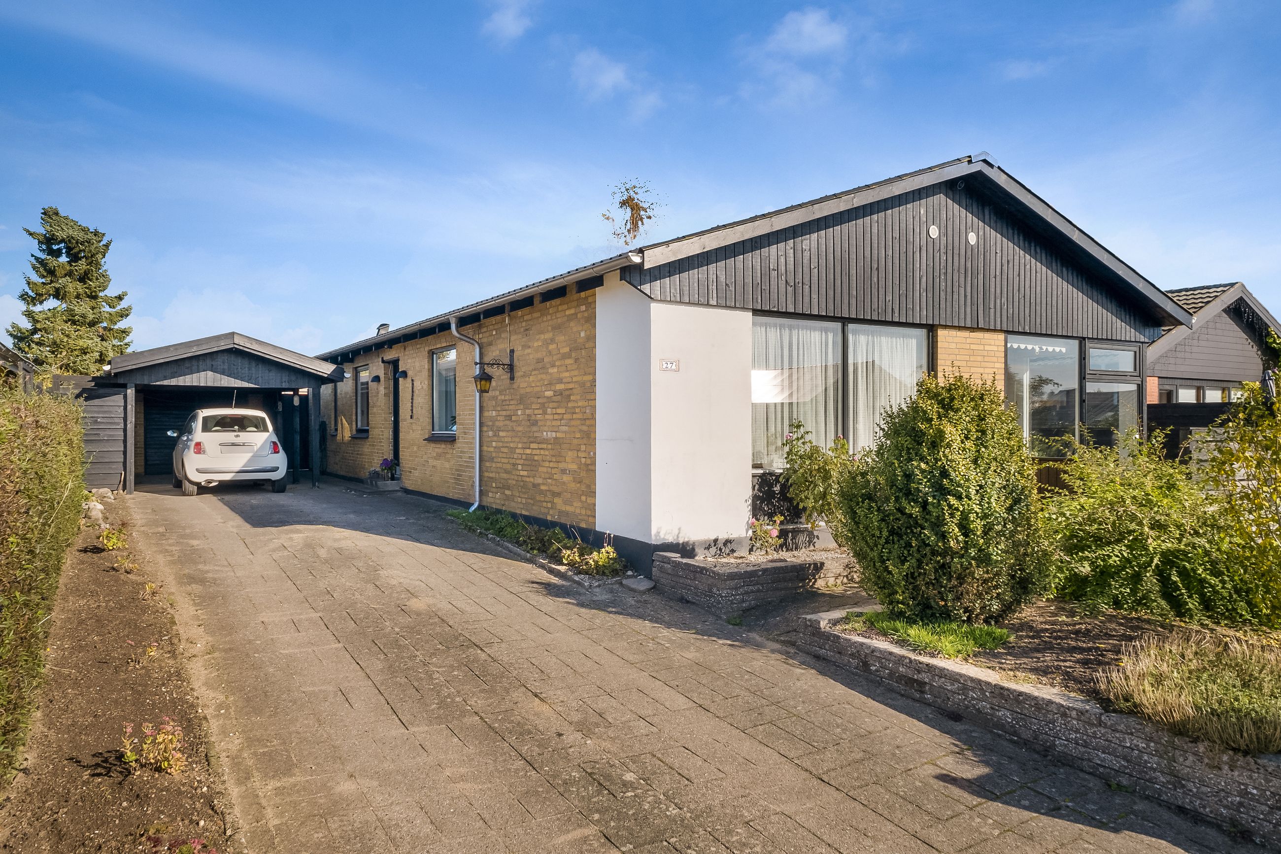 Når du ankommer ved huset, kan du parkere bilen i carporten, hvorfra du nemt kan komme ind med indkøbsvarer og skoletasker.