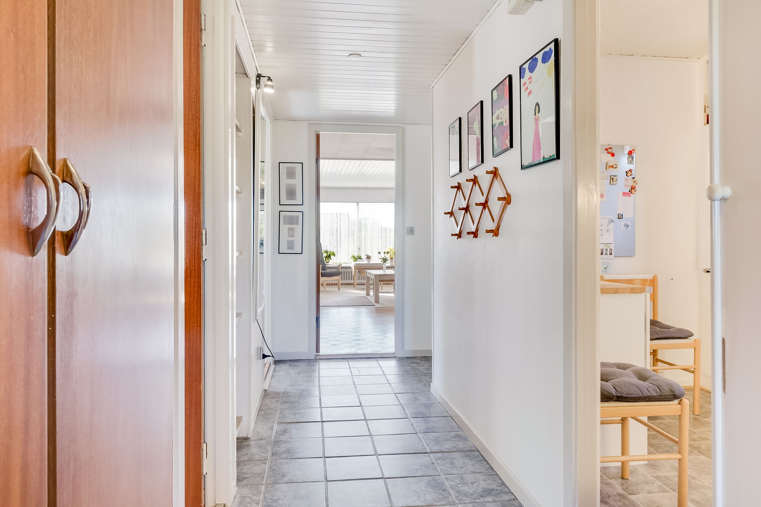 Entréen og fordelingsgangen fremstår lys og er praktisk indrettet med lyse klinker, der gør det nemt at holde rent, når børn og voksne træder ind med fugtige efterårssko. Entreen åbner op for køkken, stue, bad, bryggers, to værelser og et soveværelse.