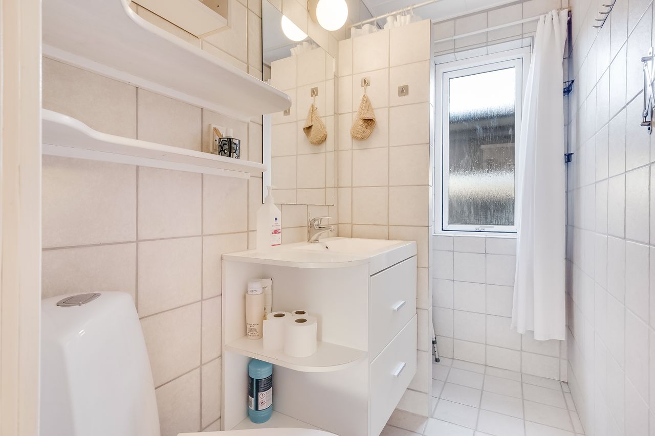 Badeværelset har en ligetil indretning med lyse badeværelsesmøbler og klinker, samt et vindue med matteret glas, der sikrer både privatliv og lysindfald.