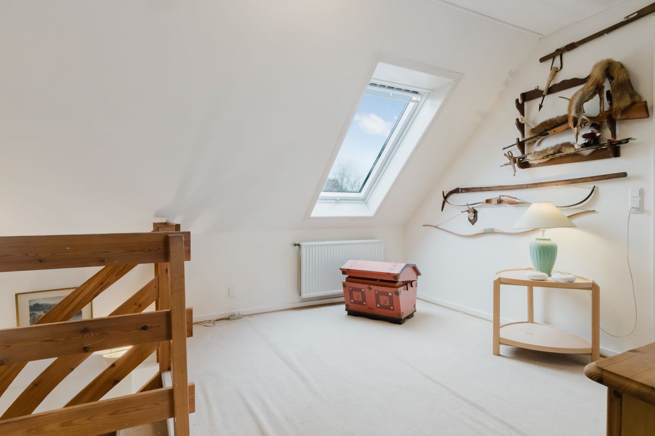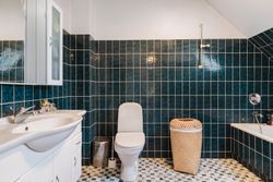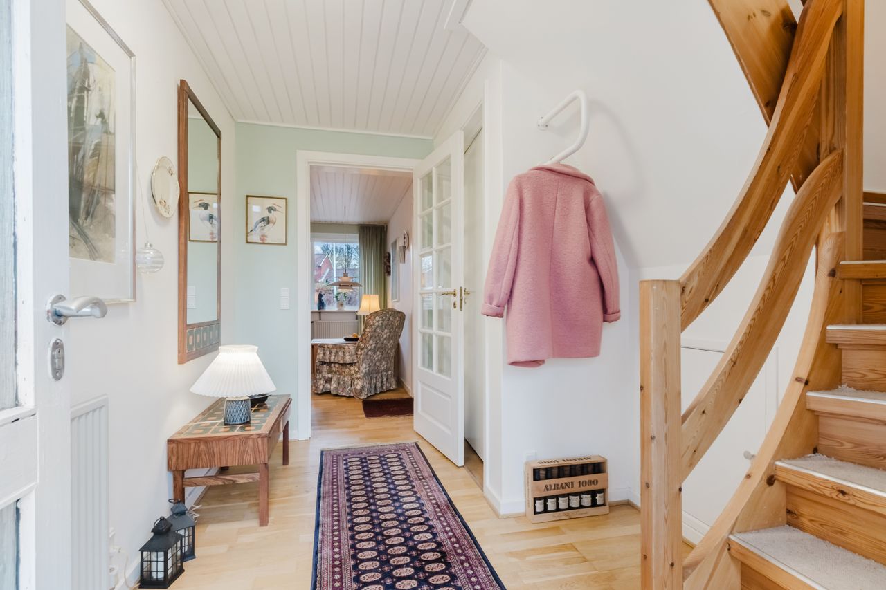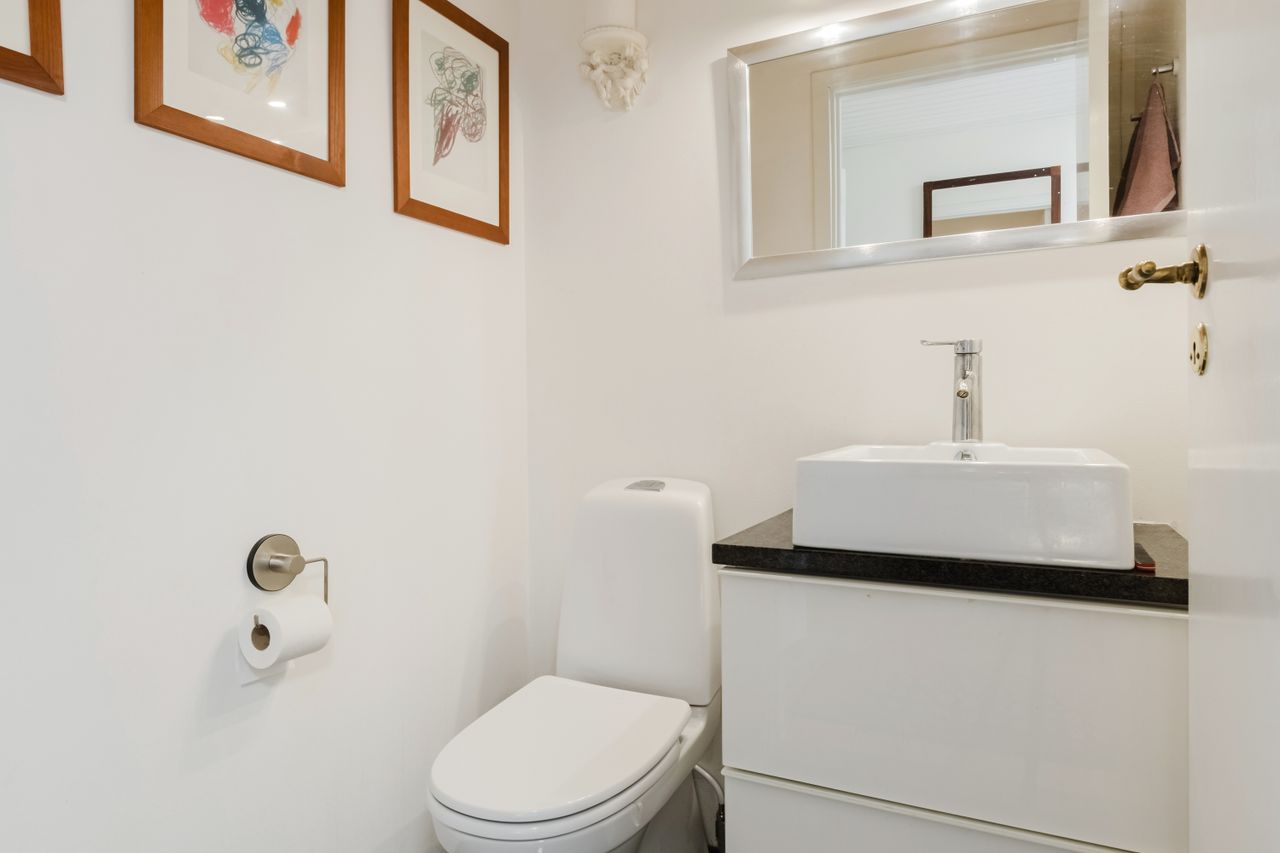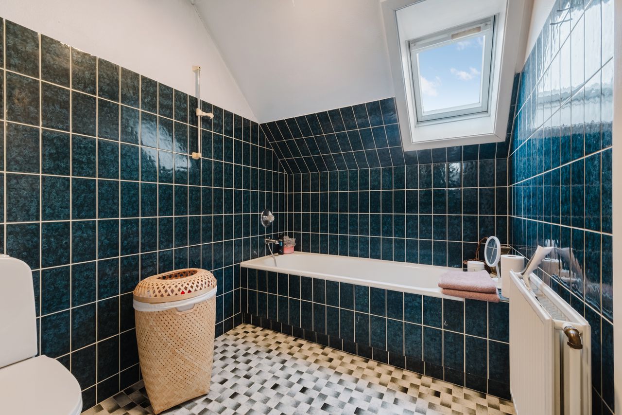 I entréen finder du et godt gæstetoilet, samt trappe op til en repos, der åbner op til 4 værelser og et badeværelse. Badeværelset er indrettet med badekar og god opbevaringsplads. Ovenlysvinduet giver lys og rummelighed, mens de smukke mørkegrønne klinker giver rummet karakter og personlighed.