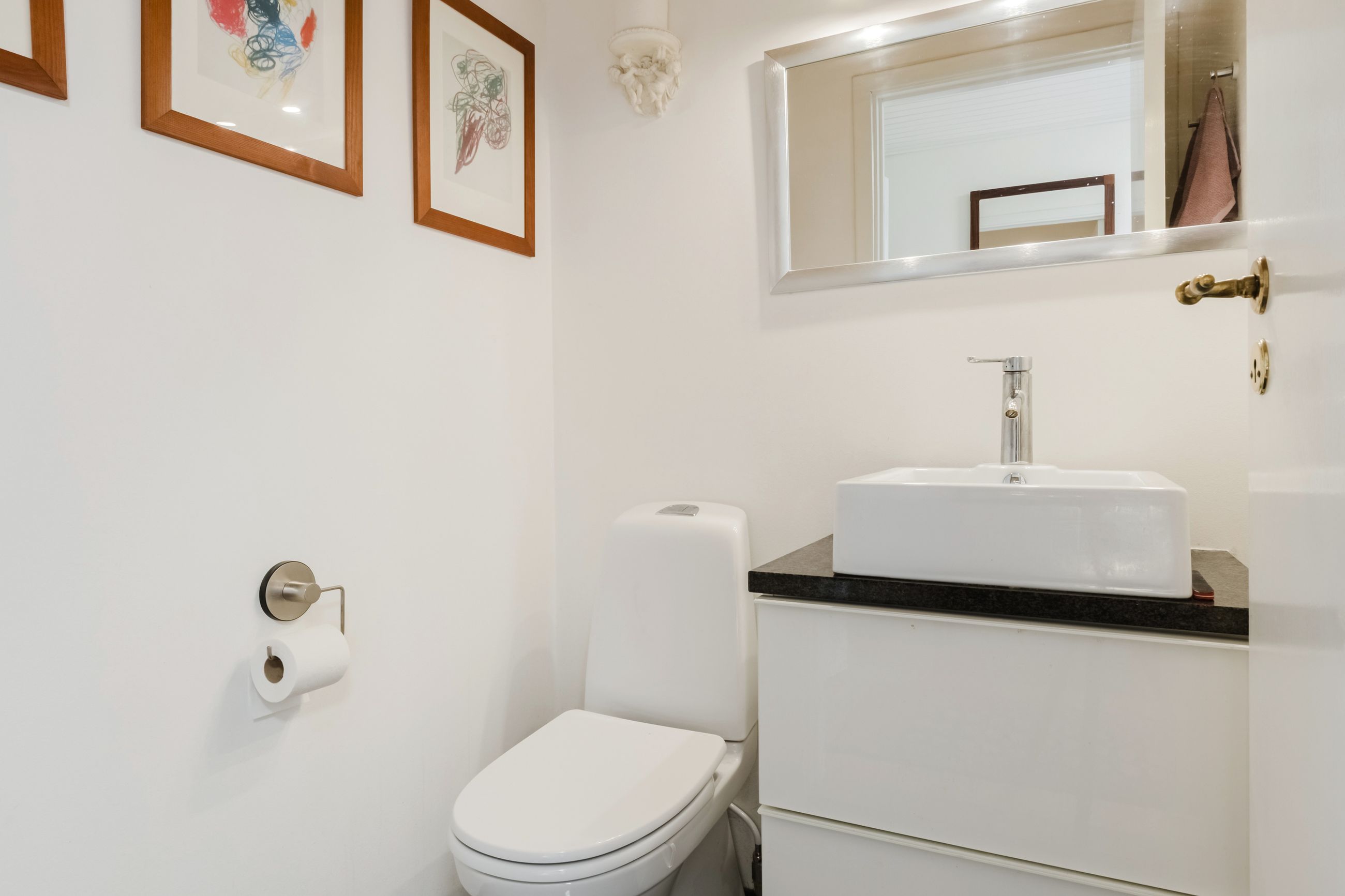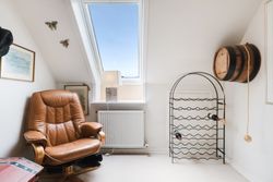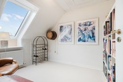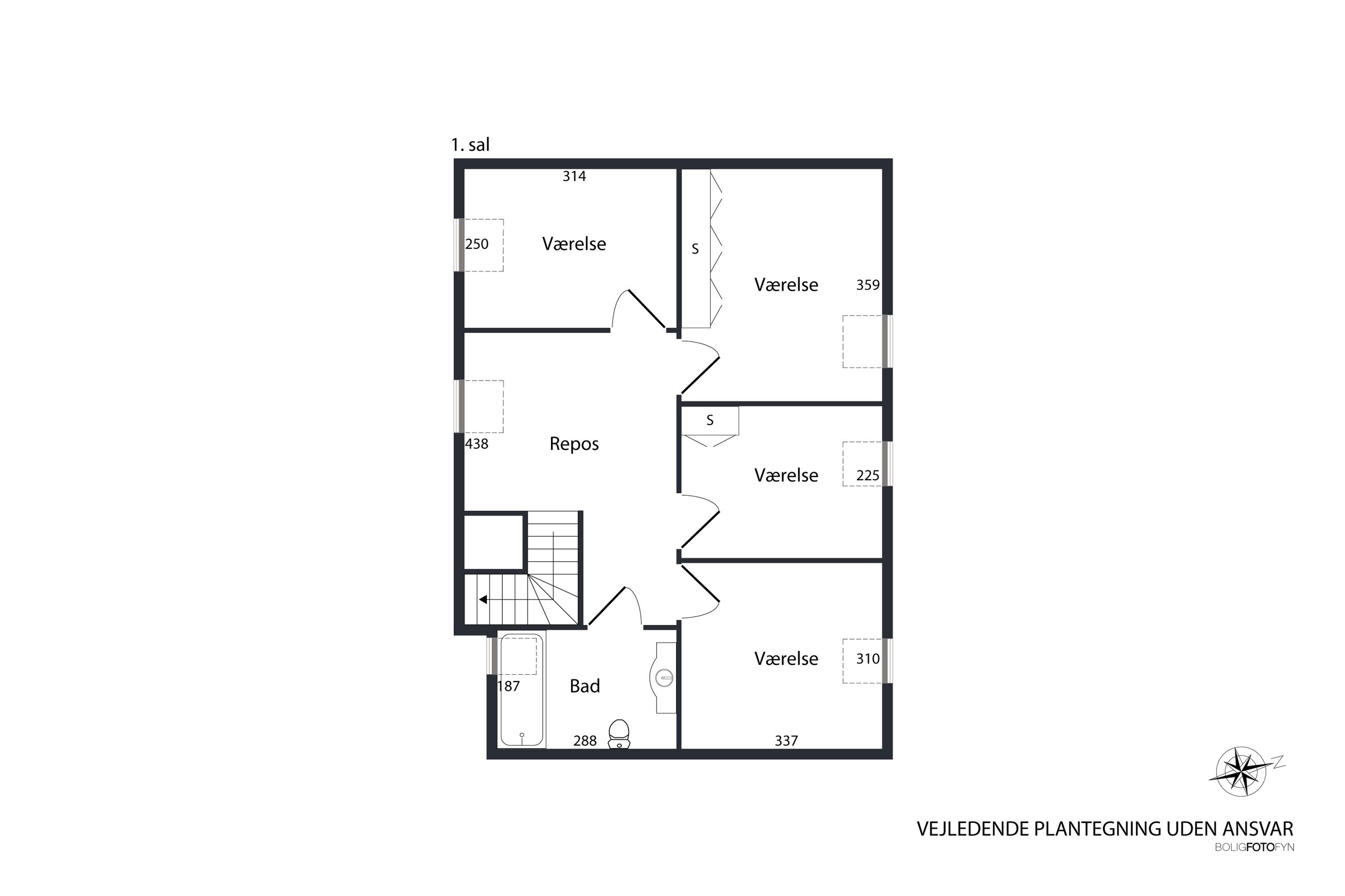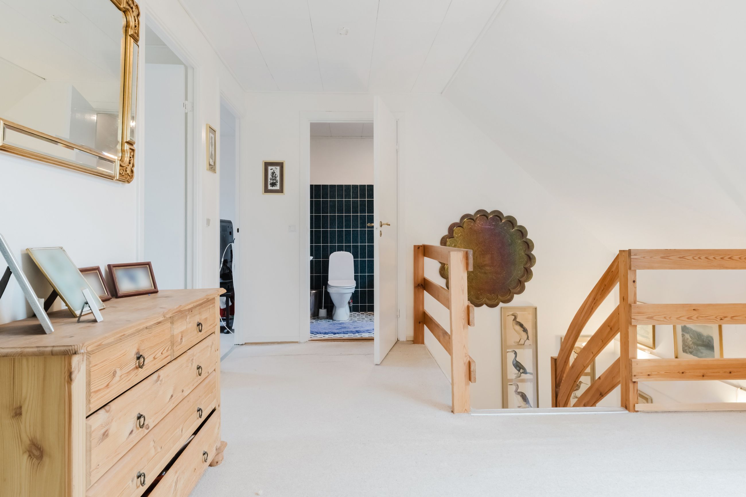 I entréen finder du et godt gæstetoilet, samt trappe op til en repos, der åbner op til 4 værelser og et badeværelse. Badeværelset er indrettet med badekar og god opbevaringsplads. Ovenlysvinduet giver lys og rummelighed, mens de smukke mørkegrønne klinker giver rummet karakter og personlighed.