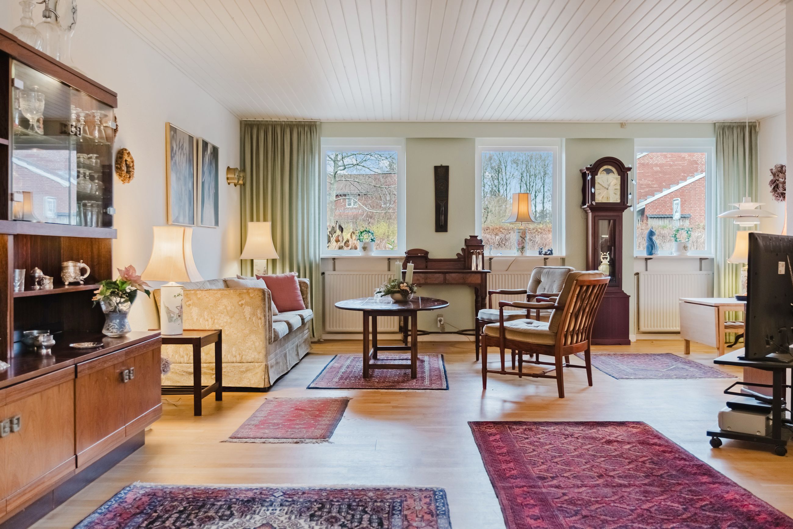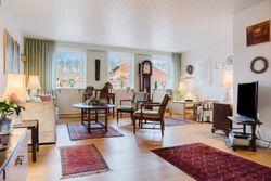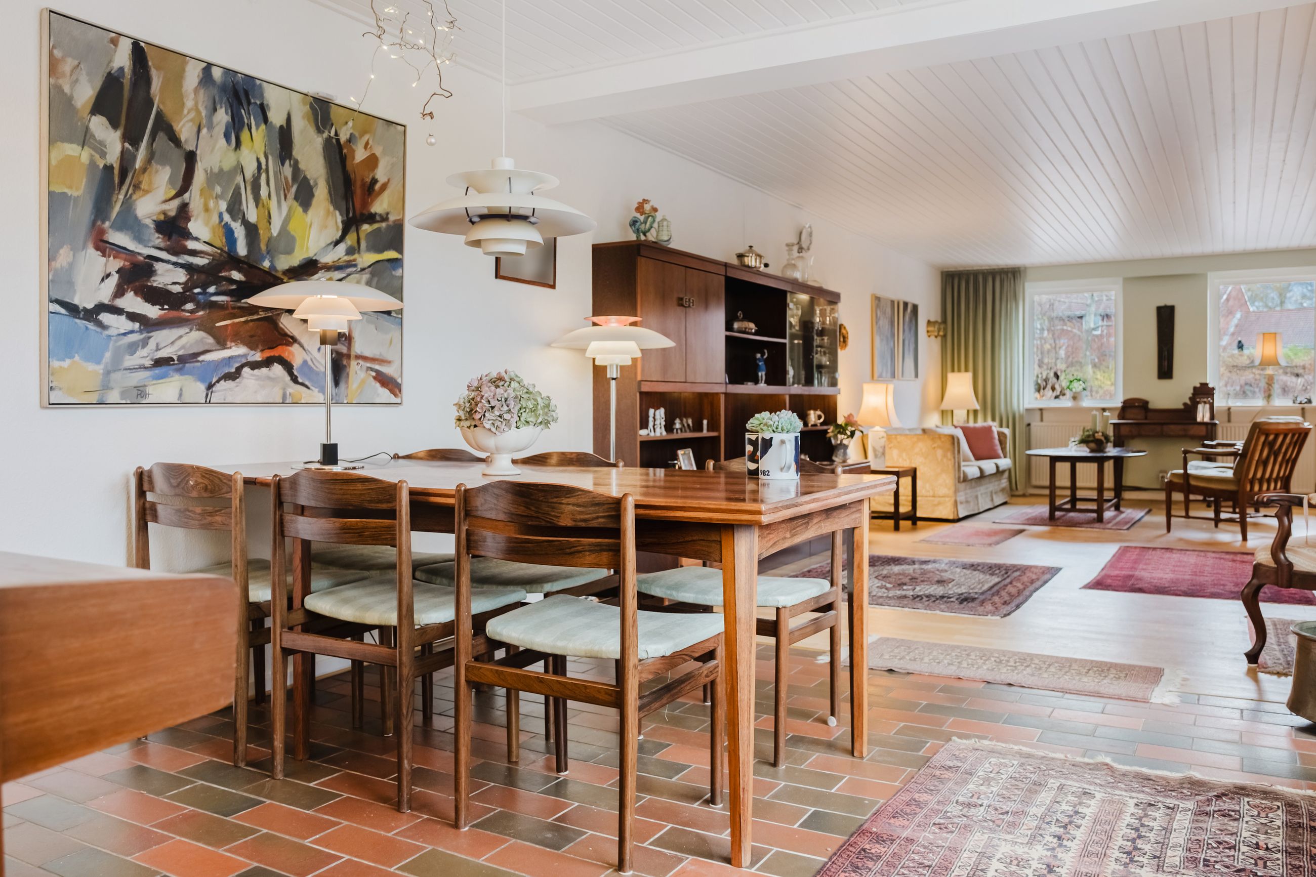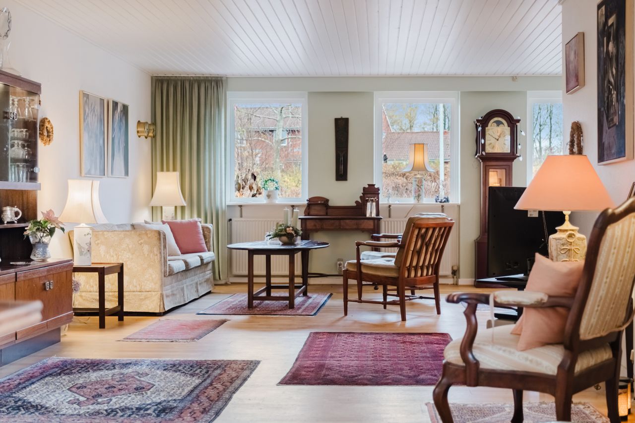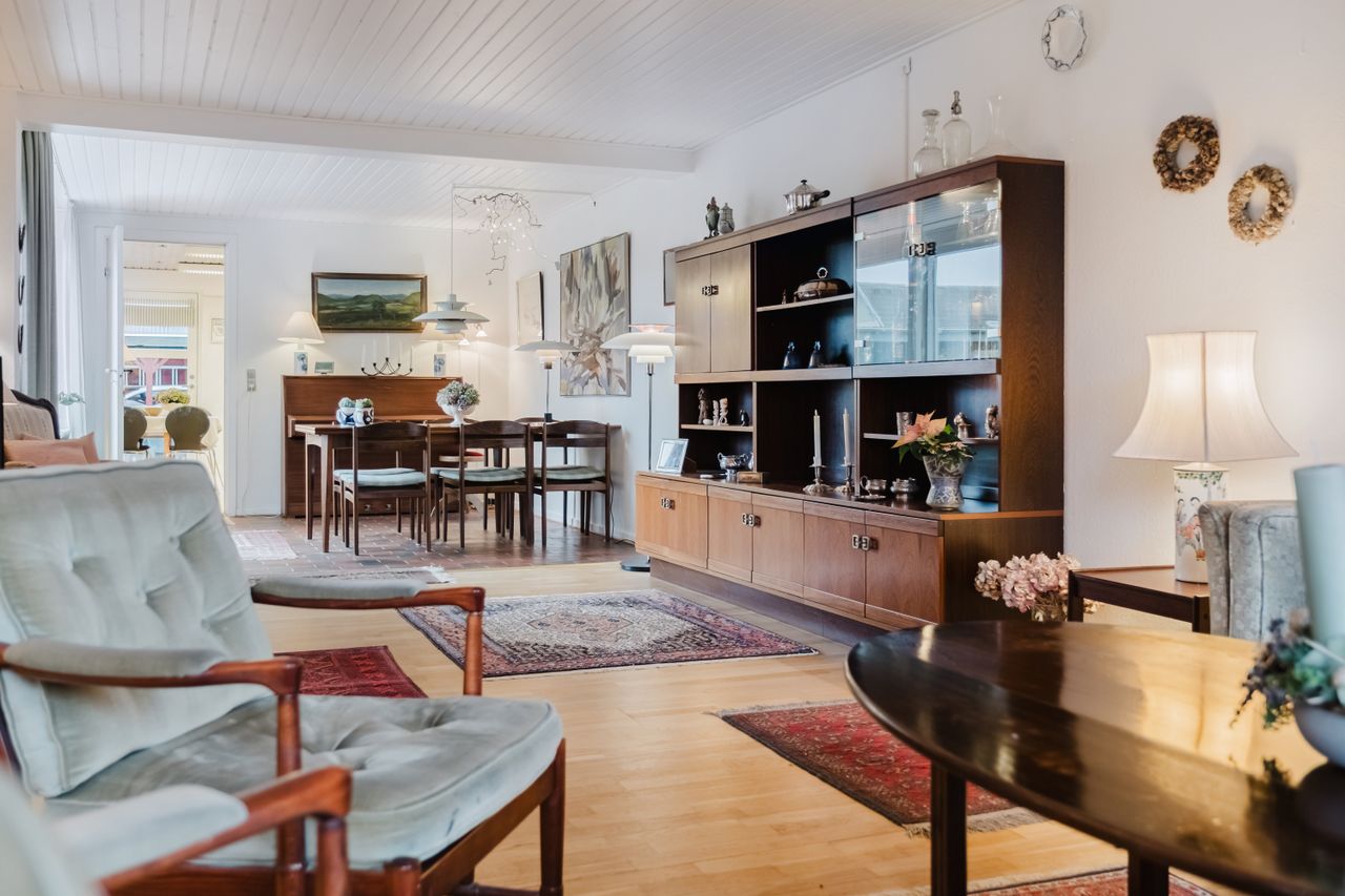 Stuen udgør husets hjerterum. Den åbne planløsning giver mulighed for forskellige zoner: sofahygge og loungeområde, en læsekrog og en mere formel spisestue med plads til venner og familie. Rummet fyldes af naturligt lys, og fra stuen er der direkte udgang til den sydvendte terrasse.