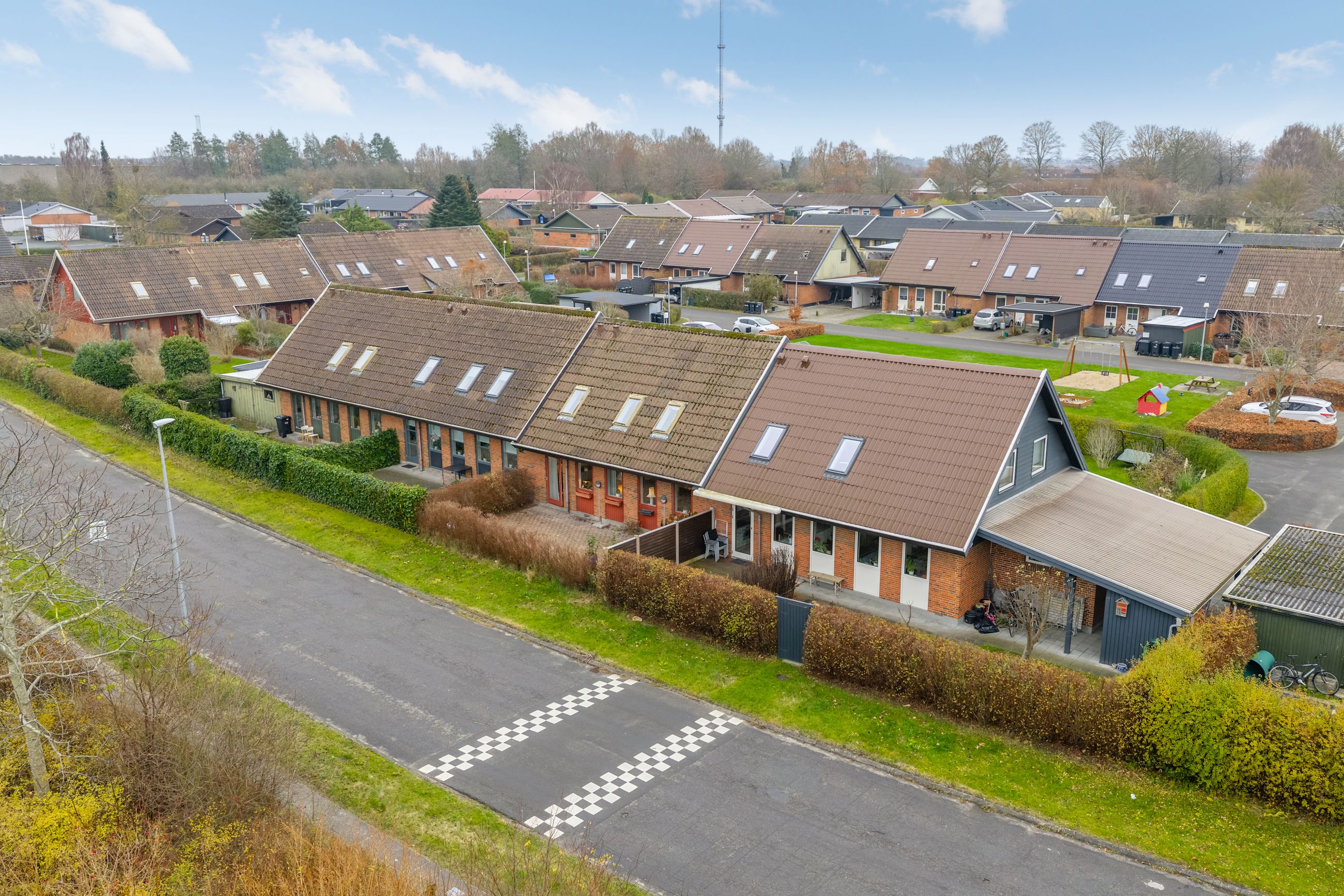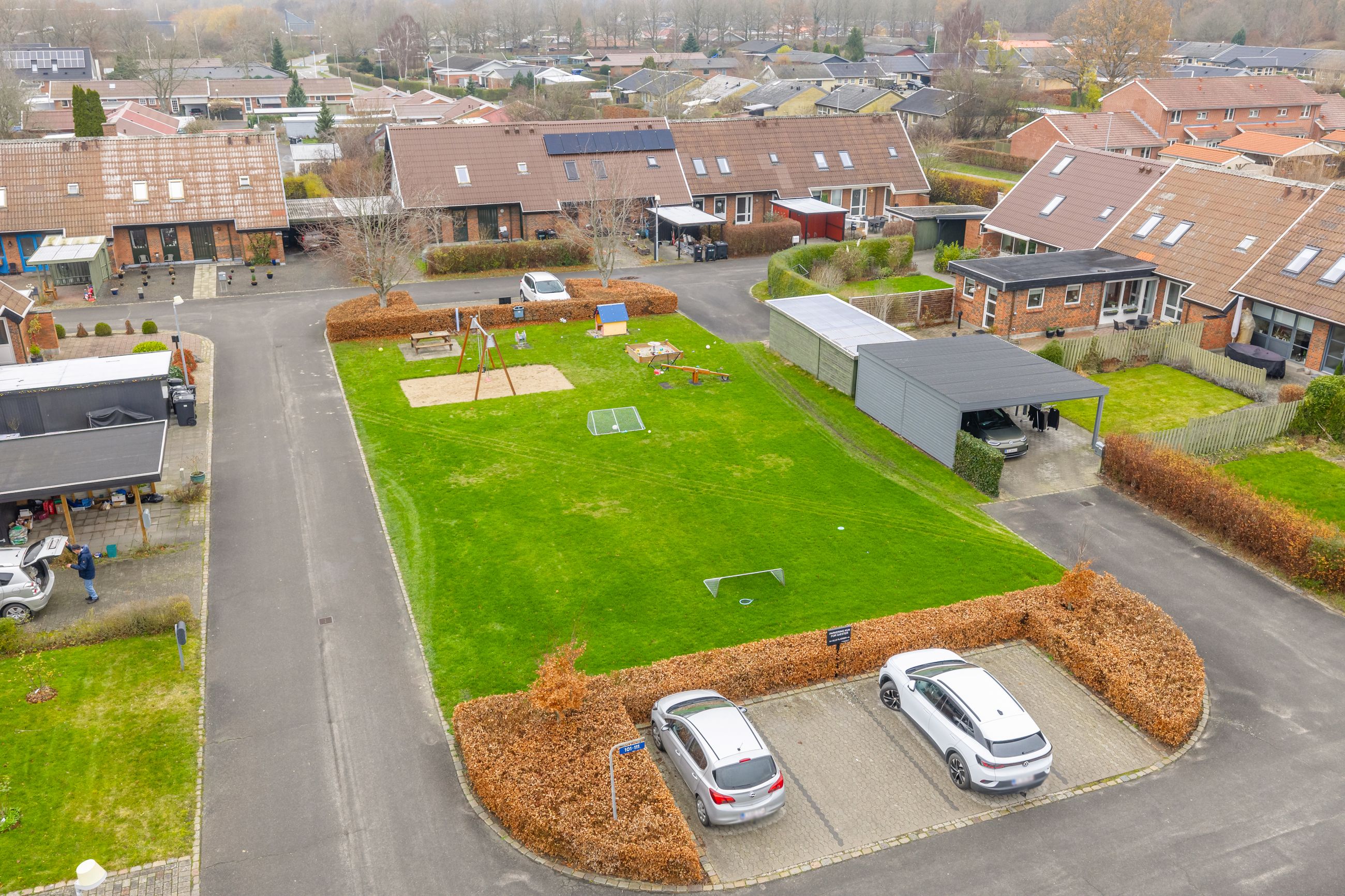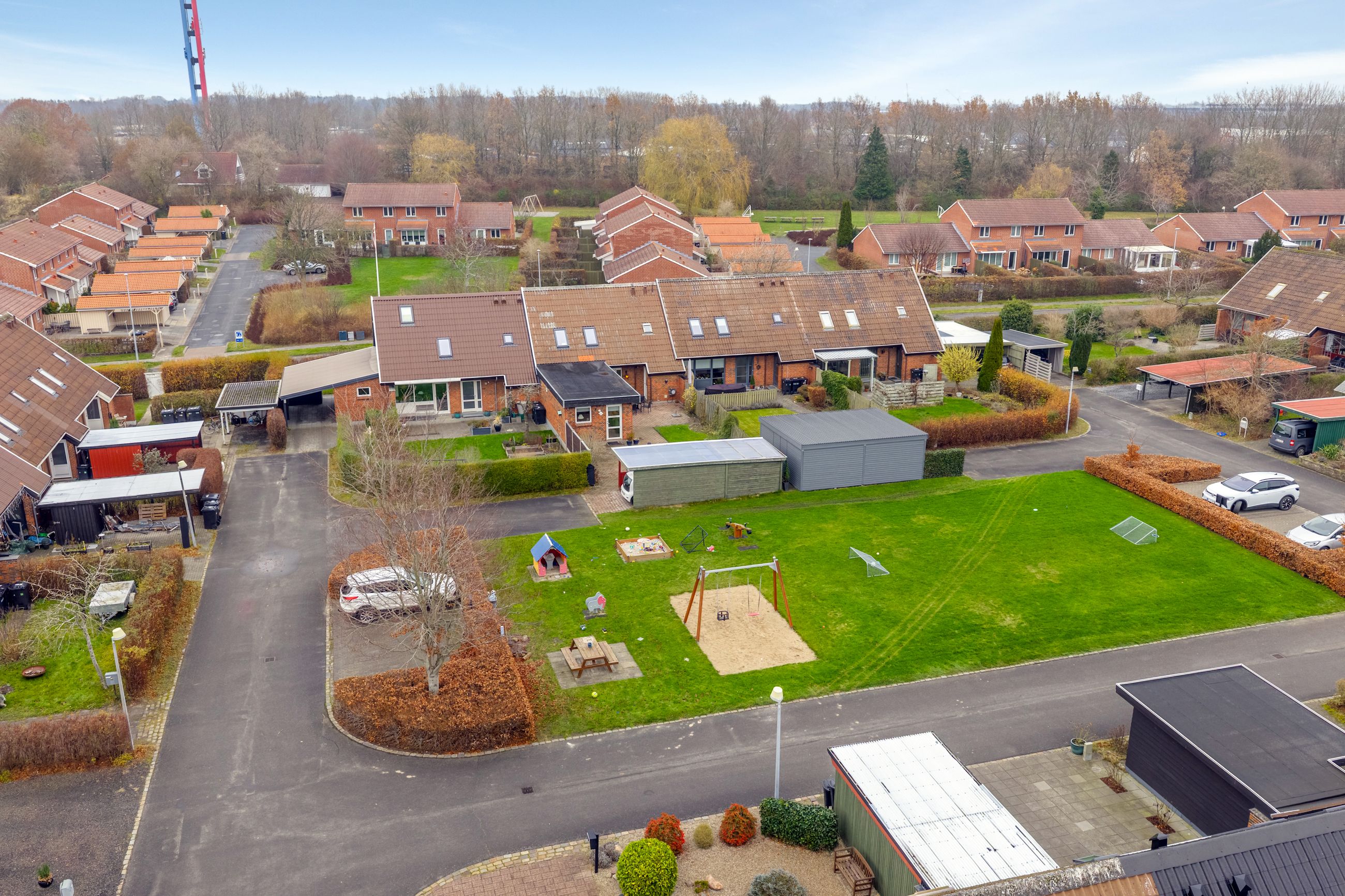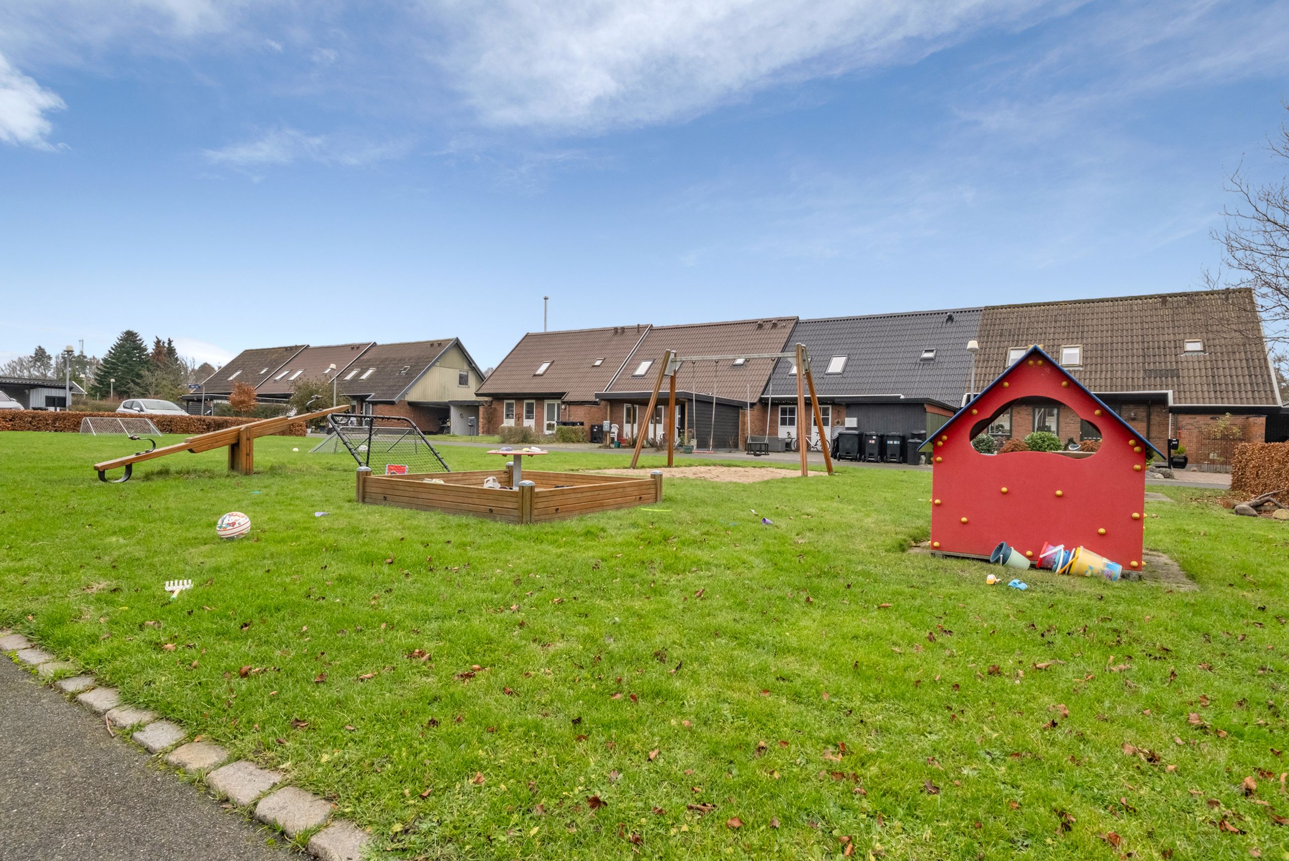 Det grønne fællesområde med legeplads og boldbane skaber den perfekte ramme for en tryg barndom, hvor vængets børn kan lege frit og løbe fra hus til hus.