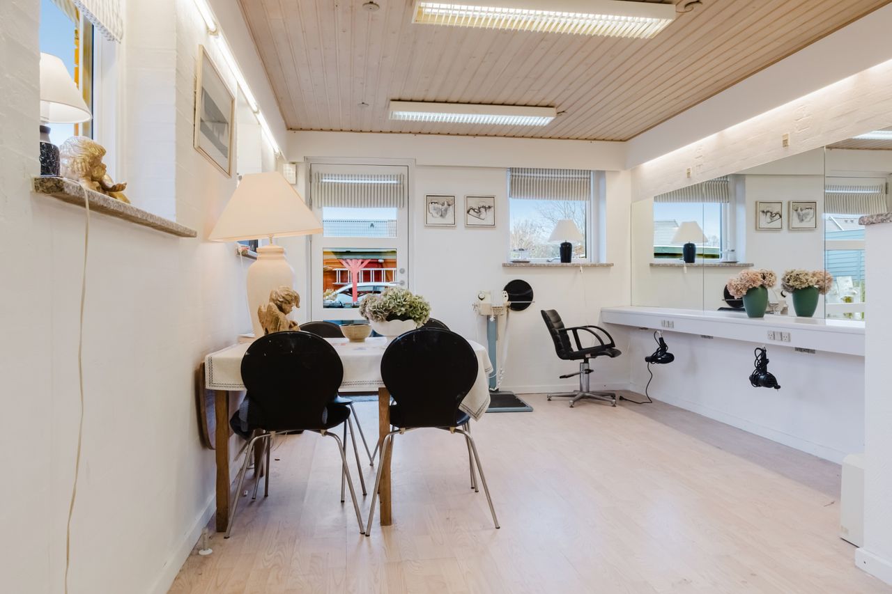 Fra stuen kan du fortsætte ud i et værelse, der tidligere har været brugt til frisørsalon. Det kan fortsat bruges til liberalt erhverv eller omdannes til værelse eller kontor.