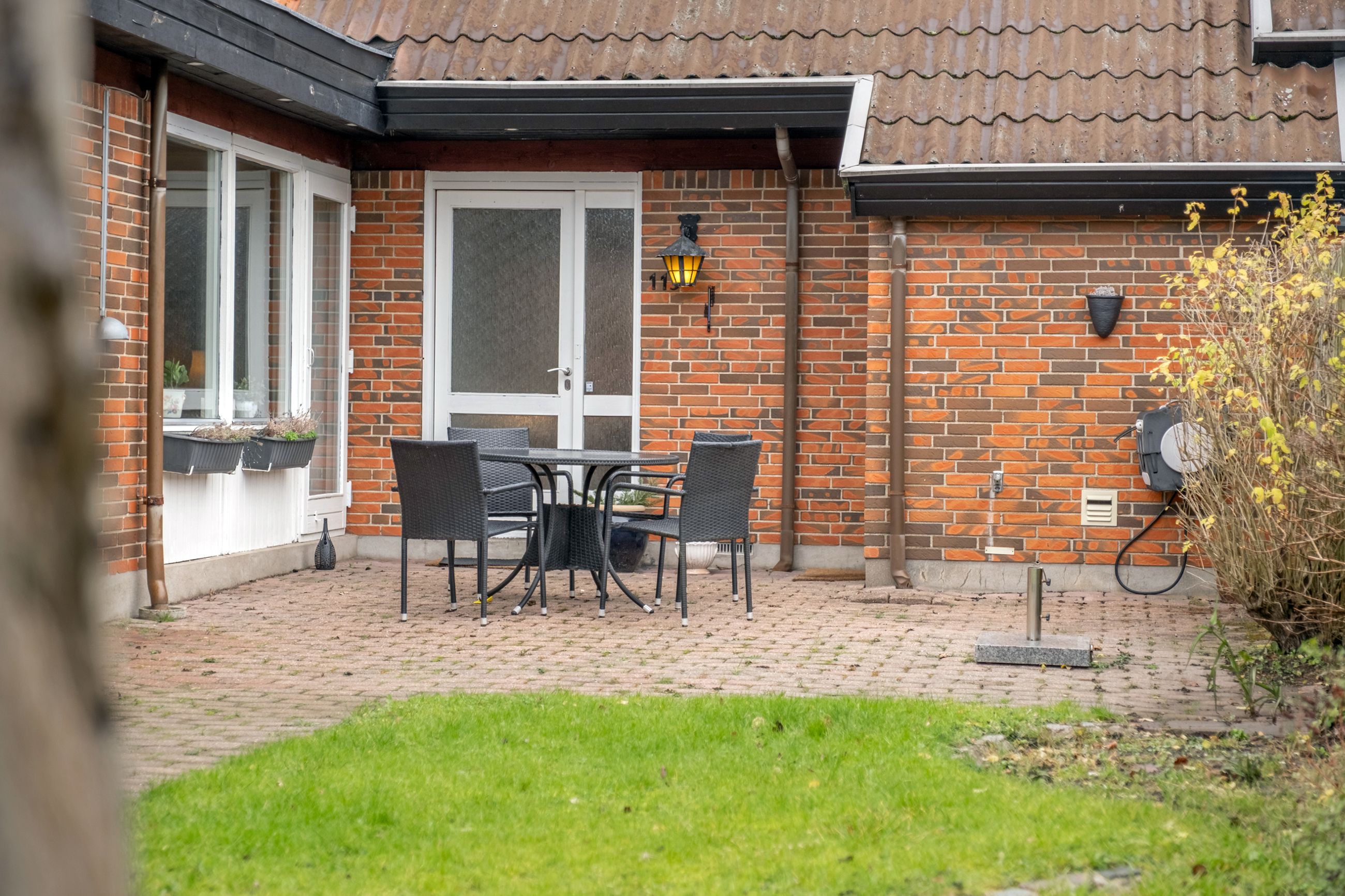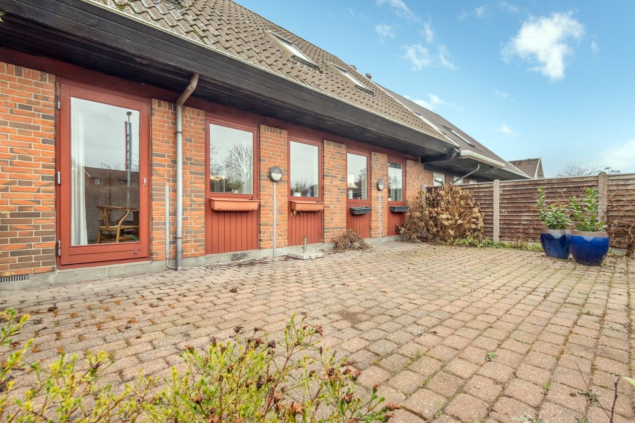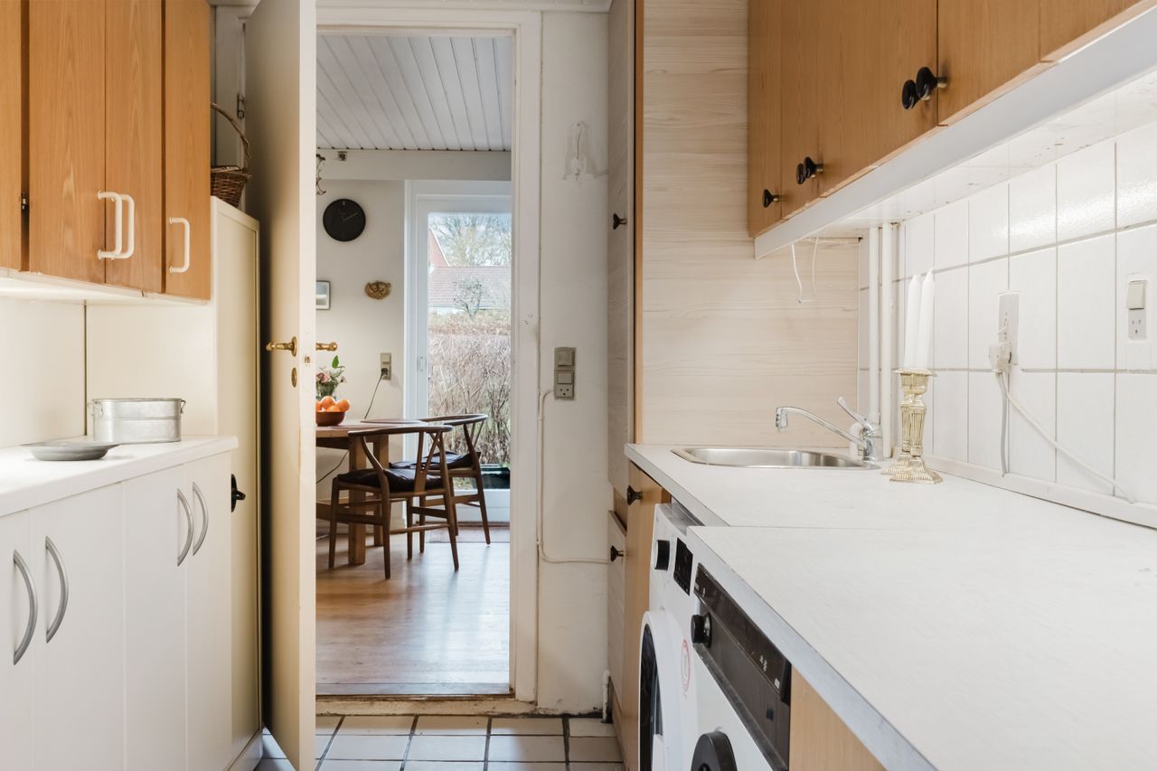 Bilen parkeres nemt i carporten, der har et tilstødende skur til cykler eller haveredskaber. Herfra krydser du den sydvendte terrasse og træder ind i bryggerset - boligens praktiske indgang med grovkøkken, masser af skabs- og bordplads samt plads til vaskemaskine og tørretumbler. Klinkegulvet gør det nemt at holde rent i de våde efterårs- og vintermåneder.