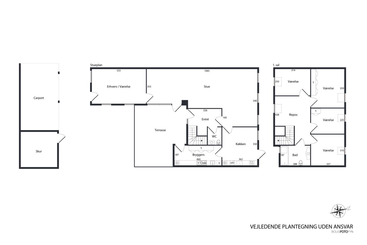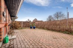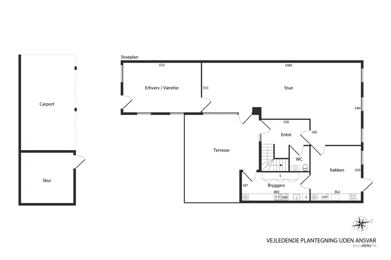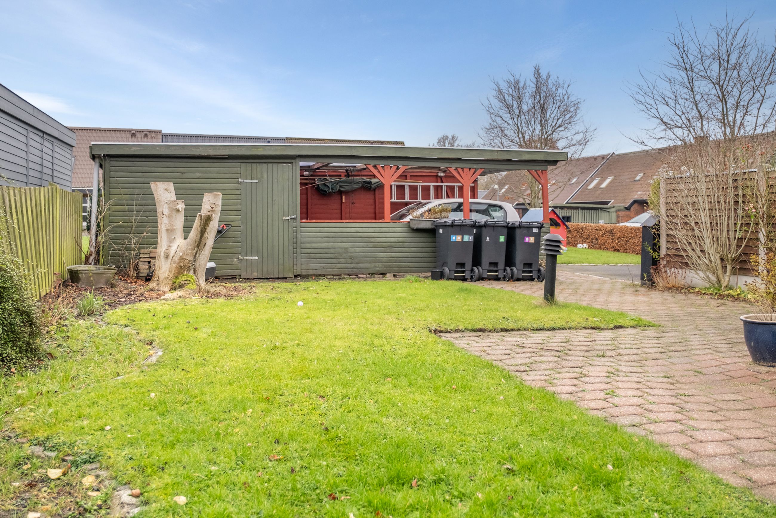 Bilen parkeres nemt i carporten, der har et tilstødende skur til cykler eller haveredskaber. Herfra krydser du den sydvendte terrasse og træder ind i bryggerset - boligens praktiske indgang med grovkøkken, masser af skabs- og bordplads samt plads til vaskemaskine og tørretumbler. Klinkegulvet gør det nemt at holde rent i de våde efterårs- og vintermåneder.