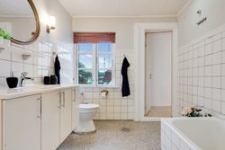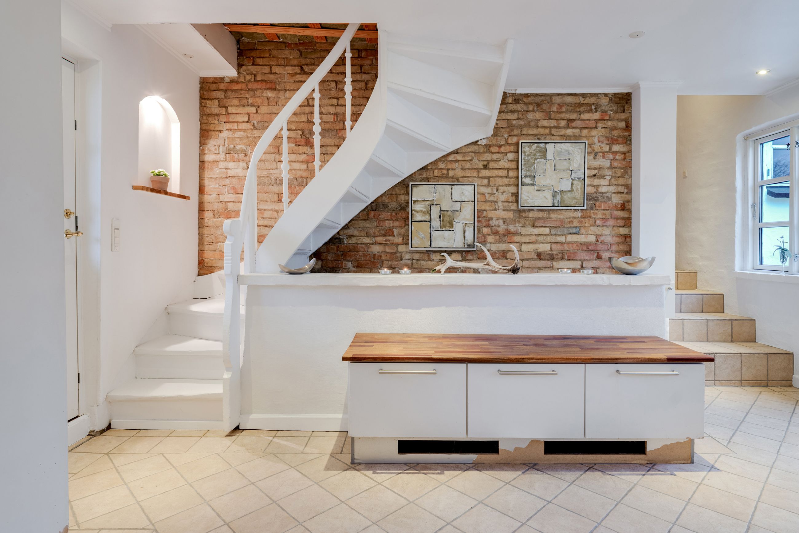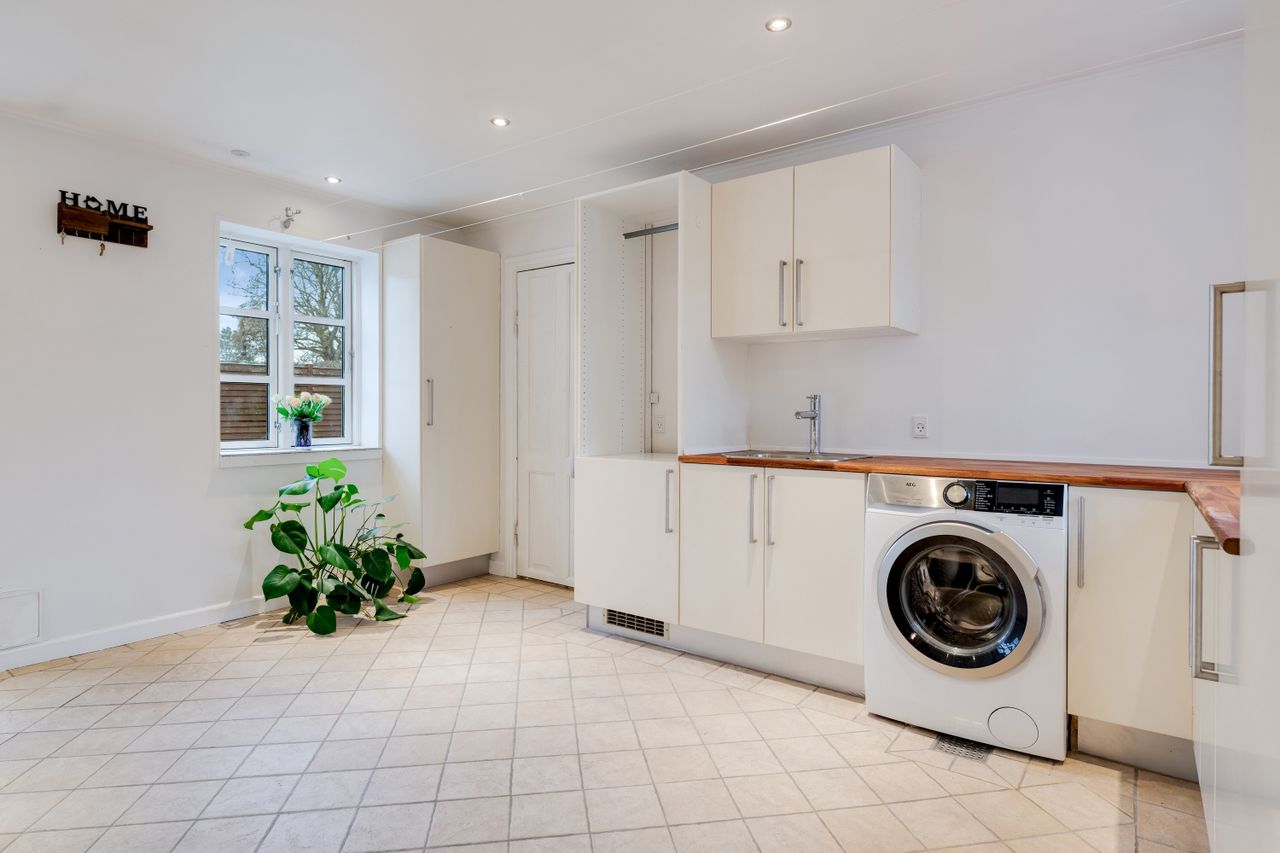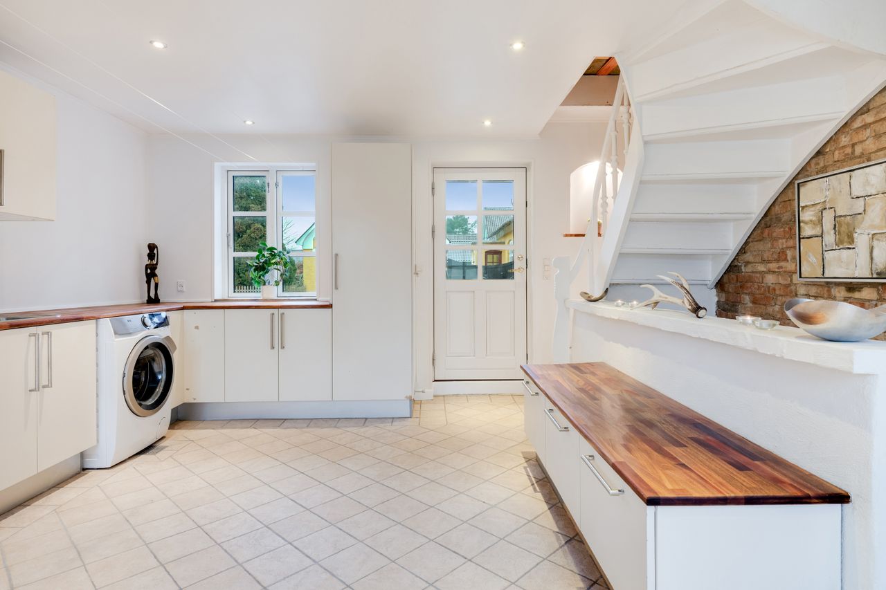 Fra køkkenet er der få trin ned til et praktisk bryggers med gulvvarme vaskefaciliteter, god opbevaringsplads og direkte udgang til haven - perfekt til de våde måneder, hvor overtøj og mudrede sko ikke skal ind i entréen, eller til sommerhalvåret hvor vasketøj nemt bæres udendørs. Den korte afstand fra køkkenet gør det samtidig nemt at flytte måltider ud under åben himmel, så I kan nyde de lune sommeraftener med familien.