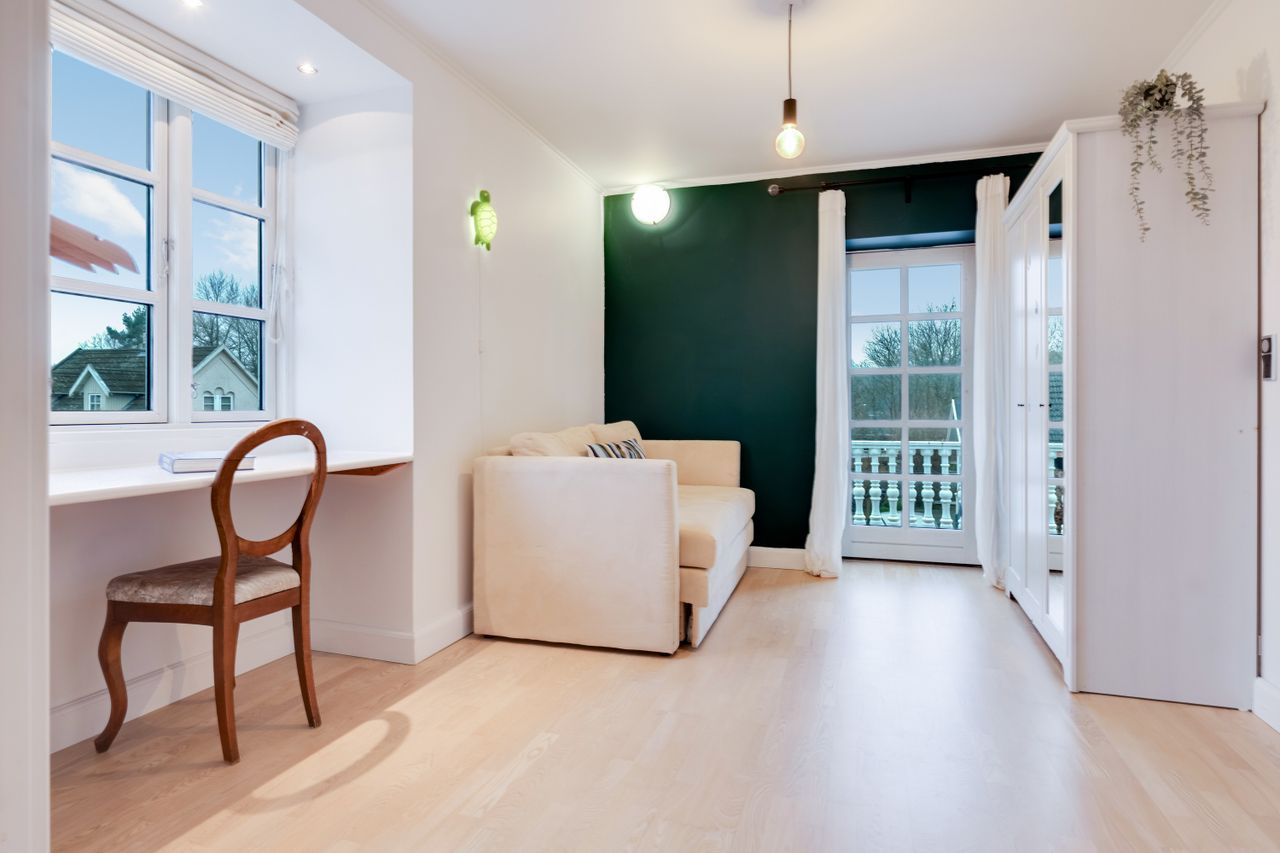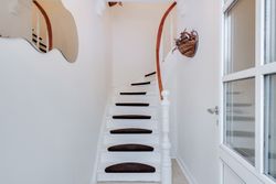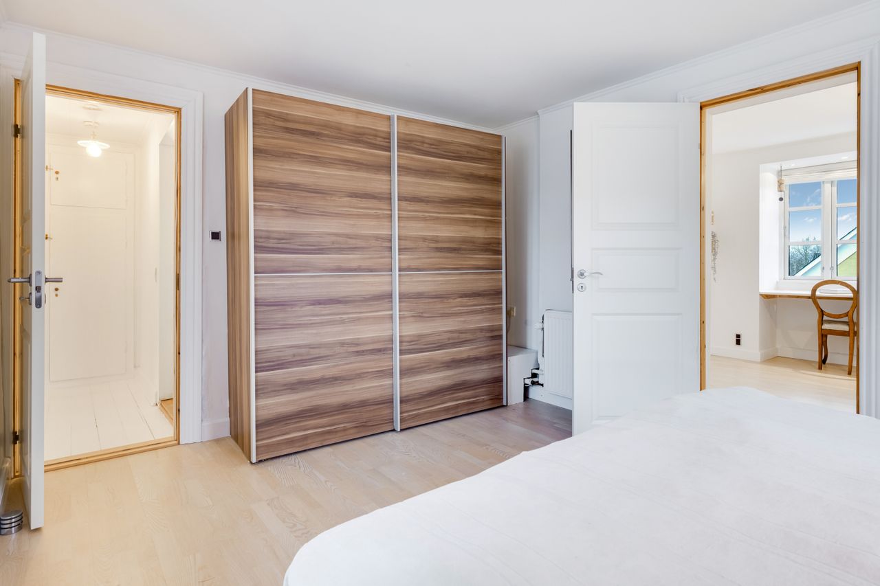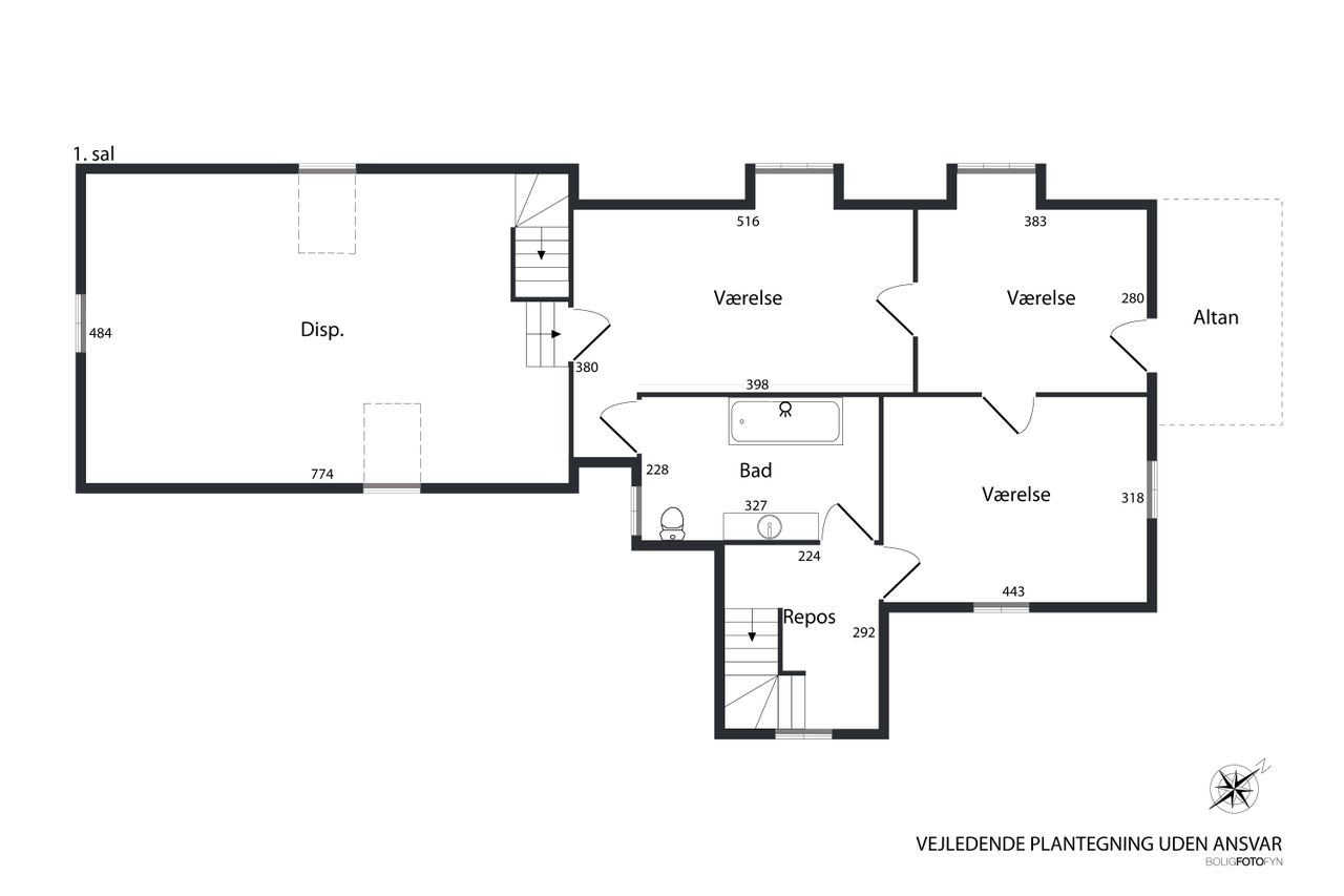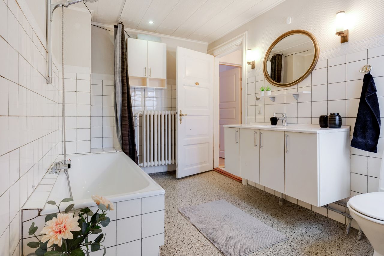 Boligen byder velkommen i en lys entré med en smuk trappe til førstesalen, hvor du finder tre værelser - det ene med udgang til balkon. Her er også et badeværelse med badekar samt et stort disponibelt rum, der egner sig perfekt til legerum, tv-stue eller hobbyrum. Rummet har egen indgang via bryggerset, og gør det helt oplagt til teenageafdeling.