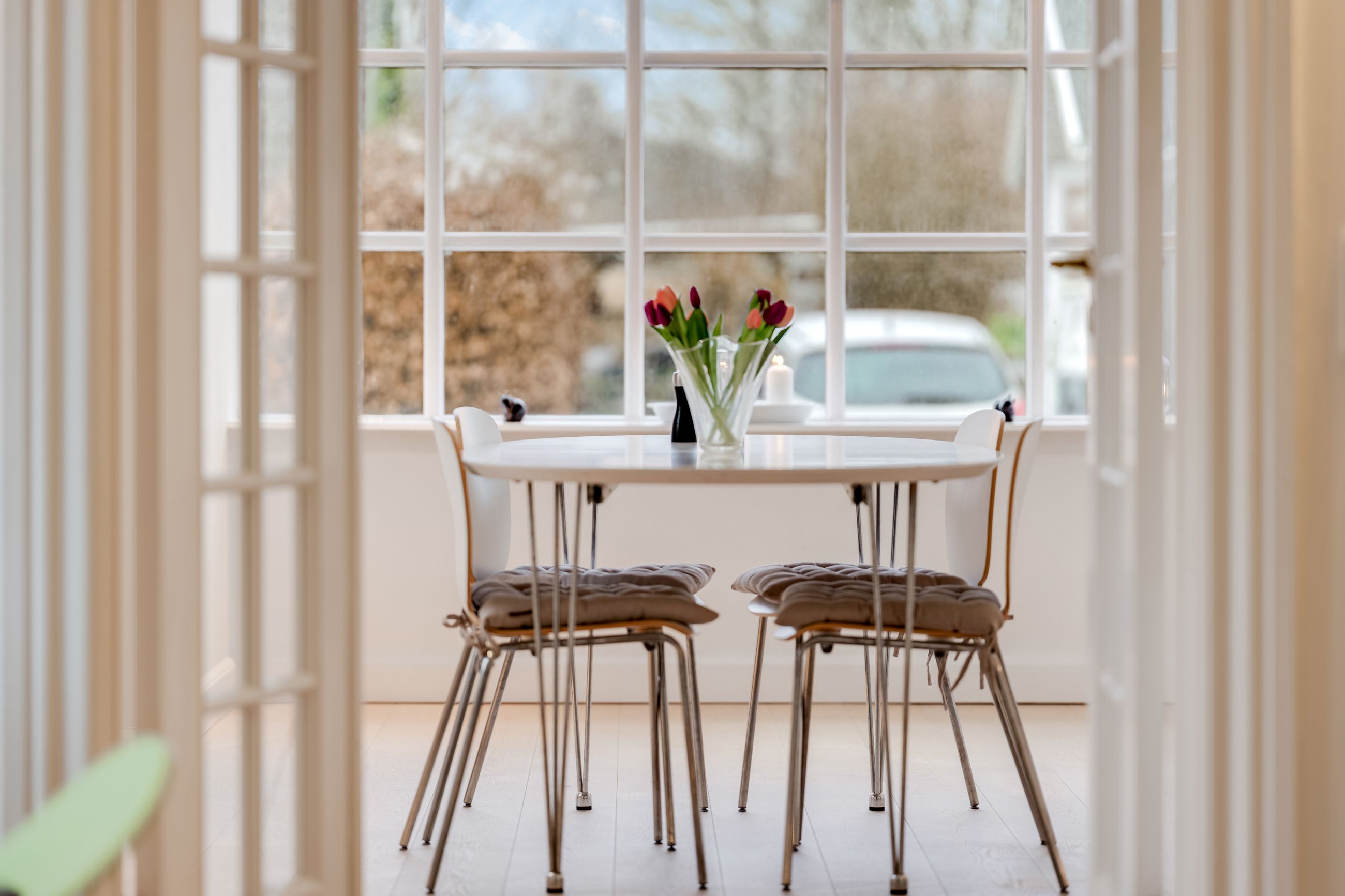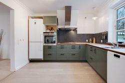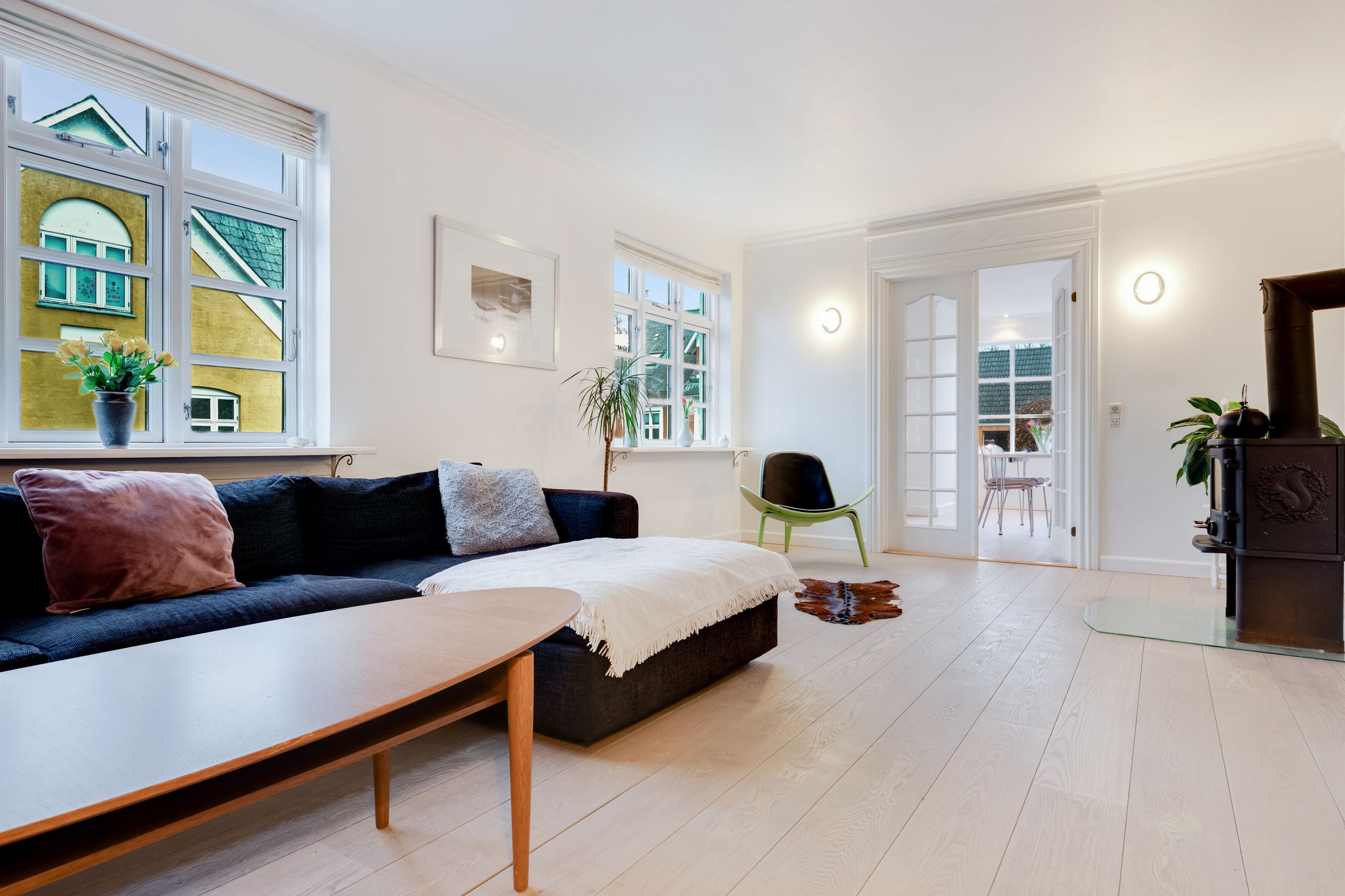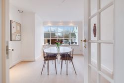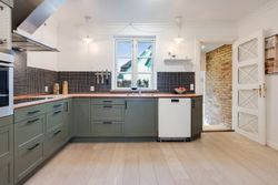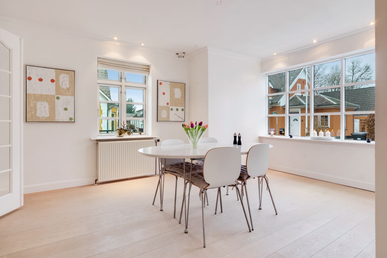 I stueplan træder du fra entréen ind i husets opholdsafdeling, som består af to stuer og en spisestue, der ligger i naturlig forlængelse af hinanden. De smukke trægulve går gennem rummene og skaber en flot sammenhæng og en varm atmosfære, mens loftet er prydet med fin stuk og herskabelige rosetter i loftet. Den bagerste stue ligger en suite med spisestuen, hvilket giver et harmonisk flow mellem rummene, samtidig med at der fortsat er mulighed for at afskærme med de franske døre efter behov. Spisestuen har god plads til et langt spisebord med plads til familie og gæster, og en brændeovn sikrer varme og hygge i de mørke måneder. Herfra er der adgang til køkkenet, som står flot med grønne fronter og ovn i behagelig arbejdshøjde.