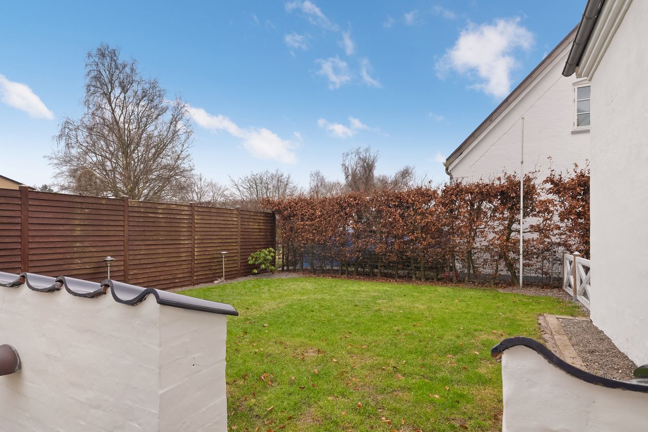 Haven er overskuelig og nem at holde med græsarealer og fliseterrasse, der giver plads til både leg, afslapning og hyggelige stunder.