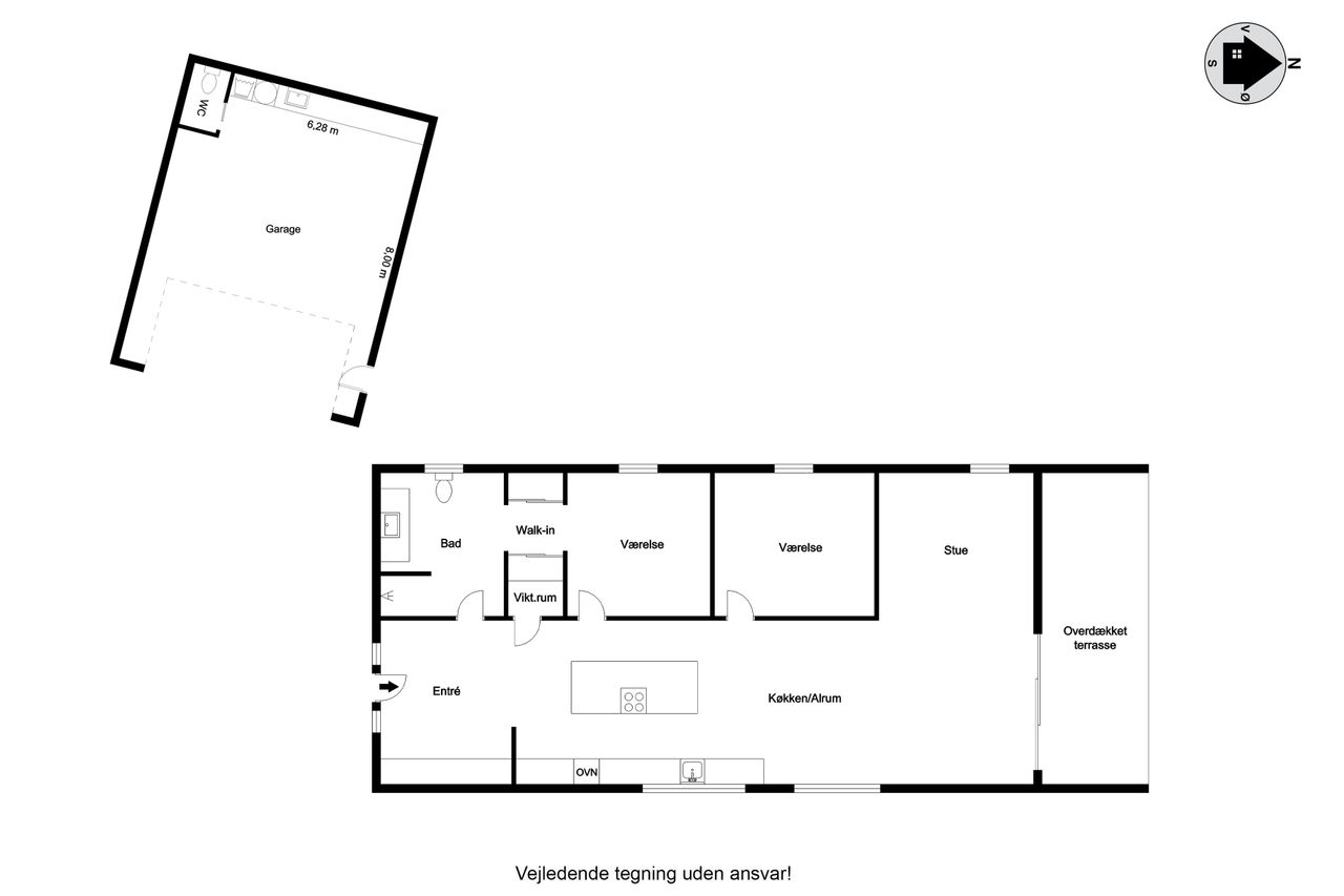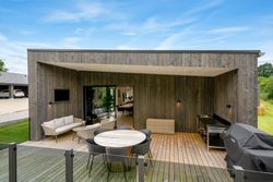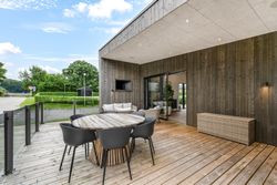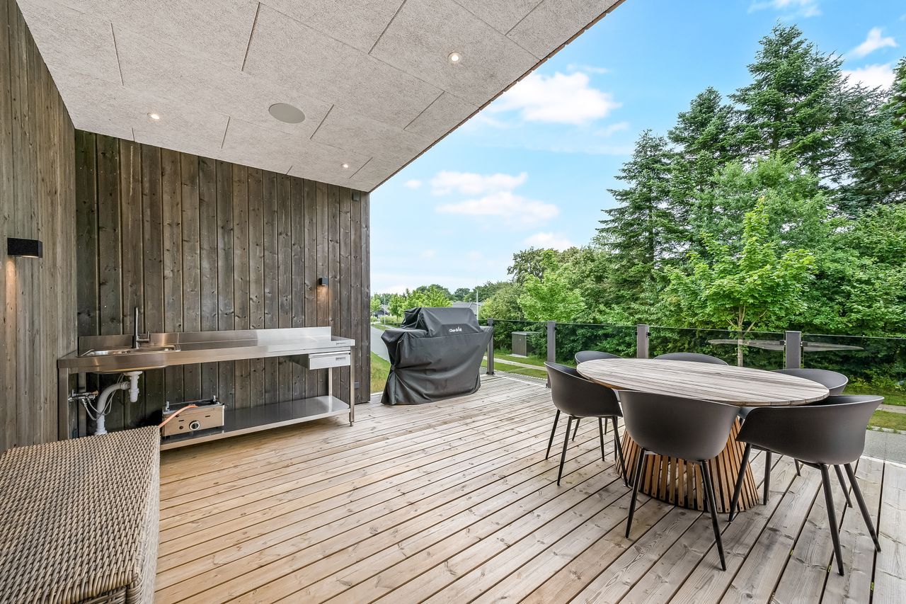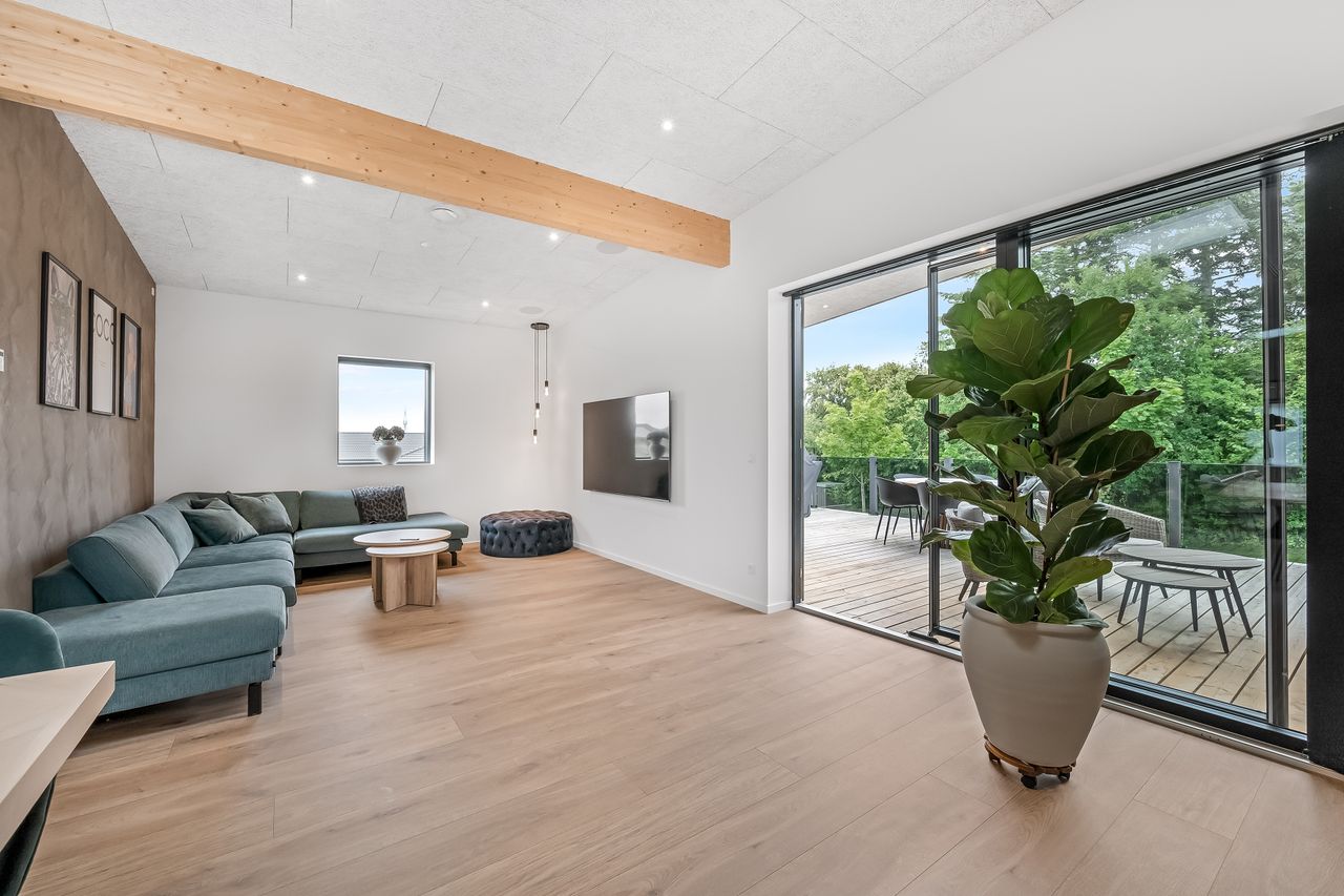 Opvarmningen sker med luft-vand varmepumpe, og der er gulvvarme i hele huset, samt garagen. Det er lavet med ensidig taghældning der sikrer at godt lys og en følelse af højt til loftet og en god rummelighed. Der er lavet en del smartstyring, der bl.a. tæller indbyggede højtalere, og Philips HUE styring på lyset. Fantastisk anvendelig hævet terrasse med direkte udgang fra stuen. Her er lavet udekøkken, og den del der er under tag, ville kunne ændres til at lave et ekstra værelse, hvis det skulle være behovet – også her har ejer været forudseende, hvis det var det, behovet skulle blive.