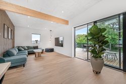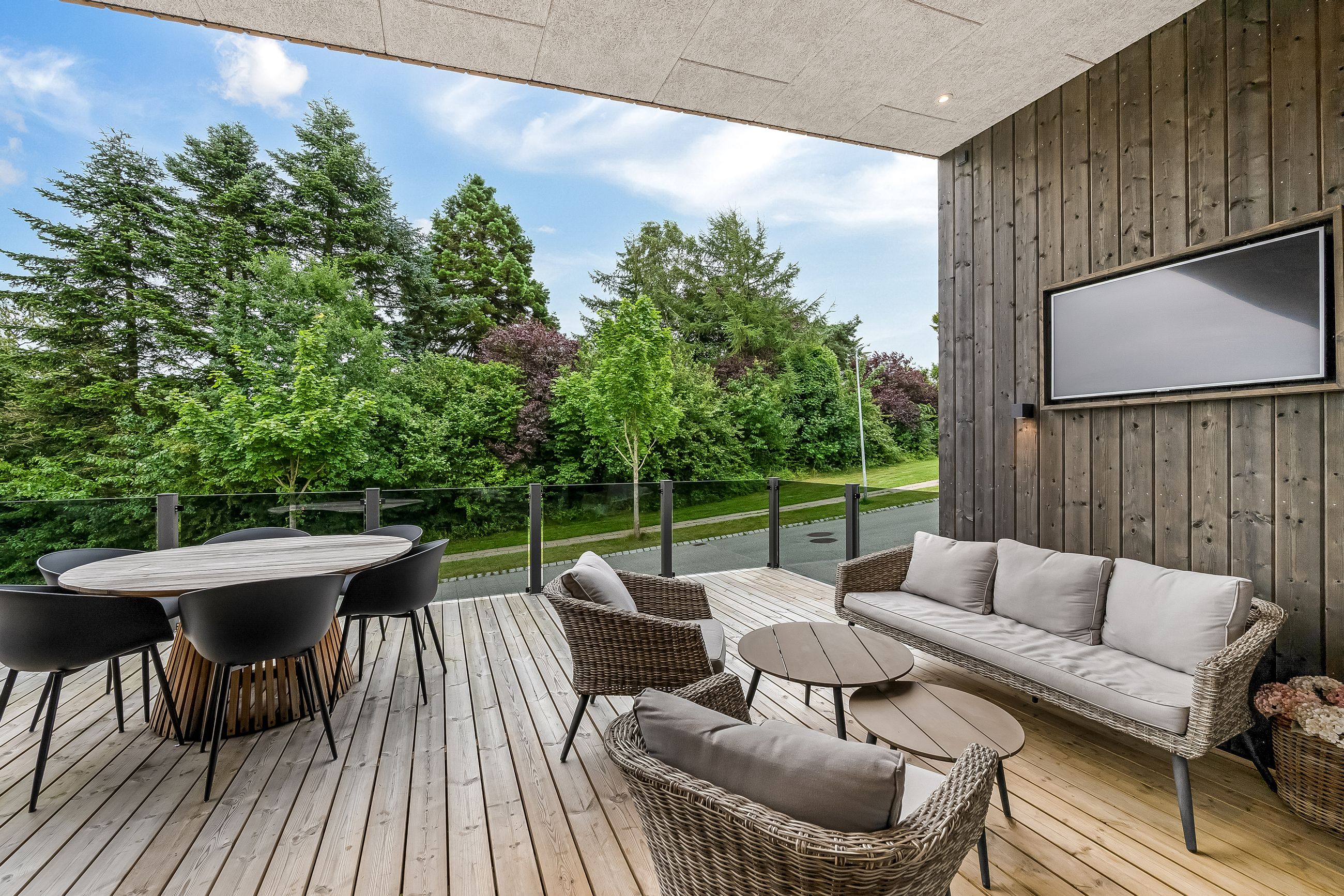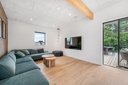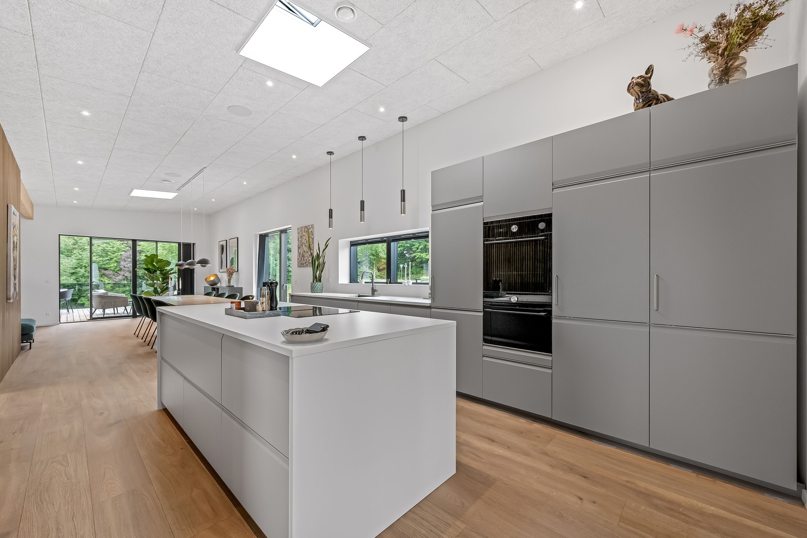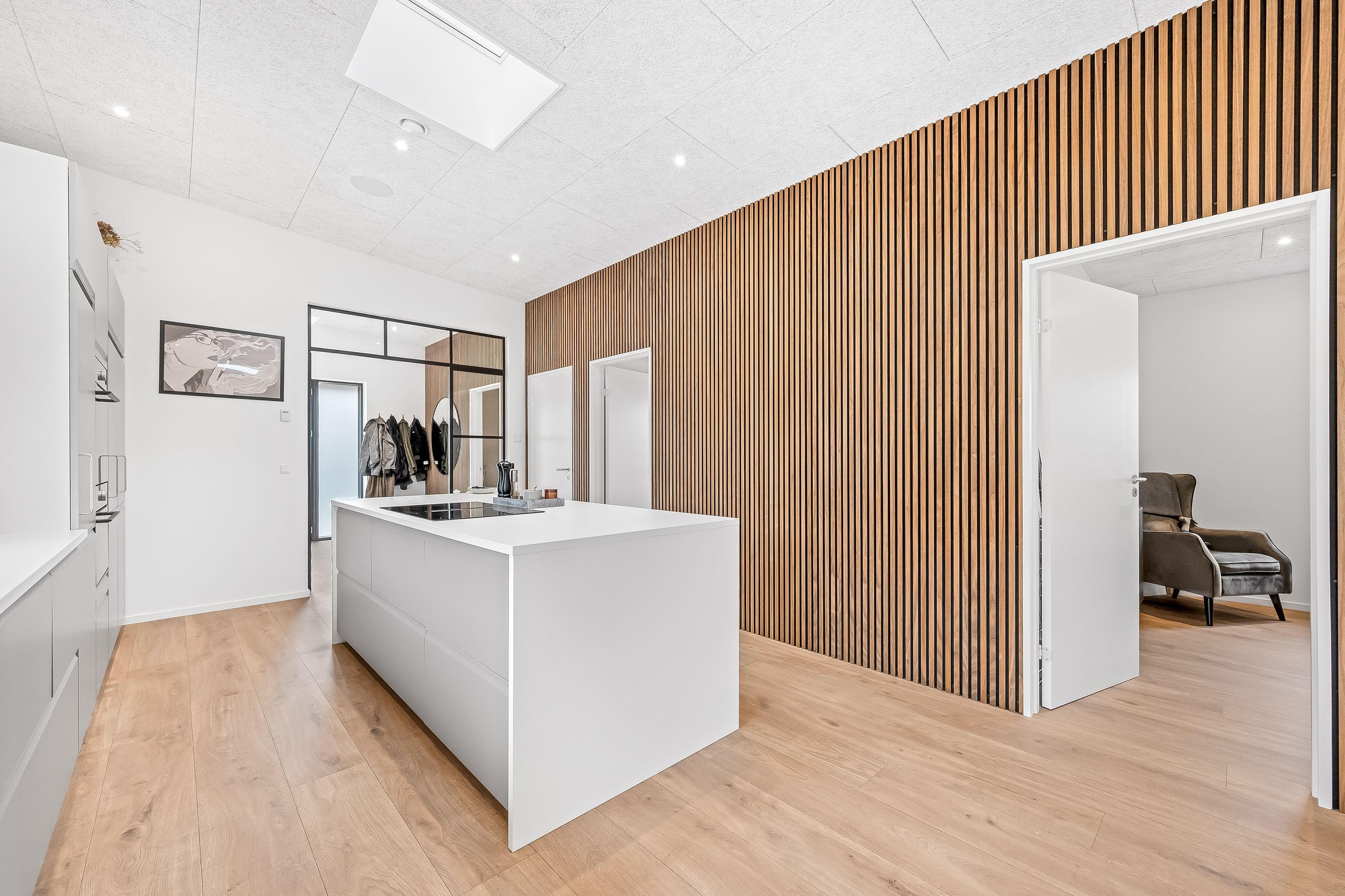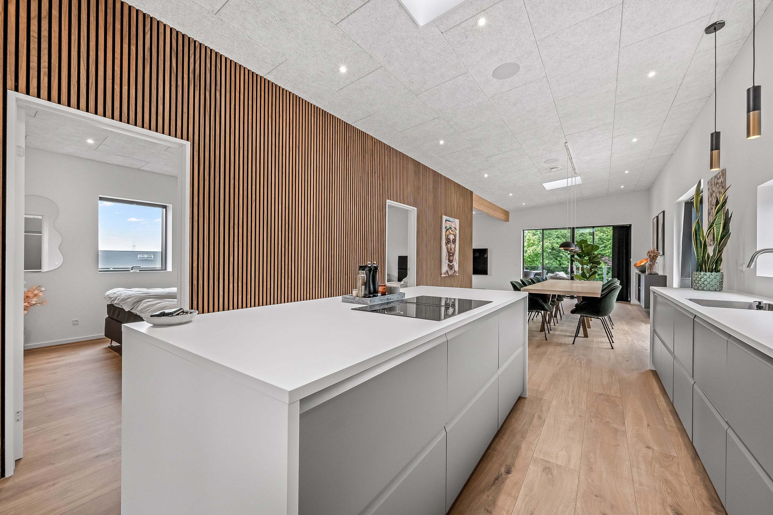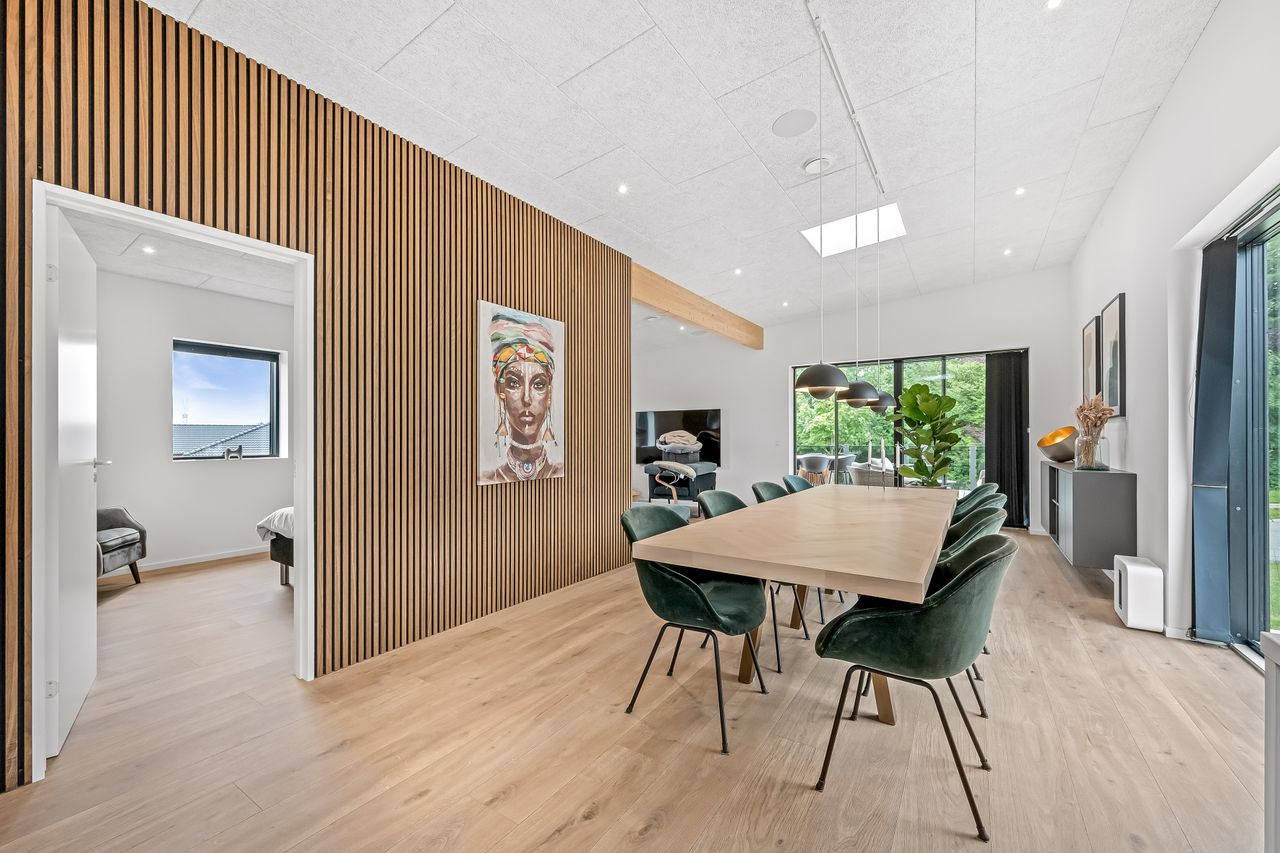 Det centrale opholdsmiljø binder boligen sammen på fineste vis, og arealet danner den perfekte ramme for det gode familieliv. Køkken/alrummet har en stor køkkenø, og herfra er der udgang til den sydvendte del af haven. I køkkenet er der desuden lavet et praktisk depotrum til opbevaring. Troldtektlofterne, træakustikpladerne på væggene og ikke mindst de fine gulve sikrer en god atmosfære, hvor der, selv med mange gæster, er rart at være.