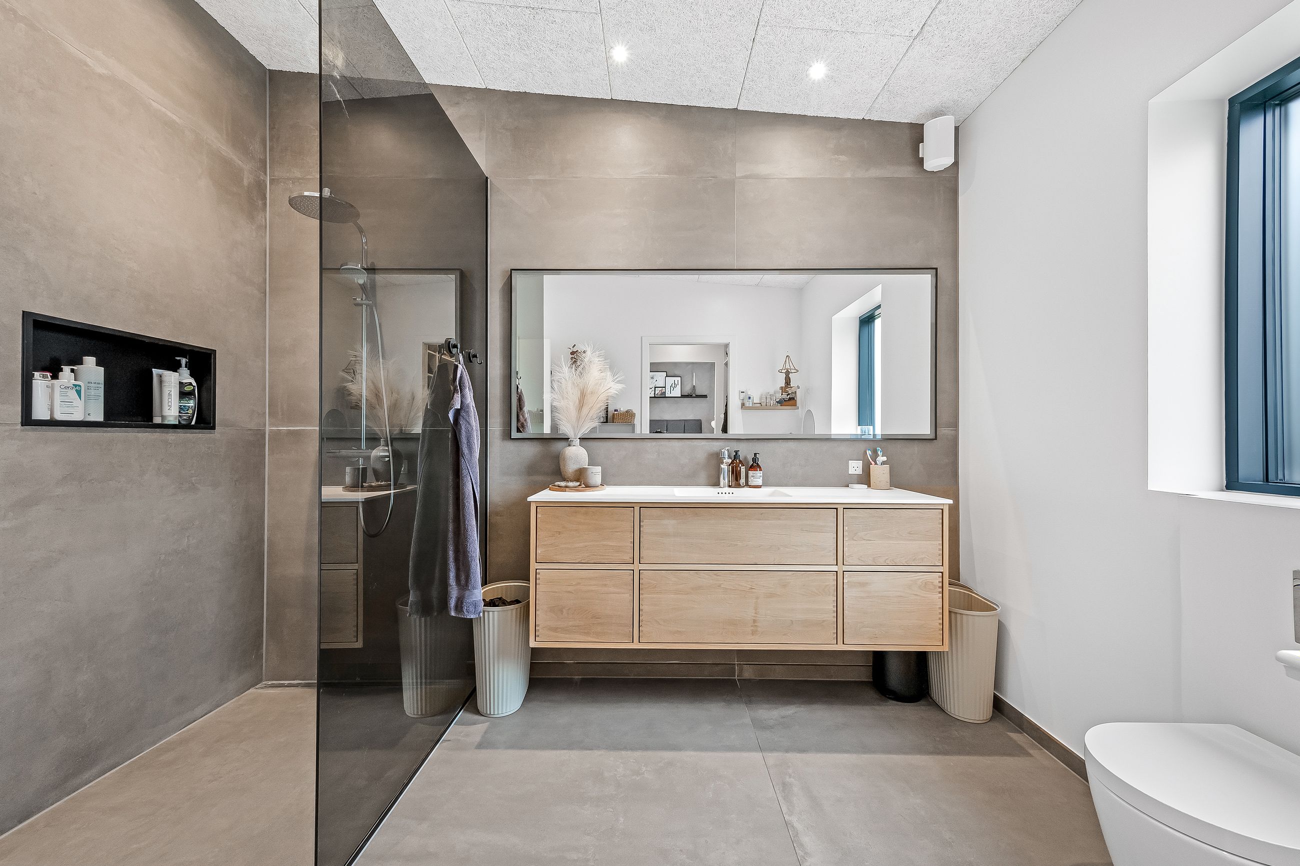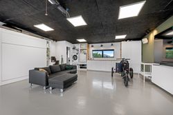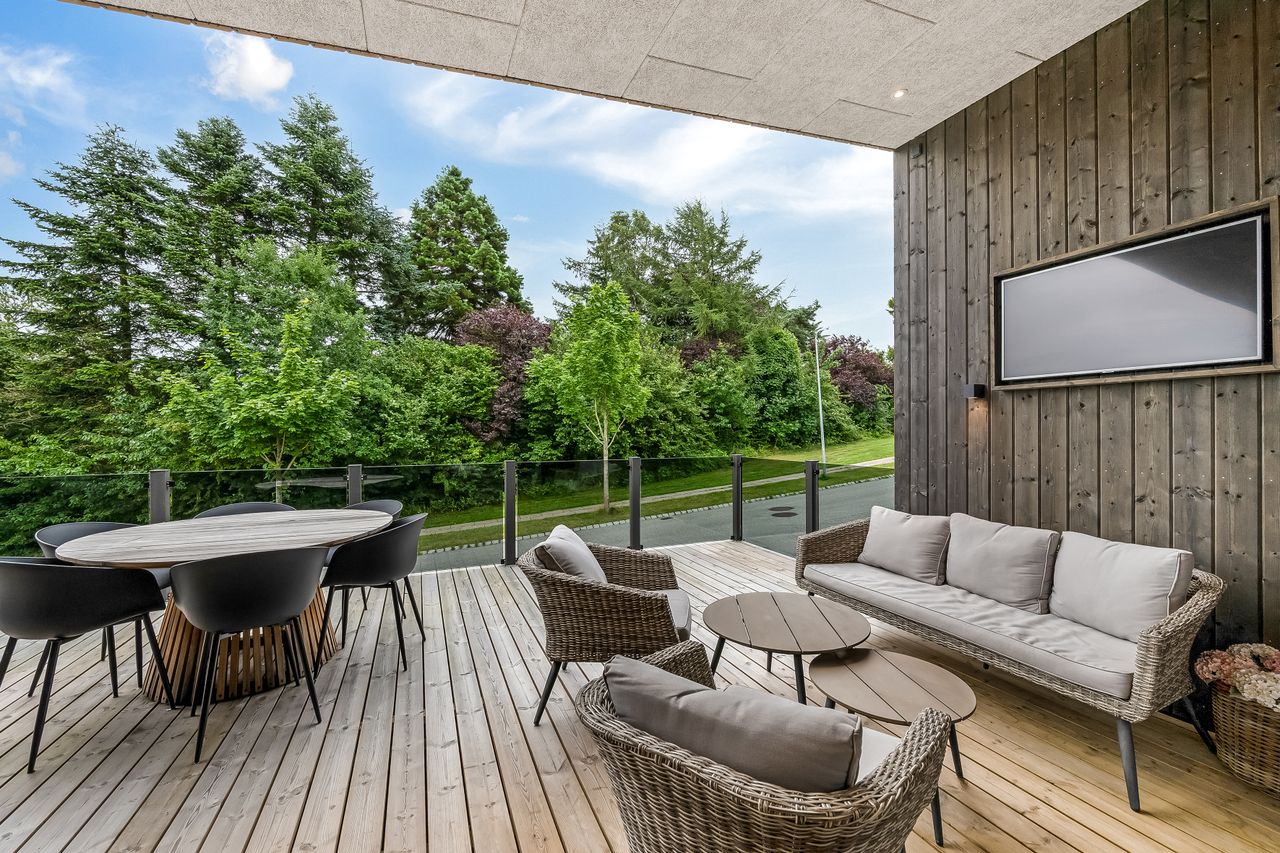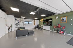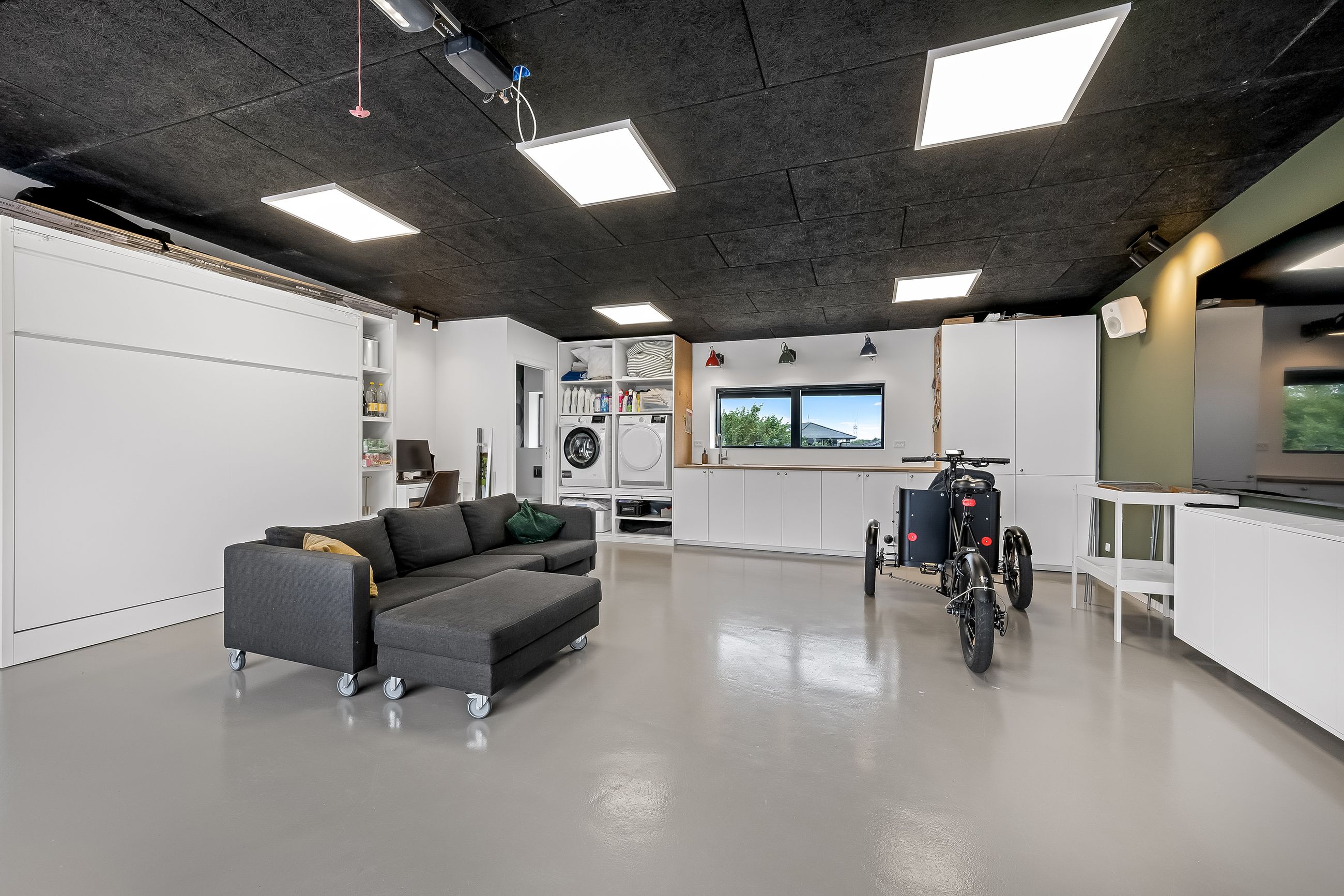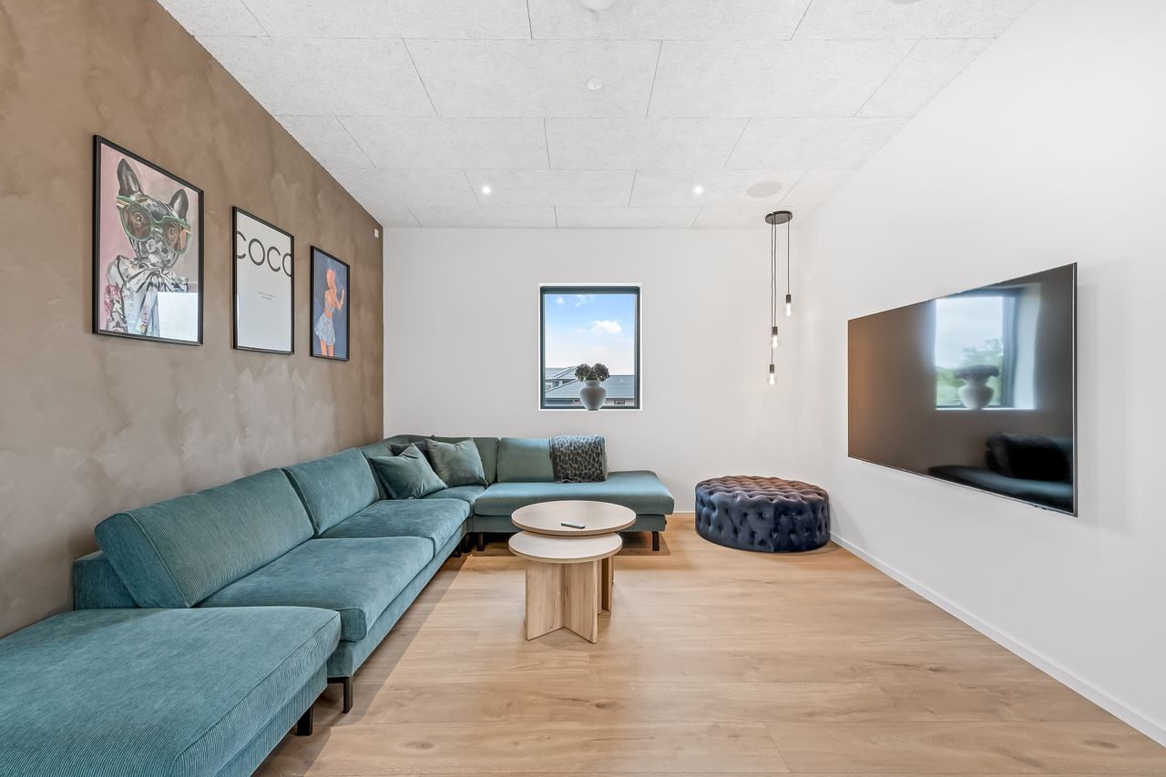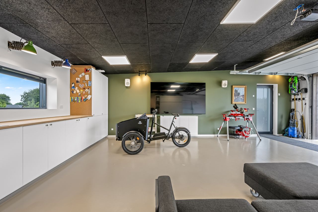 Garagen er virkeligt prikken over i’et. De 61 bonuskvadratmeter er lavet i boligstand og fungerer som alt fra teenageafdeling, slyngelstue, festlokale, bryggers og selvfølgelig garage med dobbeltport, hvis bilen skal ekstra forkæles. Der er lavet toilet, som sikrer at det reelt kan fungere som en ekstra boligdel.