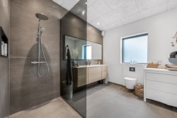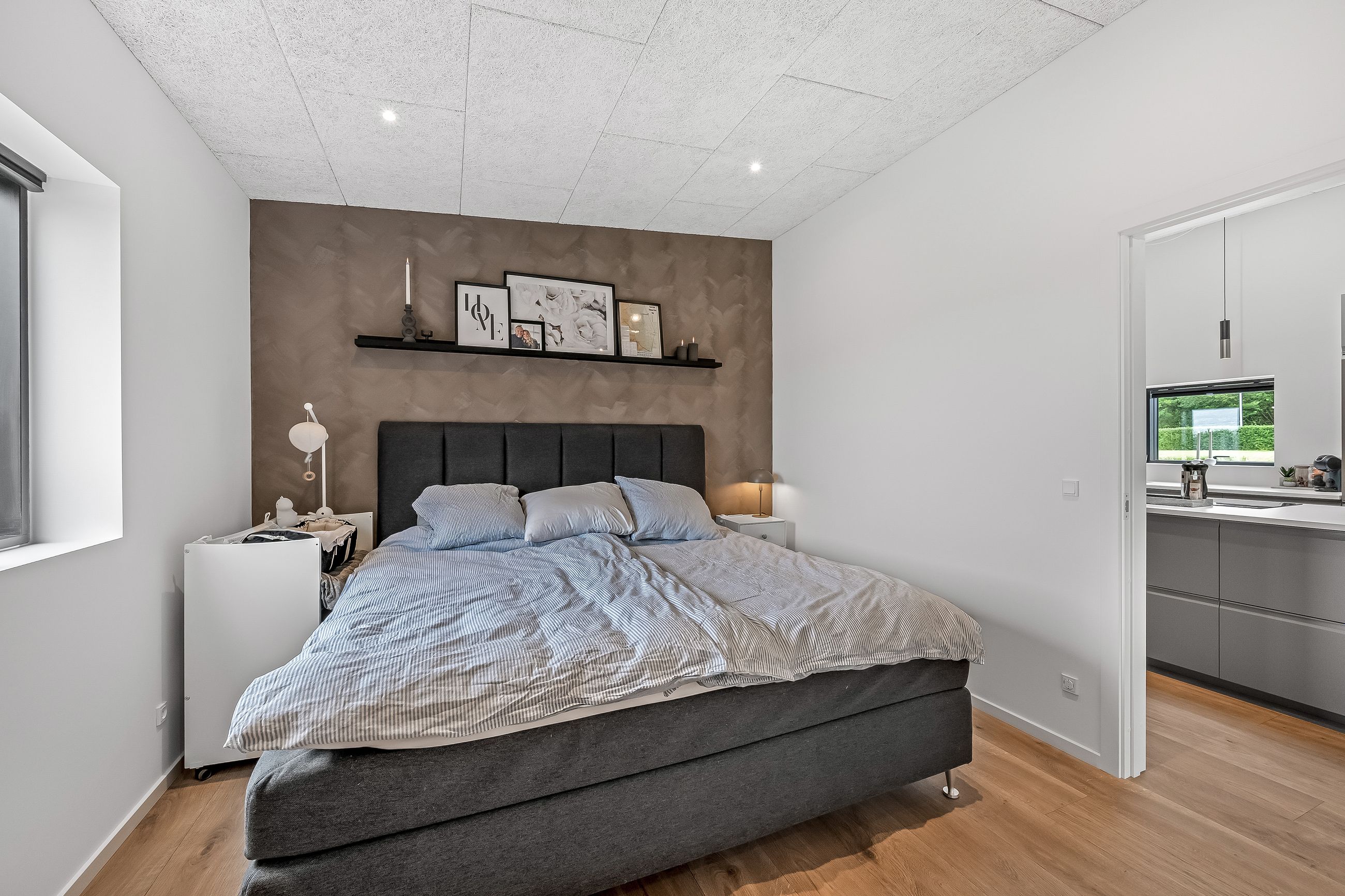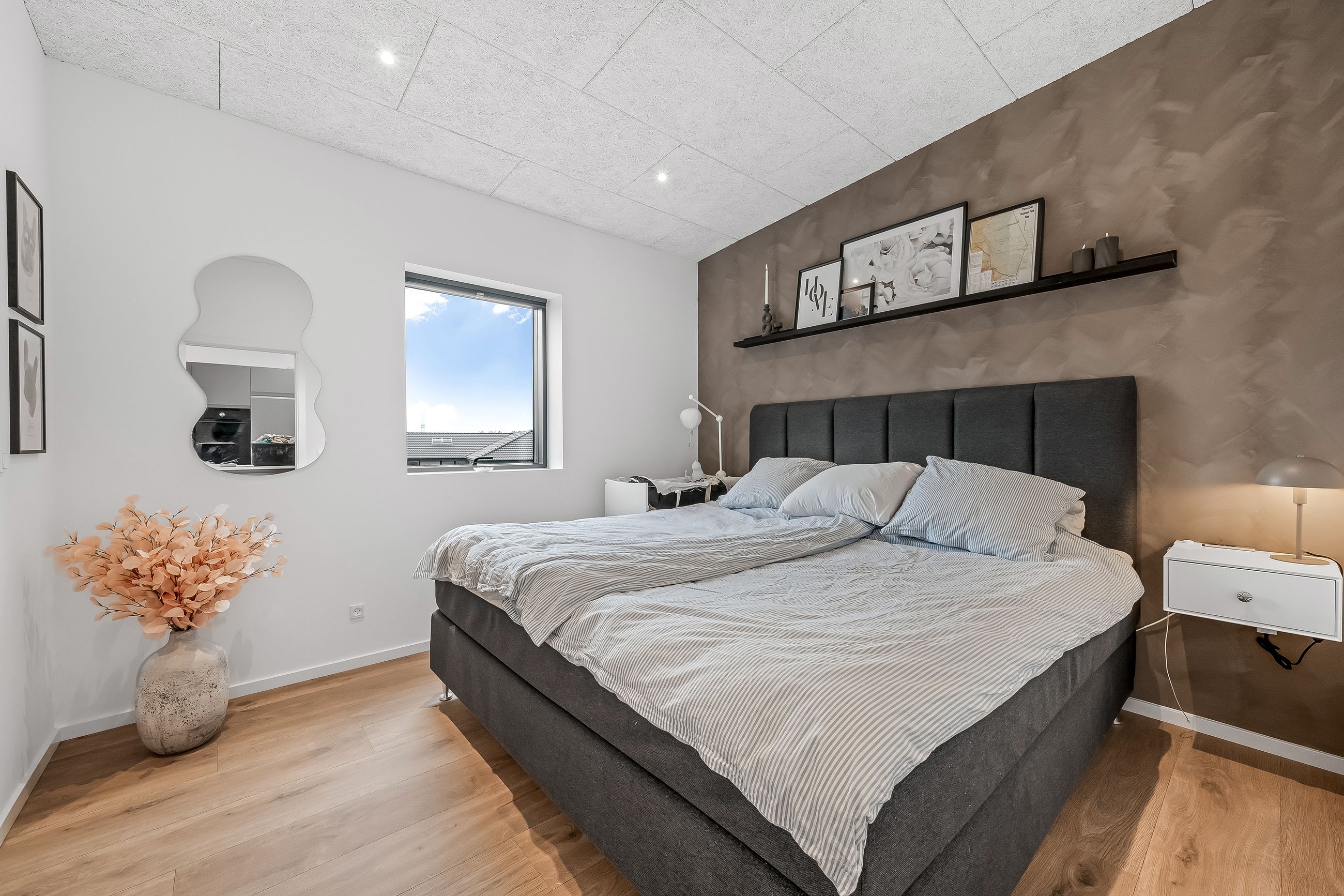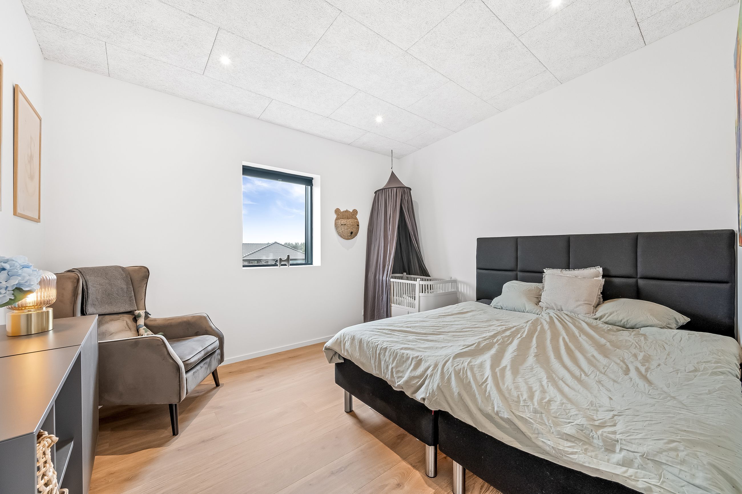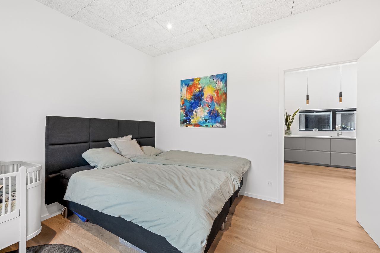 Herudover er der et stort værelse, der med lethed kan anvendes til børneværelse, kontor eller gæsteværelse alt efter behov. Lækkert soveværelse med ”walk-through-closet” til husets badeværelse. Badeværelset er med stor bruseniche og har ligeledes adgang fra entréen. Her er der lækkert snedkermøbel og klargjort til vaskesølje, hvis man ikke ønsker at have det stående i garagen, som nuværende ejer har det.
