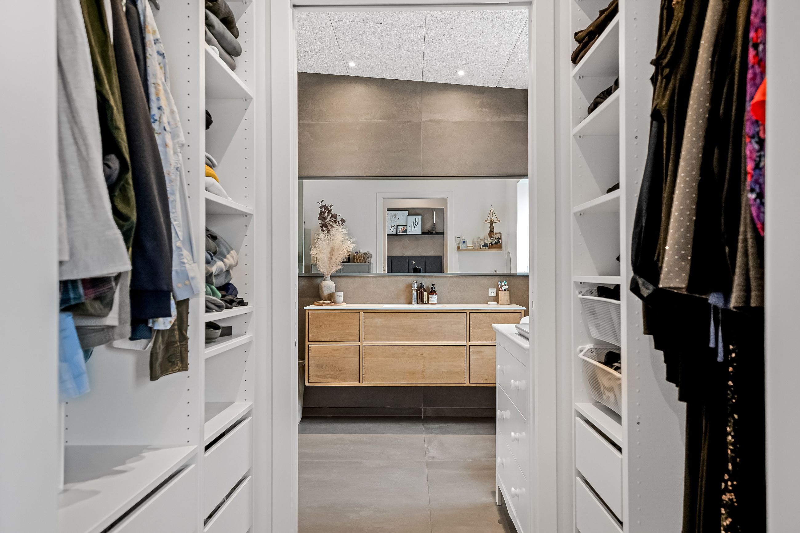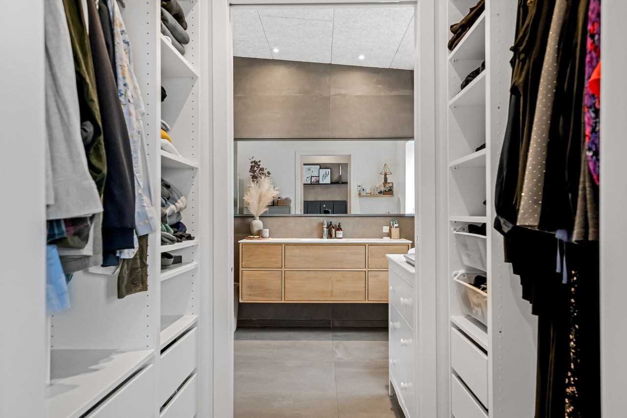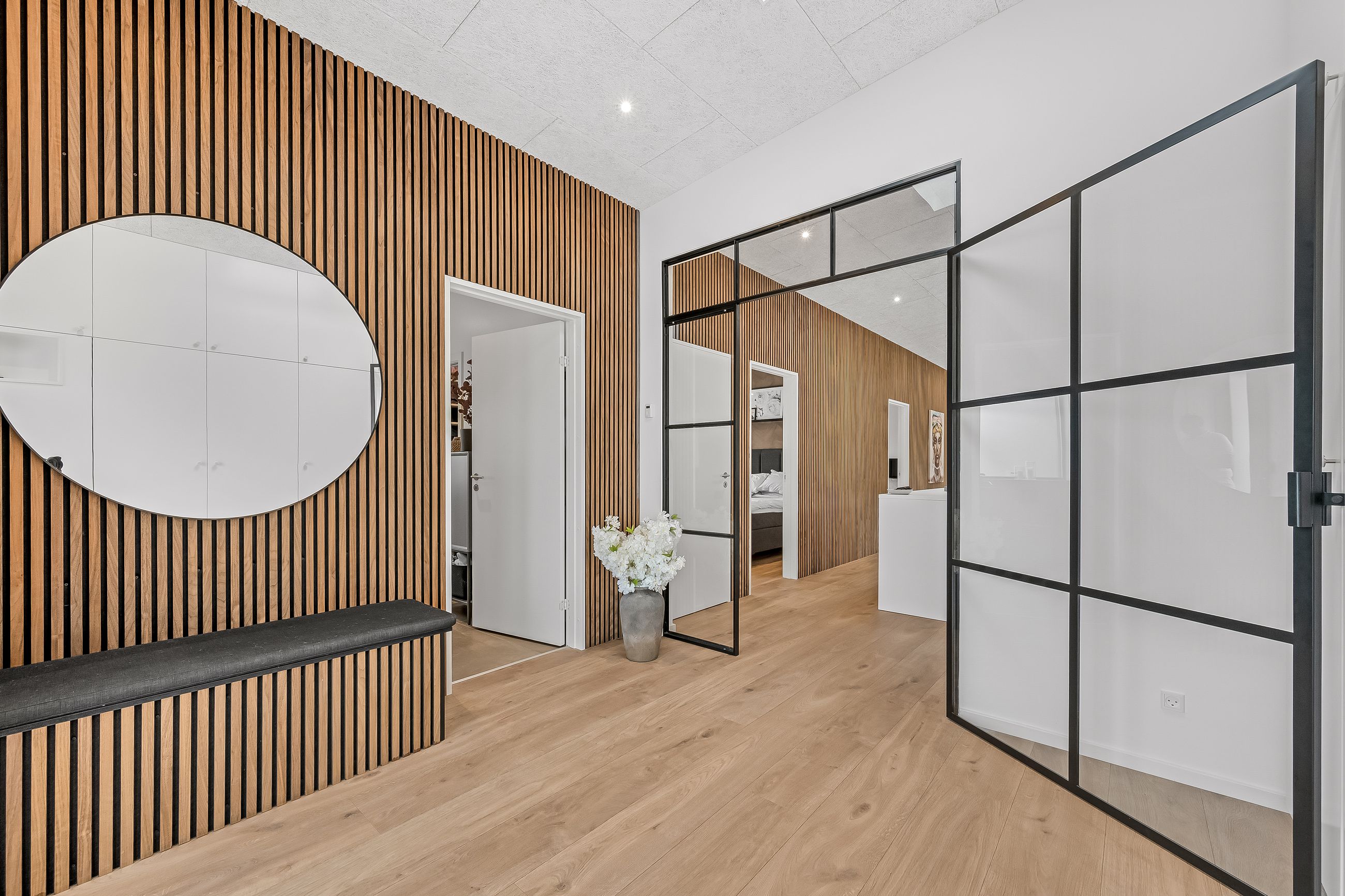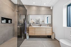 Inde står det hurtigt klart, at her er tale om en ejendom, hvor man med høj kvalitet, smukke materialer og moderne komfort har skabt en helt unik bolig. Indretningen byder på stor og lækker entré, med en stor new-yorker-dør, der gør at du har kig igennem hele huset. Her er diverse teknik, opbevaring, indbygningsbænk og garderobe.