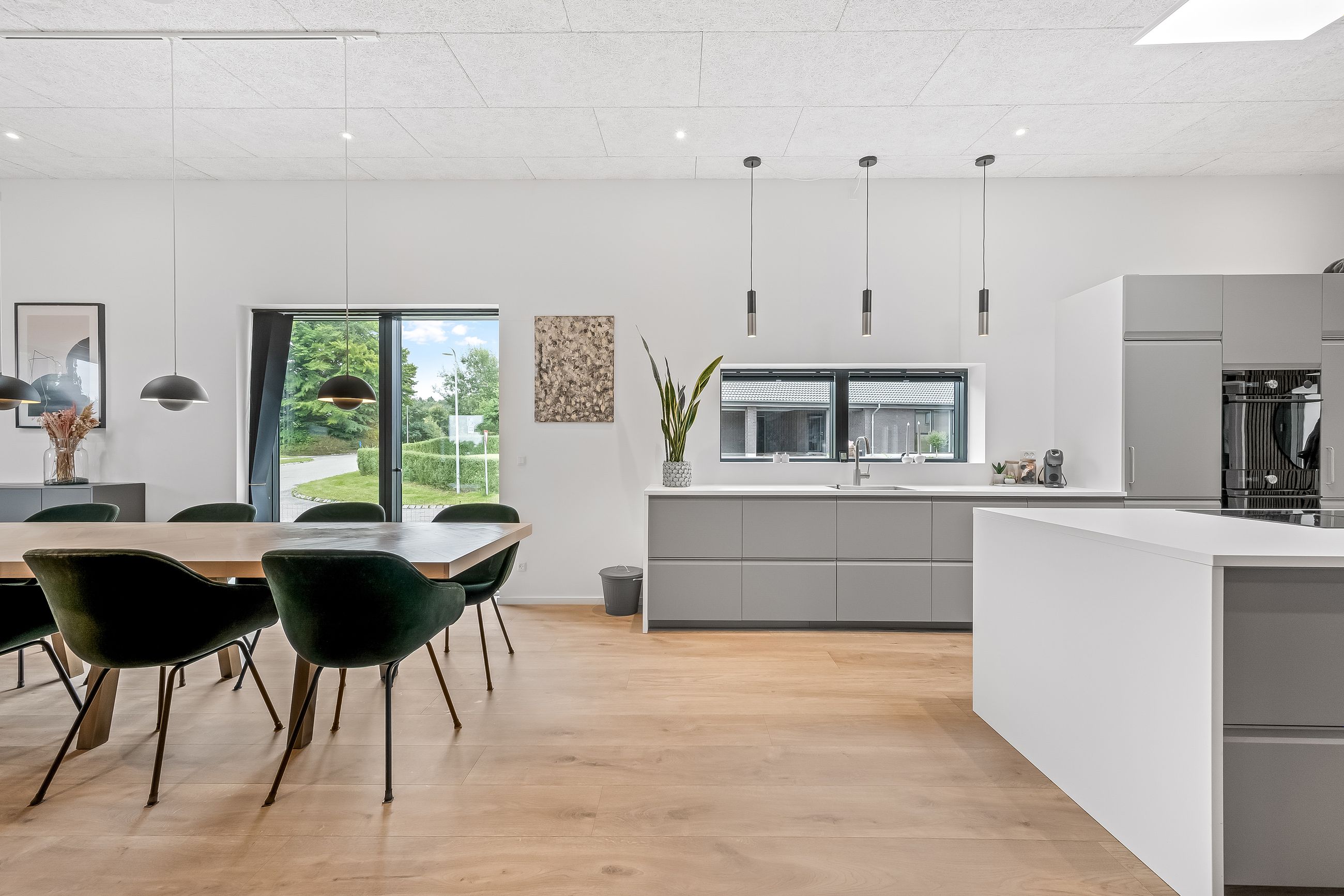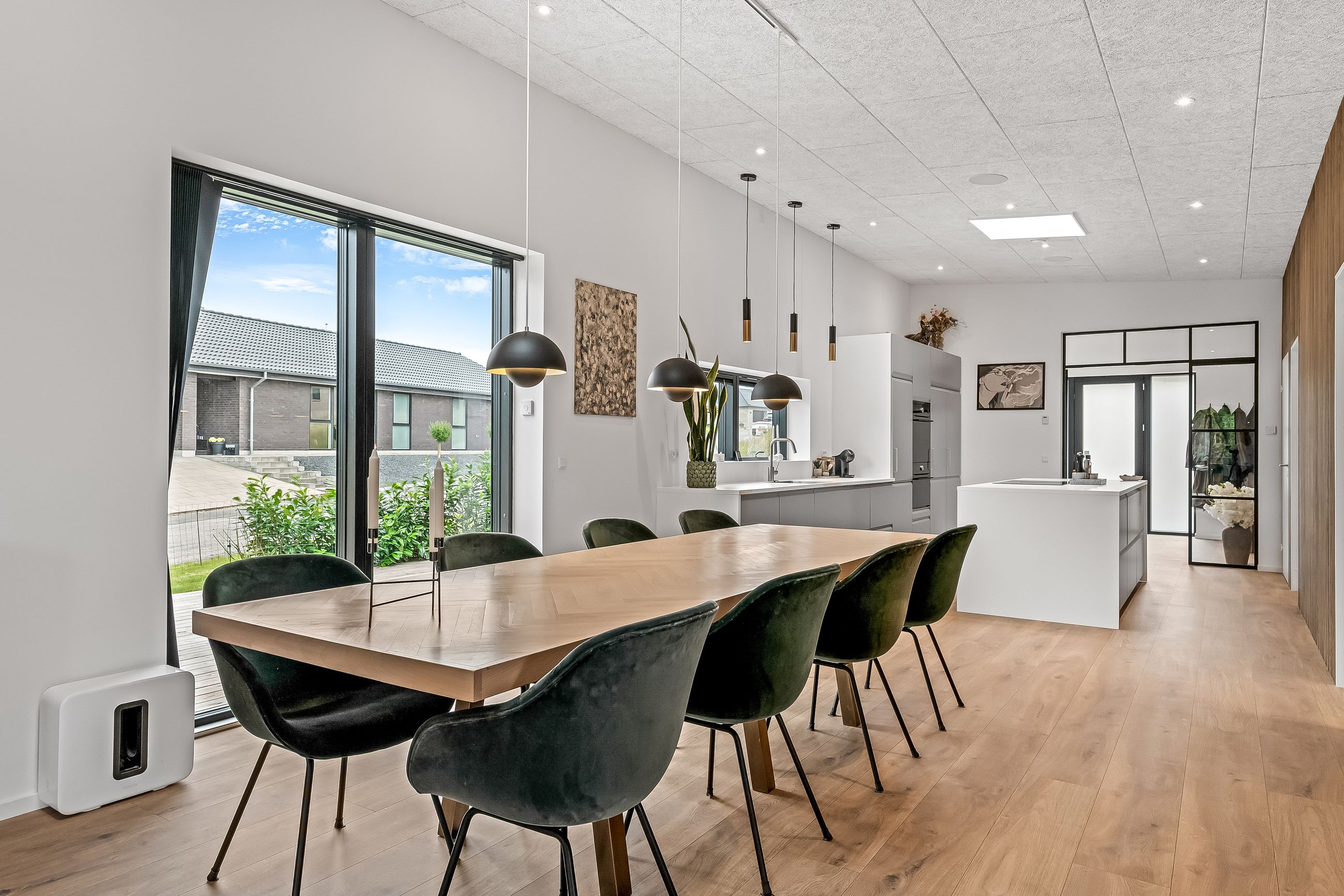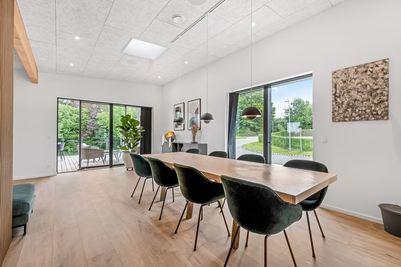 Fra Køkkenet er der spiseplads, og med en vinkel bliver overgangen til stuen defineret - også her i rummet er vinduespartierne en vigtig medspiller, da det giver masser af gennemgående lys fra begge sider.