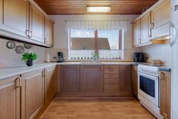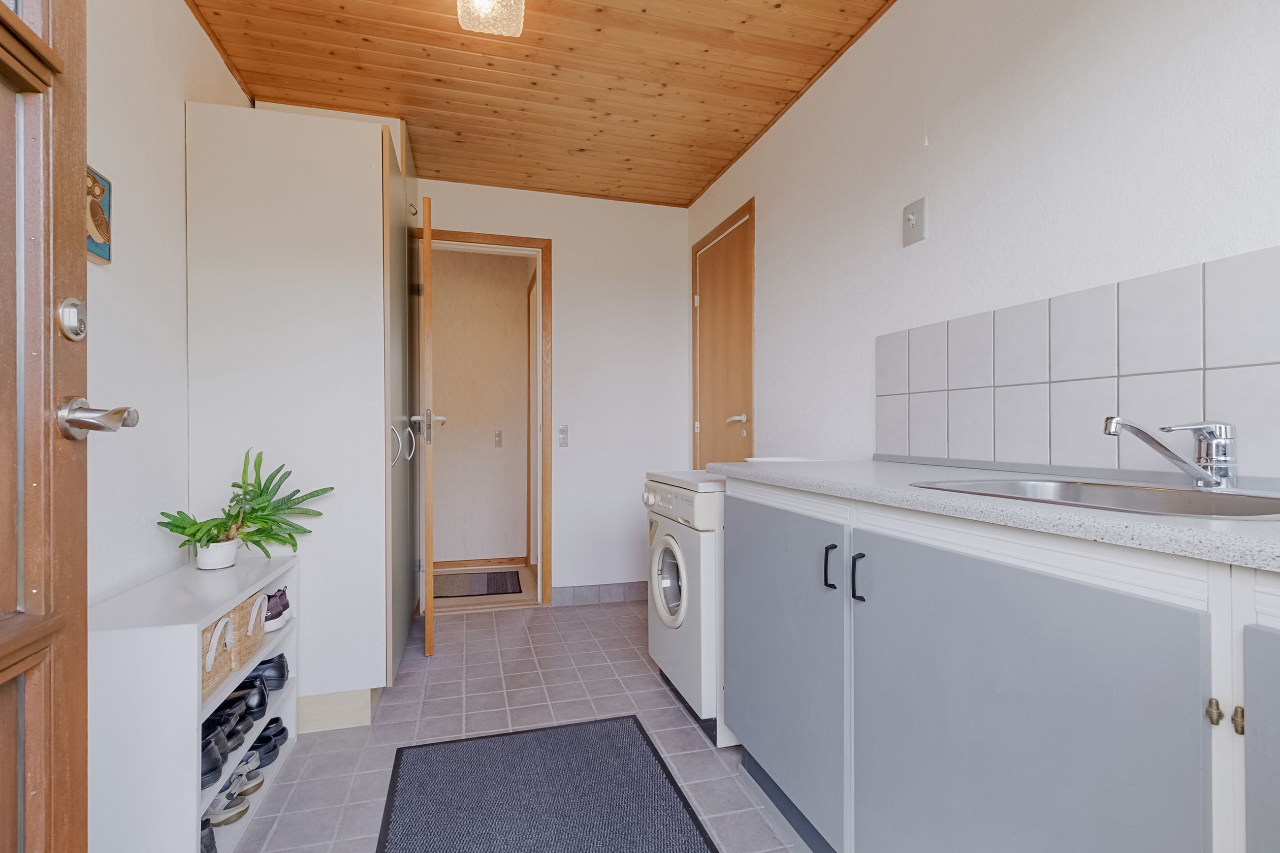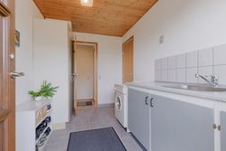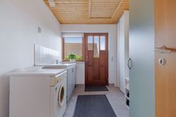 Bryggerset er praktisk med klinkegulv, der gør rengøringen nem, og byder på masser af skabsplads samt plads til vaskemaskine. Her kan hverdagens opgaver klares enkelt og ubesværet.
