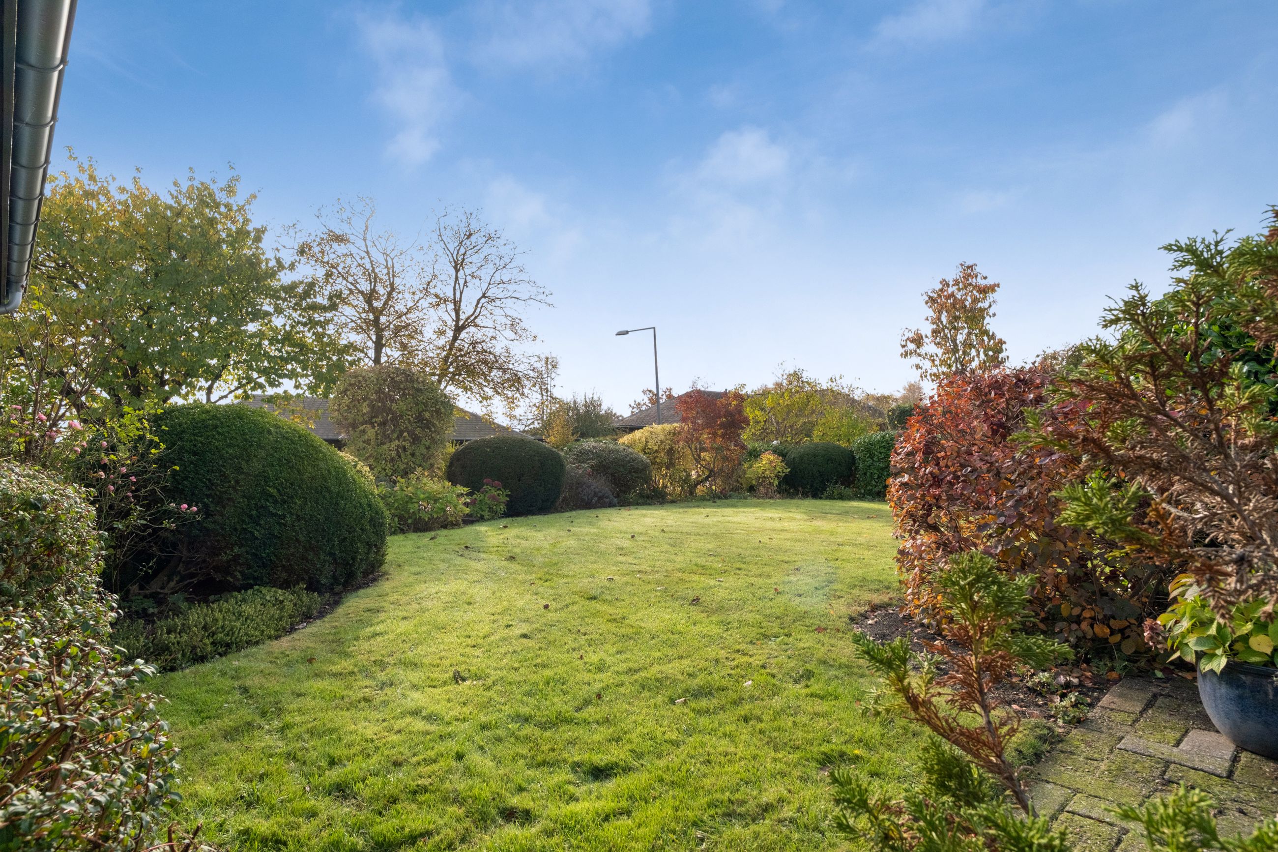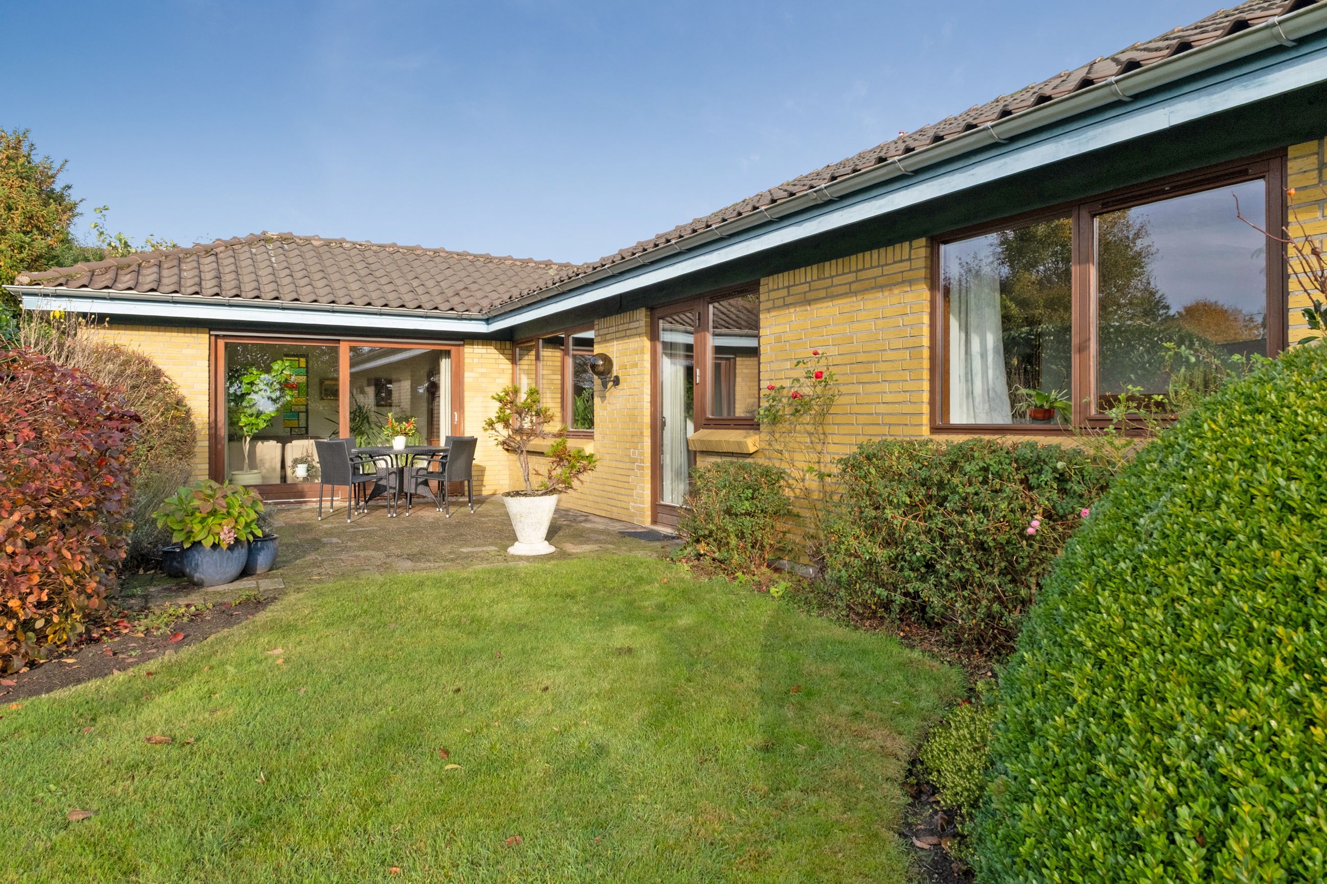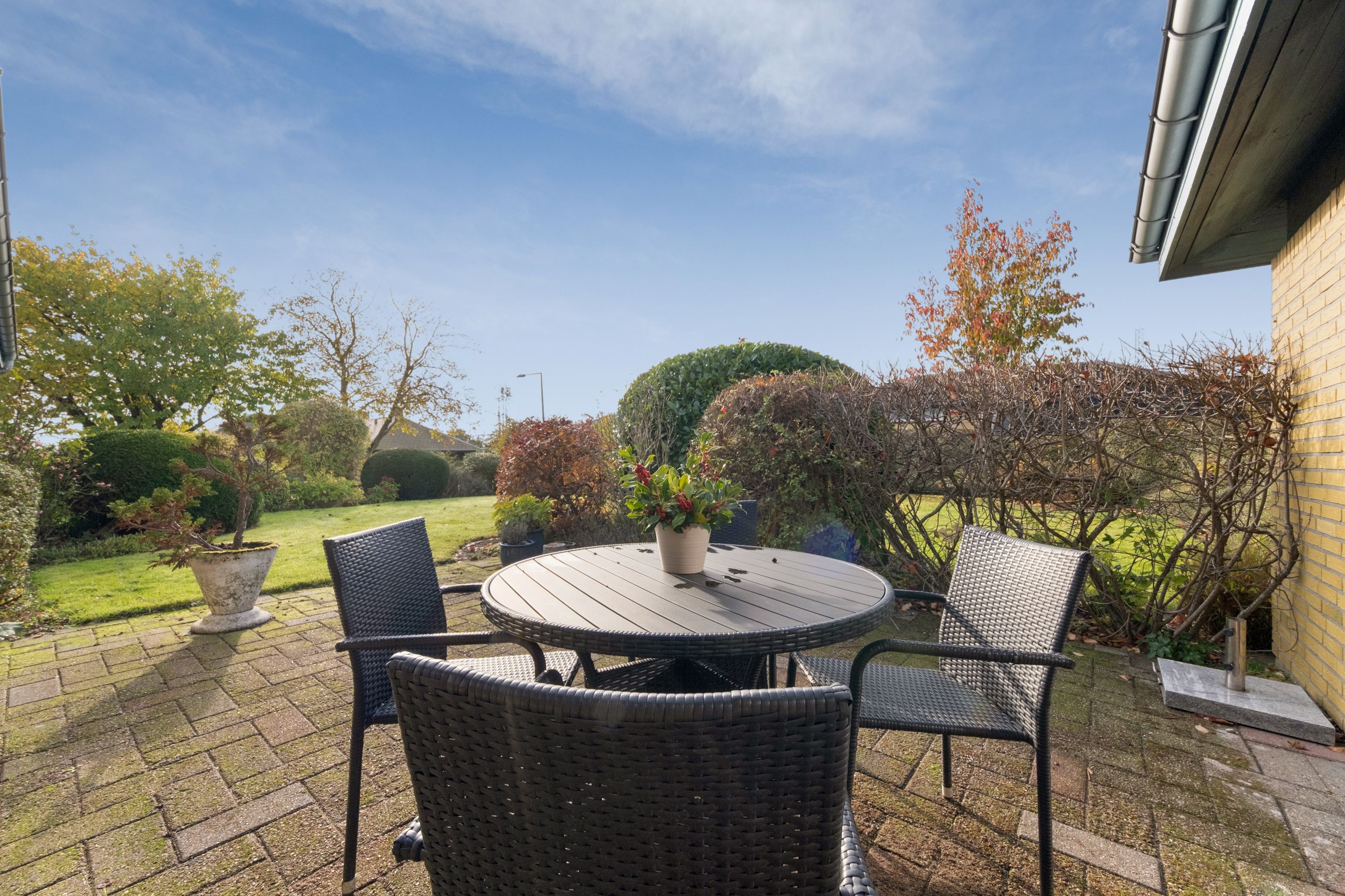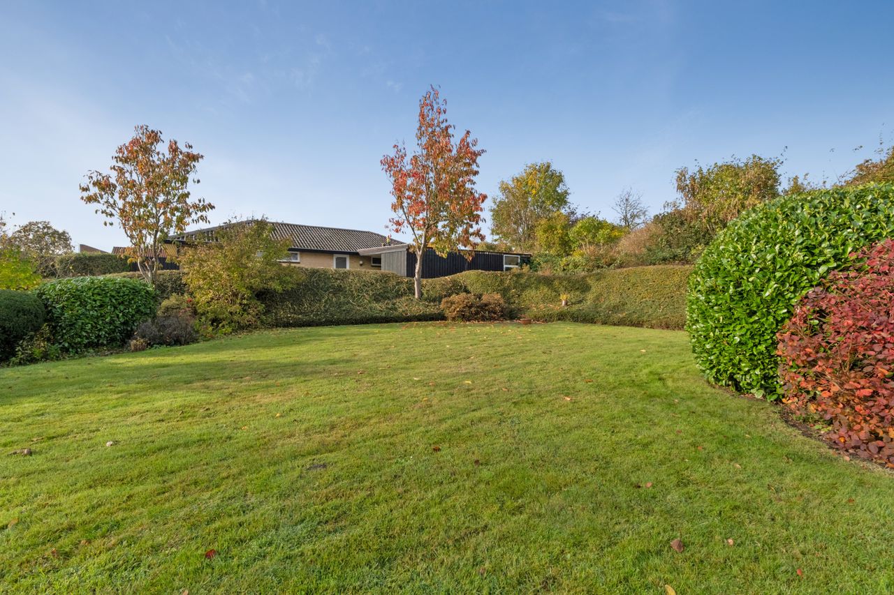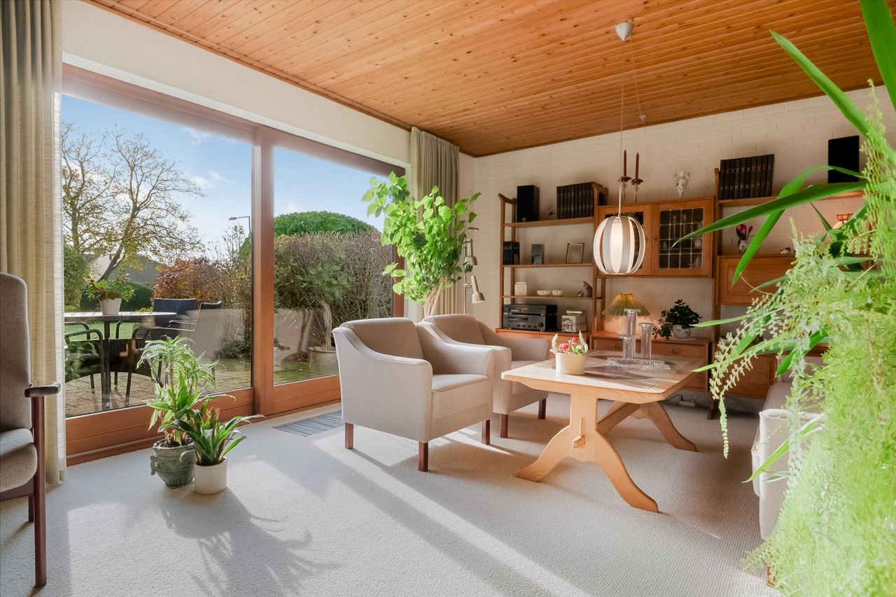 Stuen har direkte udgang til den solrige terrasse – et skønt uderum, der forlænger sommerdagene og inviterer til afslapning med en god bog. Her folder blomster og buske sig ud i farver, former og dufte – et oplagt sted at nyde roen og et glas, mens dagen går på hæld.