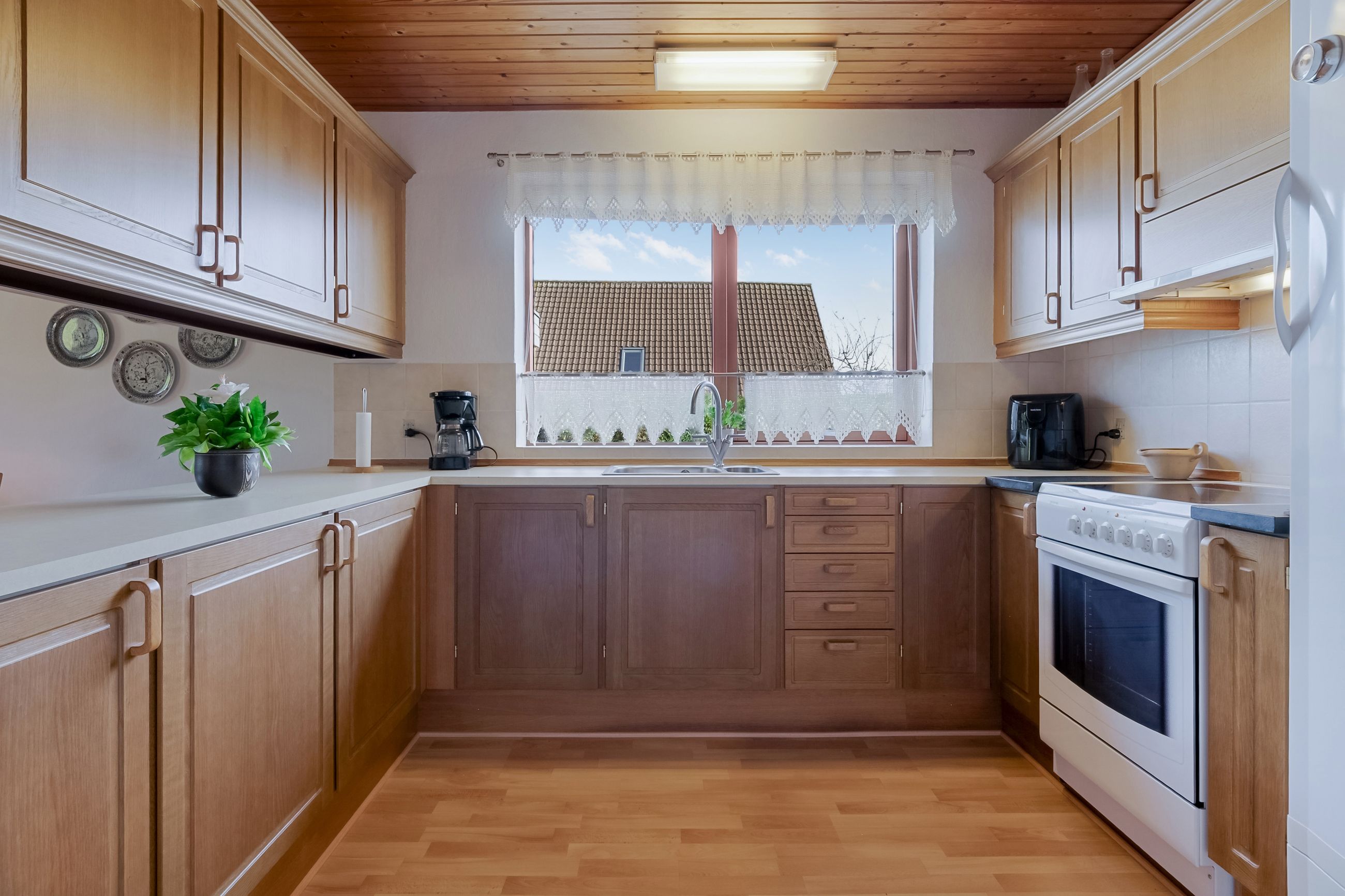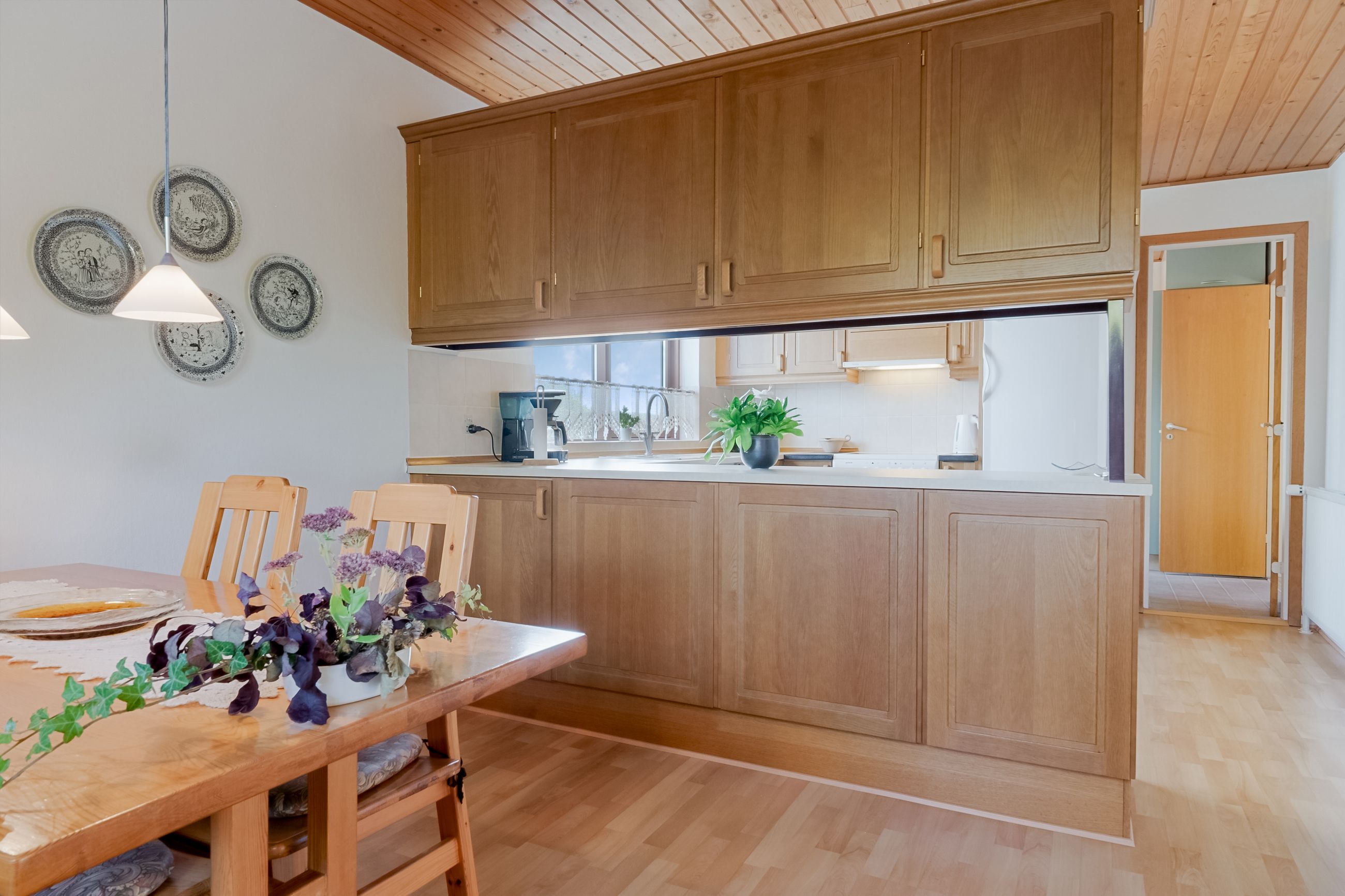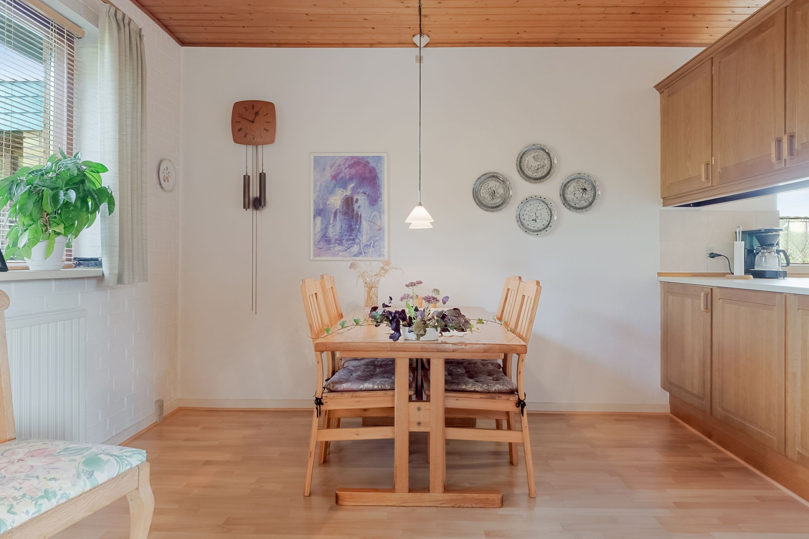 Fra bryggerset træder du ind i et charmerende køkken-alrum, hvor madlavning og samvær går hånd i hånd. Køkkenet har rigelig skabsplads, og de varme træfronter tilføjer hygge. Rummet giver plads til hverdagsliv med børn, der laver lektier, samtidig med at forældrene tilbereder mad – og til hyggelige aftener med gæster.