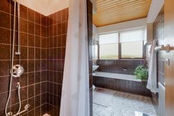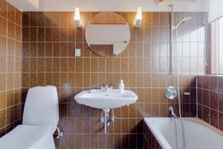 Badeværelset er charmerende med klassiske klinker og rummer både bruseniche og badekar. Det store vinduesparti lader et skønt naturligt lys strømme ind og skaber en behagelig atmosfære.