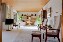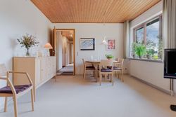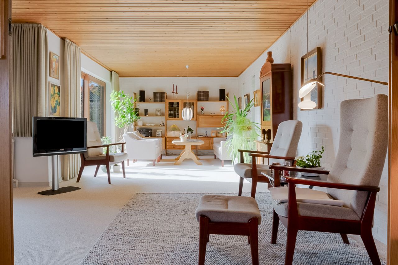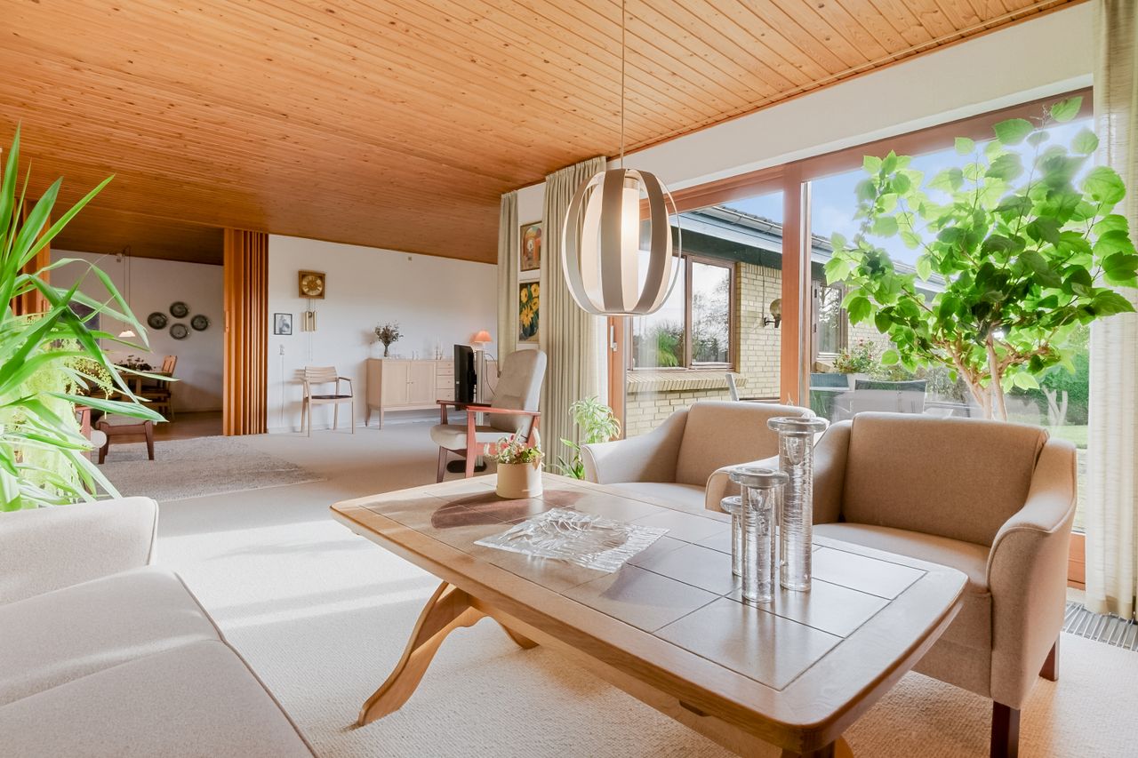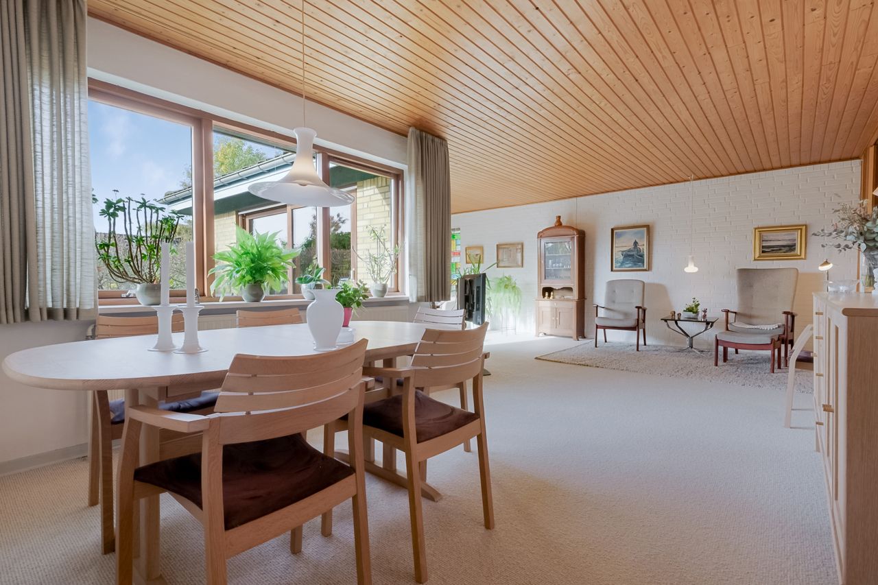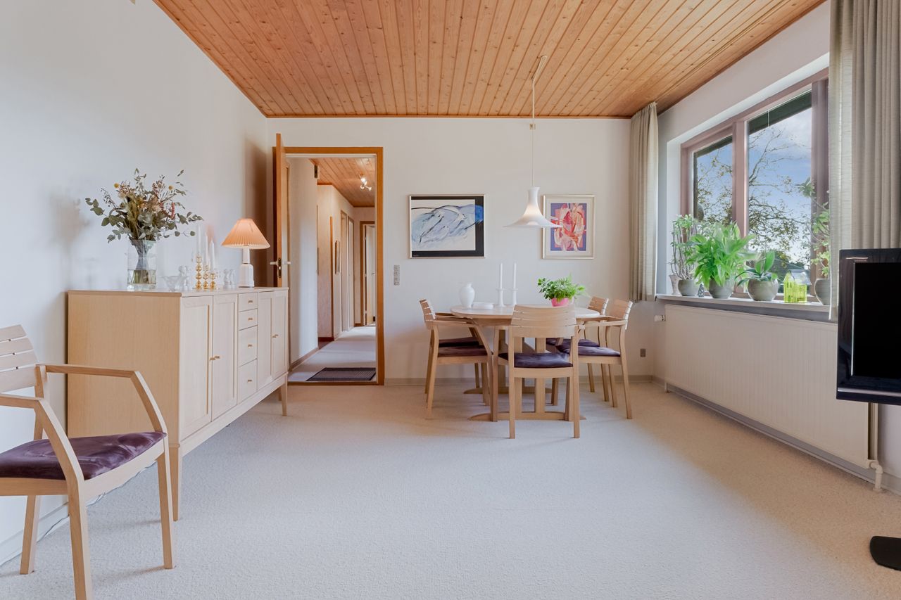 Fra spisestuen kan skydedørene åbnes, så rummet flyder sammen med stuen – et lyst og indbydende opholdsområde med store glaspartier. Her er plads til sofa og tv-hygge samt en mere formel spiseplads til særlige lejligheder. Det lyse gulvtæppe giver en hjemlig og rolig atmosfære.
