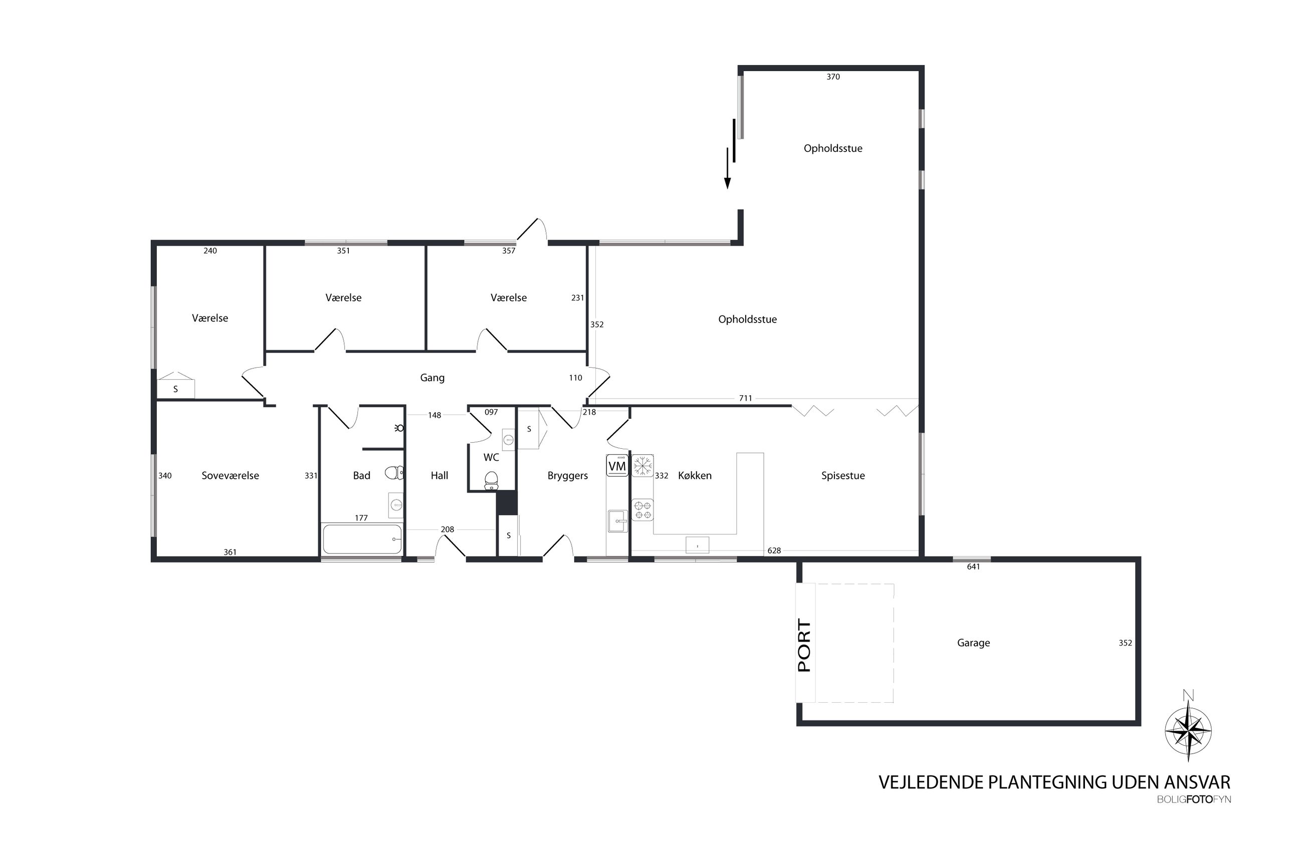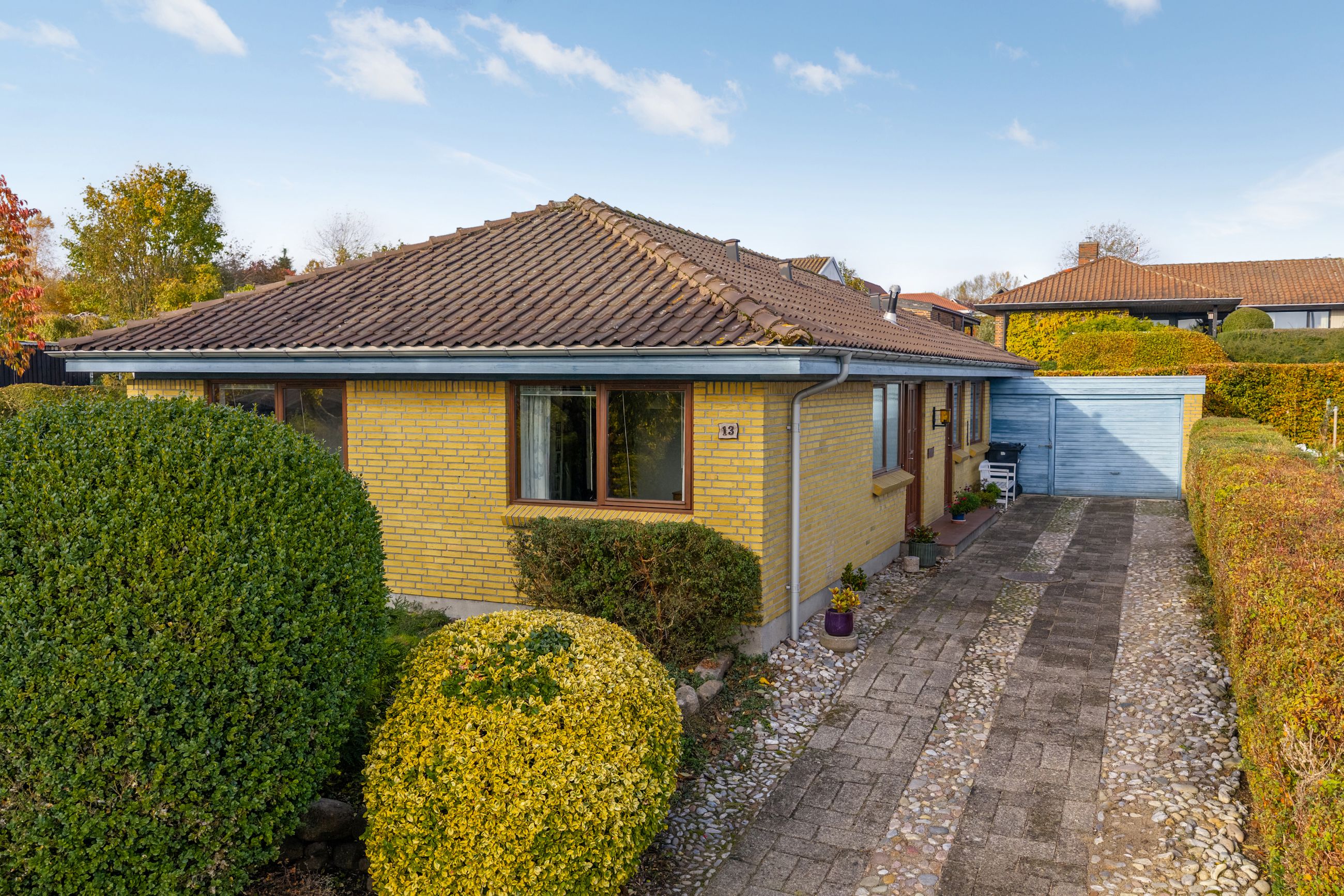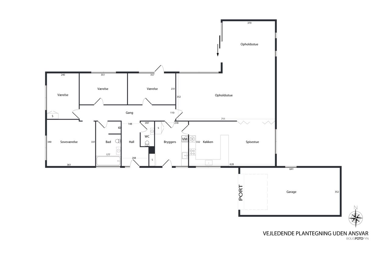 Ved ankomst til denne skønne ejendom har du mulighed for at parkere bilen i garagen, hvorfra der er nem adgang til boligens bryggers – en praktisk detalje, når tasker og indkøbsposer skal transporteres ind.